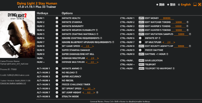 正文摘要:replyreload += ',' + 2363828;# 《消逝的光芒2:人與仁之戰》超強33功能修改器下載教學|完整版修改器全功能解析 ✦ 遊戲版本:v1.0-v1.19.1+ ✦ 更新日期:2024.11.9 ☑️ 修改器介紹 本次要介紹的是知名的《消逝的光芒2:人與仁之戰》FLiNG版修改器,支援最新版本,共提供33種實用功能,讓玩家能夠自由調整遊戲體驗。無論是想要輕鬆體驗劇情,還是需要額外支援,都能找到適合的功能。 ☑️ 修改器功能說明 【基礎功能】數字鍵 - Num 1:無限生命值 - Num 2:無限耐力 - Num 3:無限免疫力 - Num 4:武器無限耐久度 - Num 5:無限製作材料 - Num 6:忽略製作需求 - Num 7:忽略藍圖升級需求 - Num 8:遊戲速度調整 - Num 9:超級耐力傷害 - Num 0:一擊必殺模式 - Num .:傷害倍率調整 - Num +:防禦倍率調整 【進階功能】Alt+數字鍵 - Alt+Num 1:無限彈藥 - Alt+Num 2:無需重新裝彈 - Alt+Num 3:完美準度 - Alt+Num 4:無後座力 - Alt+Num 5:挑戰計時器凍結 - Alt+Num 6:調整衝刺速度 - Alt+Num 7:跳躍高度設定 - Alt+Num 8:隱身模式 【特殊功能】Ctrl+數字鍵 - Ctrl+Num 1:修改金錢 - Ctrl+Num 2:修改觀察者代幣 - Ctrl+Num 3:修改哈珀代幣 - Ctrl+Num 4:修改獵人代幣 - Ctrl+Num 5:修改突變樣本 - Ctrl+Num 6:無限經驗值 - Ctrl+Num 7:經驗值倍率 - Ctrl+Num 8:修改賞金獵人經驗值 - Ctrl+Num 9:凍結日夜循環 - Ctrl+Num 0:時間+1小時 - Ctrl+Num .:儲存位置 - Ctrl+Num +:傳送功能 - Ctrl+Num -:傳送至路標 ☑️ 下載連結 檔案名稱:Dying.Light.2.Stay.Human.v1.0-v1.19.1.Plus.33.Trainer-FLiNG.zip 所有站內附件皆會附上安全掃描報告請會員查看純淨度百分比後判斷使用(adsbygoogle = window.adsbygoogle || []).push({});相關檔案須知:取得檔案前,請先詳細閱讀文章內容避免不必要錯誤與誤會發生。也可多參考文章討論樓層內容了解附件檔案相關討論資訊。 【此文章部分內容隱藏中】 解除隱藏說明教學點擊下方 繼續閱讀文章 後請仔細觀看文章內容 並依照指示進行下一步最後完成解除隱藏後系統會回到此文章自動顯示隱藏內容~繼續閱讀 ☑️ 常見問題 Q&A Q1:修改器是否支援最新版本遊戲? A1:是的,本修改器支援 v1.0 至 v1.19.1+ 版本。 Q2:使用修改器會影響遊戲存檔嗎? A2:建議在使用修改器前先備份存檔,以確保遊戲體驗不受影響。 Q3:如何正確啟動修改器? A3:請先運行遊戲,待進入遊戲後再啟動修改器程式。 Q4:修改器快捷鍵無法使用怎麼辦? A4:請確認是否以管理員身份執行修改器,並檢查數字鍵盤是否開啟。 👉 GM後台版 遊戲 推薦 ⬇️⬇️⬇️ 快速玩各種二次元動漫手遊appreplyreload += ',' + 2363828; |