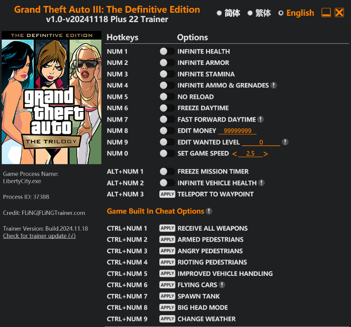 正文摘要:replyreload += ',' + 2364751; ☑️ 版本資訊 更新日期: 2024.11.18 遊戲版本: v1.0-v20241118+ 修改器版本: Plus 22 Trainer 修改器介紹 本修改器專為《俠盜獵車手:三部曲決定版》開發,提供22項強大功能,全面提升遊戲體驗。支援最新版本,操作簡單直觀。 功能列表 基礎功能(數字鍵): • Num 1 - 無限血量 • Num 2 - 無限護甲 • Num 3 - 無限耐力 • Num 4 - 無限彈藥與手榴彈 • Num 5 - 無需換彈 • Num 6 - 時間凍結 • Num 7 - 快進時間 • Num 8 - 修改金錢 • Num 9 - 修改通緝等級 • Num 0 - 調整遊戲速度 進階功能(Alt+數字鍵): • Alt+Num 1 - 任務計時器凍結 • Alt+Num 2 - 載具無限血量 • Alt+Num 3 - 傳送至標記點 遊戲內建功能(Ctrl+數字鍵): • Ctrl+Num 1 - 獲得所有武器 • Ctrl+Num 2 - 路人持械 • Ctrl+Num 3 - 路人暴怒 • Ctrl+Num 4 - 路人暴動 • Ctrl+Num 5 - 增強車輛操控 • Ctrl+Num 6 - 飛車模式 • Ctrl+Num 7 - 生成坦克 • Ctrl+Num 8 - 大頭模式 • Ctrl+Num 9 - 更改天氣 下載資訊 Free Download: GTA三部曲修改器 所有站內附件皆會附上安全掃描報告請會員查看純淨度百分比後判斷使用(adsbygoogle = window.adsbygoogle || []).push({});相關檔案須知:取得檔案前,請先詳細閱讀文章內容避免不必要錯誤與誤會發生。也可多參考文章討論樓層內容了解附件檔案相關討論資訊。 【此文章部分內容隱藏中】 解除隱藏說明教學點擊下方 繼續閱讀文章 後請仔細觀看文章內容 並依照指示進行下一步最後完成解除隱藏後系統會回到此文章自動顯示隱藏內容~繼續閱讀 安裝說明 1. 下載並解壓縮修改器檔案 2. 執行遊戲主程式 3. 運行修改器 4. 使用對應快捷鍵啟用功能 常見問題Q&A Q1: 為什麼修改器無法運作? A1: 請確認遊戲版本相符,並以管理員身分執行。 Q2: 使用修改器會影響遊戲存檔嗎? A2: 建議備份存檔,以防意外情況。 Q3: 如何關閉已啟用的功能? A3: 再次按下對應快捷鍵即可關閉。 Q4: 支援線上模式嗎? A4: 修改器僅支援單人模式,請勿在線上使用。 Q5: 遊戲更新後還能使用嗎? A5: 需等待修改器更新至對應版本。 👉 GM後台版 遊戲 推薦 ⬇️⬇️⬇️ 快速玩各種二次元動漫手遊appreplyreload += ',' + 2364751; |