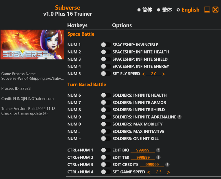 正文摘要:replyreload += ',' + 2364753; ☑️ 版本資訊 更新日期: 2024.11.18 遊戲版本: v1.0+ 修改器版本: Plus 16 Trainer 修改器介紹 專為《Subverse》設計的多功能修改器,完整支援太空戰鬥與回合制戰鬥兩大系統,提供16項強化功能。 功能列表 太空戰鬥系統: • Num 1 - 太空船:無敵模式 • Num 2 - 太空船:無限生命值 • Num 3 - 太空船:無限護盾 • Num 4 - 太空船:無限能源 • Num 5 - 設定飛行速度 回合制戰鬥系統: • Num 6 - 士兵:無限生命值 • Num 7 - 士兵:無限護甲 • Num 8 - 士兵:無限護盾 • Num 9 - 士兵:無限腎上腺素 • Num 0 - 士兵:最大移動力 • Num . - 士兵:最大先攻值 • Num + - 士兵:一擊必殺 資源修改: • Ctrl+Num 1 - 修改BIO值 • Ctrl+Num 2 - 修改TEK值 • Ctrl+Num 3 - 修改信用點數 • Ctrl+Num 4 - 調整遊戲速度 下載資訊 Free Download: Subverse修改器 所有站內附件皆會附上安全掃描報告請會員查看純淨度百分比後判斷使用(adsbygoogle = window.adsbygoogle || []).push({});相關檔案須知:取得檔案前,請先詳細閱讀文章內容避免不必要錯誤與誤會發生。也可多參考文章討論樓層內容了解附件檔案相關討論資訊。 【此文章部分內容隱藏中】 解除隱藏說明教學點擊下方 繼續閱讀文章 後請仔細觀看文章內容 並依照指示進行下一步最後完成解除隱藏後系統會回到此文章自動顯示隱藏內容~繼續閱讀 安裝步驟 1. 下載並解壓縮修改器 2. 執行遊戲本體 3. 運行修改器程式 4. 使用對應快捷鍵啟用功能 使用建議 • 建議在單人模式中使用 • 進行重要任務前先存檔 • 謹慎使用一擊必殺功能 • 注意遊戲版本相容性 常見問題Q&A Q1: 修改器會影響遊戲劇情進程嗎? A1: 不會,但建議適度使用以保持遊戲樂趣。 Q2: 如何關閉已開啟的功能? A2: 再次按下對應快捷鍵即可關閉。 Q3: 為什麼某些功能無法使用? A3: 請確認遊戲版本相符,並以管理員權限執行。 Q4: 使用修改器會影響存檔嗎? A4: 建議另存新檔,避免影響原有進度。 Q5: 更新遊戲後還能使用嗎? A5: 需確認修改器版本是否支援最新遊戲版本。 👉 GM後台版 遊戲 推薦 ⬇️⬇️⬇️ 快速玩各種二次元動漫手遊appreplyreload += ',' + 2364753; |