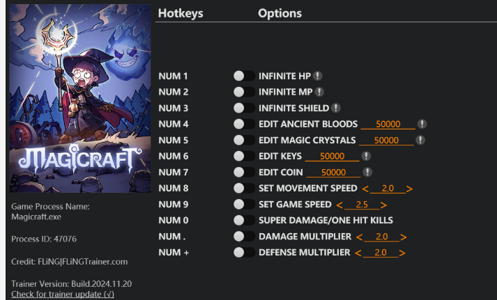 正文摘要:版本資訊:2024.11.20更新 ☑️ 修改器簡介 專為《魔法工藝》(Magicraft)開發的強力修改器,提供12項實用功能,幫助玩家在魔法世界中暢行無阻。 ☑️ 修改器介面預覽 ☑️ 功能清單 數字鍵功能: - 1:無限生命值 - 2:無限魔力值 - 3:無限護盾值 - 4:無限遠古之血 - 5:無限魔法水晶 - 6:無限鑰匙 - 7:無限金幣 - 8:移動速度調整 - 9:遊戲速度設定 - 0:超級傷害/一擊必殺 - .:傷害倍率調整 - +:防禦倍率調整 ☑️ 下載連結 Free Download: https://pixeldrain.com/u/xSs7qBsg 以下廣告滑動後還有帖子內容var custom_call_MIR = function (params) {if ( params === null || params.hasAd === false ) {var divRowSide;for (let index = 0; index < ONEADs.length; index++) {if (ONEADs[index].pub.player_mode === "mobile-inread") {divRowSide = ONEADs[index].pub.slotobj;}}var ins = document.createElement('ins');ins.className = 'clickforceads';ins.setAttribute('style', 'display:inline-block;');ins.setAttribute('data-ad-zone', '18264');divRowSide.appendChild(ins);var js = document.createElement('script');js.async = true;js.type = 'text/javascript';js.setAttribute('src', '//cdn.holmesmind.com/js/init.js');js.onload = function(){console.log('[ONEAD MIR] ClickForce Loaded');};divRowSide.appendChild(js);}};var _ONEAD = {};_ONEAD.pub = {};_ONEAD.pub.slotobj = document.getElementById("oneadMIRDFPTag");_ONEAD.pub.slots = ["div-onead-ad"];_ONEAD.pub.uid = "1000509";_ONEAD.pub.external_url = "https://onead.onevision.com.tw/";_ONEAD.pub.scopes = ["spotbuy", "speed"];_ONEAD.pub.player_mode_div = "div-onead-ad";_ONEAD.pub.player_mode = "mobile-inread";_ONEAD.pub.queryAdCallback = custom_call_MIR;var ONEAD_pubs = ONEAD_pubs || [];ONEAD_pubs.push(_ONEAD);var truvidScript = document.createElement('script'); truvidScript.async = true; truvidScript.setAttribute('data-cfasync','false'); truvidScript.type = 'text/javascript'; truvidScript.src = '//stg.truvidplayer.com/index.php?sub_user_id=597&widget_id=3309&playlist_id=2381&m=a&cb=' + (Math.random() * 10000000000000000); var currentScript = document.currentScript || document.scripts[document.scripts.length - 1]; currentScript.parentNode.insertBefore(truvidScript, currentScript.nextSibling); ☑️ 常見問題Q&A Q1:修改器支援哪些版本? A1:支援Early Access搶先體驗版本,定期更新維護。 Q2:如何正確使用資源修改功能? A2:建議先體驗原始遊戲,再依需求適度使用修改功能。 Q3:修改器會影響多人遊戲嗎? A3:建議僅在單機模式下使用,避免影響他人遊戲體驗。 Q4:為什麼部分功能無效? A4:請確認是否以管理員身分執行,並關閉防毒軟體。 Q5:使用修改器會影響存檔嗎? A5:建議另存新檔使用修改器,以保留原始遊戲進度。 👉 GM後台版 遊戲 推薦 ⬇️⬇️⬇️ 快速玩各種二次元動漫手遊app |