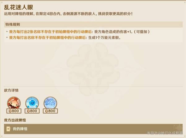 正文摘要:▶ 《原神》5.2版本鑄境研練關卡三通關指南 本攻略將詳細說明如何在「亂花迷人眼」關卡中獲得滿額獎勵。 👉 GM後台版 遊戲 推薦 ⬇️⬇️⬇️ 快速玩各種二次元動漫手遊app 卡組配置 推薦角色: - 閑雲 - 卡維 - 吞天之鯨 4. 最後切換回閑雲 以下廣告滑動後還有帖子內容var custom_call_MIR = function (params) {if ( params === null || params.hasAd === false ) {var divRowSide;for (let index = 0; index < ONEADs.length; index++) {if (ONEADs[index].pub.player_mode === "mobile-inread") {divRowSide = ONEADs[index].pub.slotobj;}}var ins = document.createElement('ins');ins.className = 'clickforceads';ins.setAttribute('style', 'display:inline-block;');ins.setAttribute('data-ad-zone', '18264');divRowSide.appendChild(ins);var js = document.createElement('script');js.async = true;js.type = 'text/javascript';js.setAttribute('src', '//cdn.holmesmind.com/js/init.js');js.onload = function(){console.log('[ONEAD MIR] ClickForce Loaded');};divRowSide.appendChild(js);}};var _ONEAD = {};_ONEAD.pub = {};_ONEAD.pub.slotobj = document.getElementById("oneadMIRDFPTag");_ONEAD.pub.slots = ["div-onead-ad"];_ONEAD.pub.uid = "1000509";_ONEAD.pub.external_url = "https://onead.onevision.com.tw/";_ONEAD.pub.scopes = ["spotbuy", "speed"];_ONEAD.pub.player_mode_div = "div-onead-ad";_ONEAD.pub.player_mode = "mobile-inread";_ONEAD.pub.queryAdCallback = custom_call_MIR;var ONEAD_pubs = ONEAD_pubs || [];ONEAD_pubs.push(_ONEAD);var truvidScript = document.createElement('script'); truvidScript.async = true; truvidScript.setAttribute('data-cfasync','false'); truvidScript.type = 'text/javascript'; truvidScript.src = '//stg.truvidplayer.com/index.php?sub_user_id=597&widget_id=3309&playlist_id=2381&m=a&cb=' + (Math.random() * 10000000000000000); var currentScript = document.currentScript || document.scripts[document.scripts.length - 1]; currentScript.parentNode.insertBefore(truvidScript, currentScript.nextSibling); 常見問題Q&A Q1:為什麼要保持鯨魚殘影次數大於10? A1:確保大招效果最大化,達到滿分要求。 Q2:第二回合為何要燒掉至少6張牌? A2:為了配合後續回合的技能連携和傷害輸出。 Q3:骰子的選擇順序重要嗎? A3:是的,需按照攻略順序準備對應元素骰子。 Q4:角色出場順序能調整嗎? A4:建議按照攻略順序,以確保技能效果最大化。 Q5:如何確保燒牌數量足夠? A5:注意統計每回合燒牌數量,包括技能和手動燒牌。 回合主要操作所需骰子第一回合閑雲E+卡維E風骰+草骰第二回合卡維E+鯨魚E草骰+水骰第三回合鯨魚E+大招水骰第四回合閑雲E+卡維大招風骰+草骰 |