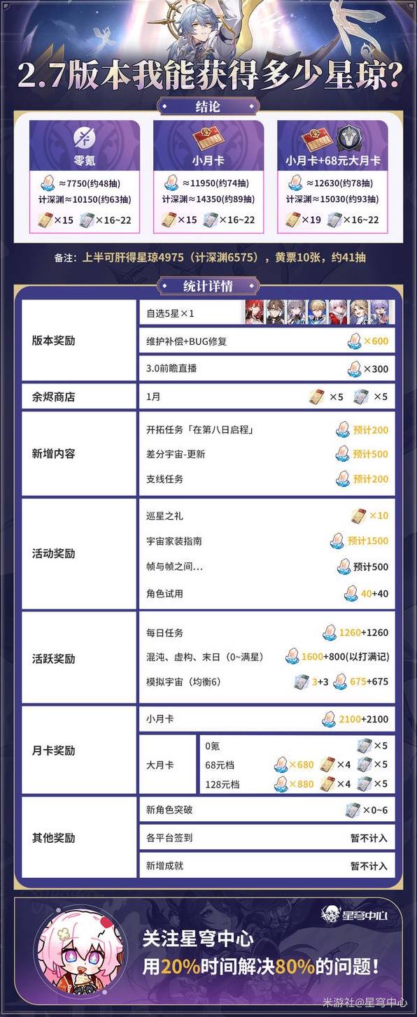 正文摘要:▶《崩壞星穹鐵道》2.7版本星瓊收入統計 想知道在2.7版本能獲得多少抽卡資源嗎?讓我們來看看詳細的星瓊獲取統計! 👉 GM後台版 遊戲 推薦 ⬇️⬇️⬇️ 快速玩各種二次元動漫手遊app 星瓊獲取途徑 1. 每日常規收入 - 每日任務 - 委託獎勵 - 模擬宇宙 2. 版本活動獎勵 - 主線任務 - 限時活動 - 特殊獎勵 3. 固定收入來源 - 深淵 - 戰場 - 簽到獎勵 以下廣告滑動後還有帖子內容var custom_call_MIR = function (params) {if ( params === null || params.hasAd === false ) {var divRowSide;for (let index = 0; index < ONEADs.length; index++) {if (ONEADs[index].pub.player_mode === "mobile-inread") {divRowSide = ONEADs[index].pub.slotobj;}}var ins = document.createElement('ins');ins.className = 'clickforceads';ins.setAttribute('style', 'display:inline-block;');ins.setAttribute('data-ad-zone', '18264');divRowSide.appendChild(ins);var js = document.createElement('script');js.async = true;js.type = 'text/javascript';js.setAttribute('src', '//cdn.holmesmind.com/js/init.js');js.onload = function(){console.log('[ONEAD MIR] ClickForce Loaded');};divRowSide.appendChild(js);}};var _ONEAD = {};_ONEAD.pub = {};_ONEAD.pub.slotobj = document.getElementById("oneadMIRDFPTag");_ONEAD.pub.slots = ["div-onead-ad"];_ONEAD.pub.uid = "1000509";_ONEAD.pub.external_url = "https://onead.onevision.com.tw/";_ONEAD.pub.scopes = ["spotbuy", "speed"];_ONEAD.pub.player_mode_div = "div-onead-ad";_ONEAD.pub.player_mode = "mobile-inread";_ONEAD.pub.queryAdCallback = custom_call_MIR;var ONEAD_pubs = ONEAD_pubs || [];ONEAD_pubs.push(_ONEAD);var truvidScript = document.createElement('script'); truvidScript.async = true; truvidScript.setAttribute('data-cfasync','false'); truvidScript.type = 'text/javascript'; truvidScript.src = '//stg.truvidplayer.com/index.php?sub_user_id=597&widget_id=3309&playlist_id=2381&m=a&cb=' + (Math.random() * 10000000000000000); var currentScript = document.currentScript || document.scripts[document.scripts.length - 1]; currentScript.parentNode.insertBefore(truvidScript, currentScript.nextSibling); 星瓊收入對照表 獲取方式數量估算難度評級每日任務參考圖表★☆☆☆☆活動獎勵參考圖表★★★☆☆深淵戰場參考圖表★★★★☆其他收入參考圖表★★☆☆☆ 常見問題Q&A Q1:能保證抽到新角色嗎? A1:需要根據獎勵總量和保底機制計算。 Q2:日常任務要全做嗎? A2:建議每日完成以最大化收益。 Q3:活動獎勵會過期嗎? A3:需在活動期間內完成領取。 Q4:深淵獎勵如何最大化? A4:盡可能達到更高層數。 Q5:如何規劃抽卡? A5:建議根據總收入提前做好規劃。 |