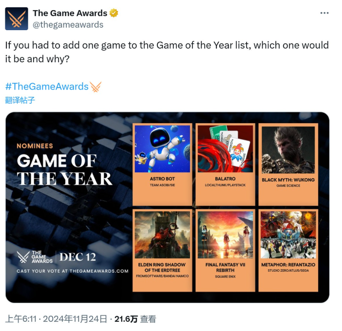 正文摘要:《TGA 2024》官方拋出震撼彈!年度遊戲提名再加一款?玩家熱議推薦清單大公開 TGA官方發起熱議討論 TGA官方近期在社群平台上發起了一個特別的討論:「如果在年度遊戲提名名單中再加入一款遊戲,你會選擇哪一款?」此舉引發了全球玩家熱烈討論。 目前已入圍年度遊戲提名名單 - 宇宙機器人(Stellar Blade) - 小丑牌(Joker) - 黑神話:悟空 - 艾爾登法環:黃金樹之影 - 最終幻想7:重生 - 暗喻幻想:ReFantazio 以下廣告滑動後還有帖子內容var custom_call_MIR = function (params) {if ( params === null || params.hasAd === false ) {var divRowSide;for (let index = 0; index < ONEADs.length; index++) {if (ONEADs[index].pub.player_mode === "mobile-inread") {divRowSide = ONEADs[index].pub.slotobj;}}var ins = document.createElement('ins');ins.className = 'clickforceads';ins.setAttribute('style', 'display:inline-block;');ins.setAttribute('data-ad-zone', '18264');divRowSide.appendChild(ins);var js = document.createElement('script');js.async = true;js.type = 'text/javascript';js.setAttribute('src', '//cdn.holmesmind.com/js/init.js');js.onload = function(){console.log('[ONEAD MIR] ClickForce Loaded');};divRowSide.appendChild(js);}};var _ONEAD = {};_ONEAD.pub = {};_ONEAD.pub.slotobj = document.getElementById("oneadMIRDFPTag");_ONEAD.pub.slots = ["div-onead-ad"];_ONEAD.pub.uid = "1000509";_ONEAD.pub.external_url = "https://onead.onevision.com.tw/";_ONEAD.pub.scopes = ["spotbuy", "speed"];_ONEAD.pub.player_mode_div = "div-onead-ad";_ONEAD.pub.player_mode = "mobile-inread";_ONEAD.pub.queryAdCallback = custom_call_MIR;var ONEAD_pubs = ONEAD_pubs || [];ONEAD_pubs.push(_ONEAD);var truvidScript = document.createElement('script'); truvidScript.async = true; truvidScript.setAttribute('data-cfasync','false'); truvidScript.type = 'text/javascript'; truvidScript.src = '//stg.truvidplayer.com/index.php?sub_user_id=597&widget_id=3309&playlist_id=2381&m=a&cb=' + (Math.random() * 10000000000000000); var currentScript = document.currentScript || document.scripts[document.scripts.length - 1]; currentScript.parentNode.insertBefore(truvidScript, currentScript.nextSibling); 常見問題Q&A Q1:TGA年度遊戲評選標準是什麼? A:評選標準包含遊戲創新性、技術表現、玩家口碑等多個面向。 Q2:為什麼艾爾登法環DLC也能入圍? A:TGA允許大型DLC內容參與評選,但這也引發了不少討論。 Q3:玩家推薦的遊戲是否有機會被加入? A:TGA官方尚未表明是否會根據此次討論調整提名名單。 Q4:什麼時候會公布最終獲獎名單? A:TGA 2024頒獎典禮預計將在年底舉行。 Q5:如何參與TGA的投票? A:玩家可以通過TGA官方網站進行投票。 👉 GM後台版 遊戲 推薦 ⬇️⬇️⬇️ 快速玩各種二次元動漫手遊app |