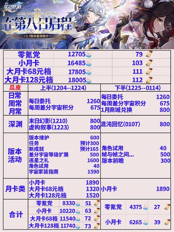 正文摘要:▶《崩壞星穹鐵道》2.7版本星瓊獲取攻略與抽卡規劃指南 本文將詳細分析2.7版本中各個途徑可獲得的星瓊數量,幫助玩家合理規劃抽卡資源。 常駐玩法獎勵分析 總計可獲得4670星瓊: - 每日委託:2520星瓊 - 每週差分宇宙:1350星瓊 - 商城兌換(一月):800星瓊 👉 GM後台版 遊戲 推薦 ⬇️⬇️⬇️ 快速玩各種二次元動漫手遊app 版本活動獎勵 深淵類玩法:2400星瓊 - 末日幻影 - 虛構敘事 - 混沌回憶 主要版本活動: - 宇宙家裝指南:1590星瓊(限時1200+常駐390) - 幀與幀之間:500星瓊 額外獎勵統計 固定獎勵: - 版本更新補償:600星瓊 - 任務成就:465星瓊 - 差分宇宙擴展:500星瓊 - 角色試用:80星瓊 - 巡星之禮:1600星瓊 - 版本前瞻:300星瓊 以下廣告滑動後還有帖子內容var custom_call_MIR = function (params) {if ( params === null || params.hasAd === false ) {var divRowSide;for (let index = 0; index < ONEADs.length; index++) {if (ONEADs[index].pub.player_mode === "mobile-inread") {divRowSide = ONEADs[index].pub.slotobj;}}var ins = document.createElement('ins');ins.className = 'clickforceads';ins.setAttribute('style', 'display:inline-block;');ins.setAttribute('data-ad-zone', '18264');divRowSide.appendChild(ins);var js = document.createElement('script');js.async = true;js.type = 'text/javascript';js.setAttribute('src', '//cdn.holmesmind.com/js/init.js');js.onload = function(){console.log('[ONEAD MIR] ClickForce Loaded');};divRowSide.appendChild(js);}};var _ONEAD = {};_ONEAD.pub = {};_ONEAD.pub.slotobj = document.getElementById("oneadMIRDFPTag");_ONEAD.pub.slots = ["div-onead-ad"];_ONEAD.pub.uid = "1000509";_ONEAD.pub.external_url = "https://onead.onevision.com.tw/";_ONEAD.pub.scopes = ["spotbuy", "speed"];_ONEAD.pub.player_mode_div = "div-onead-ad";_ONEAD.pub.player_mode = "mobile-inread";_ONEAD.pub.queryAdCallback = custom_call_MIR;var ONEAD_pubs = ONEAD_pubs || [];ONEAD_pubs.push(_ONEAD);var truvidScript = document.createElement('script'); truvidScript.async = true; truvidScript.setAttribute('data-cfasync','false'); truvidScript.type = 'text/javascript'; truvidScript.src = '//stg.truvidplayer.com/index.php?sub_user_id=597&widget_id=3309&playlist_id=2381&m=a&cb=' + (Math.random() * 10000000000000000); var currentScript = document.currentScript || document.scripts[document.scripts.length - 1]; currentScript.parentNode.insertBefore(truvidScript, currentScript.nextSibling); 月卡收益統計 不同月卡組合: - 小月卡:3780星瓊 - 大月卡:1320星瓊 - 大大月卡:1520星瓊 常見問題Q&A Q1:零氪玩家2.7版本能抽多少次? A1:預計可獲得12705星瓊,約合79抽。 Q2:買小月卡能多抽多少? A2:小月卡玩家可得16485星瓊,約合103抽。 Q3:平台活動獎勵算在內了嗎? A3:未計入米遊社、微博等平台簽到獎勵。 Q4:如何最大化星瓊獲取? A4:建議完整參與所有活動內容,不要錯過任何獎勵。 Q5:月卡之間如何選擇? A5:可根據個人預算選擇,小月卡性價比最高。 不同玩家獲取統計表 玩家類型星瓊數量抽卡次數零氪玩家1270579抽小月卡16485103抽大小月卡17805111抽全月卡18005112抽 |