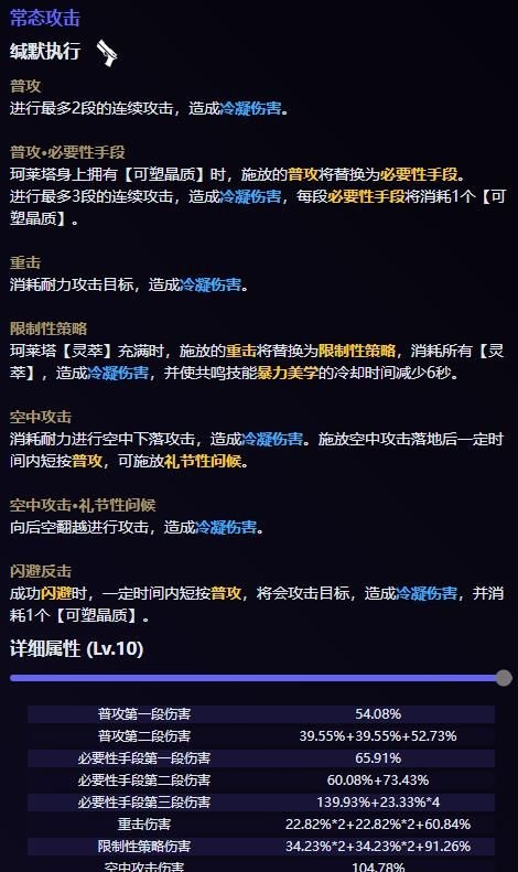正文摘要:《鳴潮》冰槍角色珂萊塔技能機制與連招體系全解析 普通攻擊系統 珂萊塔的基礎攻擊系統包含多重技能變化: 普通攻擊模式: - 基礎模式:2段連續冷凝傷害 - 必要性手段模式:擁有可塑晶質時轉換為3段攻擊,每段消耗1個可塑晶質 👉 GM後台版 遊戲 推薦 ⬇️⬇️⬇️ 快速玩各種二次元動漫手遊app 重擊與空中技能 重擊系統: - 基礎重擊:消耗耐力造成冷凝傷害 - 限制性策略:靈萃充滿時替換,可減少暴力美學冷卻時間 特殊能量系統 靈萃機制: - 上限120點 - 入冬嘆調獲得30點 - 示我璀璨每消耗1顆可塑晶質獲得10點 可塑晶質獲取: - 上限6顆 - 多種技能可獲得3個晶質 - 用於增強普通攻擊和特殊技能 以下廣告滑動後還有帖子內容var custom_call_MIR = function (params) {if ( params === null || params.hasAd === false ) {var divRowSide;for (let index = 0; index < ONEADs.length; index++) {if (ONEADs[index].pub.player_mode === "mobile-inread") {divRowSide = ONEADs[index].pub.slotobj;}}var ins = document.createElement('ins');ins.className = 'clickforceads';ins.setAttribute('style', 'display:inline-block;');ins.setAttribute('data-ad-zone', '18264');divRowSide.appendChild(ins);var js = document.createElement('script');js.async = true;js.type = 'text/javascript';js.setAttribute('src', '//cdn.holmesmind.com/js/init.js');js.onload = function(){console.log('[ONEAD MIR] ClickForce Loaded');};divRowSide.appendChild(js);}};var _ONEAD = {};_ONEAD.pub = {};_ONEAD.pub.slotobj = document.getElementById("oneadMIRDFPTag");_ONEAD.pub.slots = ["div-onead-ad"];_ONEAD.pub.uid = "1000509";_ONEAD.pub.external_url = "https://onead.onevision.com.tw/";_ONEAD.pub.scopes = ["spotbuy", "speed"];_ONEAD.pub.player_mode_div = "div-onead-ad";_ONEAD.pub.player_mode = "mobile-inread";_ONEAD.pub.queryAdCallback = custom_call_MIR;var ONEAD_pubs = ONEAD_pubs || [];ONEAD_pubs.push(_ONEAD);var truvidScript = document.createElement('script'); truvidScript.async = true; truvidScript.setAttribute('data-cfasync','false'); truvidScript.type = 'text/javascript'; truvidScript.src = '//stg.truvidplayer.com/index.php?sub_user_id=597&widget_id=3309&playlist_id=2381&m=a&cb=' + (Math.random() * 10000000000000000); var currentScript = document.currentScript || document.scripts[document.scripts.length - 1]; currentScript.parentNode.insertBefore(truvidScript, currentScript.nextSibling); 數值效果對比表 技能類型傷害效果特殊效果普通攻擊雙段/三段冷凝傷害暴力美學高倍率附加變彩示我璀璨消耗性特殊增益 常見問題Q&A Q1:如何最大化靈萃獲取? A:注意使用入冬嘆調和示我璀璨的配合。 Q2:可塑晶質應該如何分配? A:建議優先保留用於必要性手段的強化。 Q3:重擊系統如何選擇? A:根據靈萃存量選擇普通重擊或限制性策略。 Q4:空中連招要點是什麼? A:注意落地後的禮節性問候時機。 Q5:變彩效果的最佳運用? A:配合示我璀璨打出高額傷害。 |