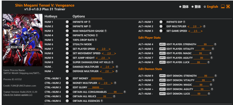 正文摘要:replyreload += ',' + 2368168; 版本:v1.0-v1.0.3+ ▶ 修改器介面預覽 ▶ 主要功能列表 基礎功能(數字鍵) ✦ Num 1-4:無限HP、MP、咒力槽、行動次數 ✦ Num 5-6:100%掉落率、隱身模式 ✦ Num 7-9:角色速度、移動速度、跳躍高度調整 ✦ Num 0/.+:一擊必殺、傷害倍率、防禦倍率 物品功能(Ctrl+數字鍵) ✦ 金錢/榮耀值修改 ✦ 獲得所有消耗品 ✦ 獲得所有聖遺物 ✦ 獲得所有精髓 能力與經驗值(Alt+數字鍵) ✦ 無限經驗值/經驗值倍率 ✦ 遊戲速度調整 ✦ 主角能力值修改: - 力量、體力、魔力 - 敏捷、幸運 ✦ 惡魔能力值修改: - 力量、體力、魔力 - 敏捷、幸運 ▶ 下載連結 🔽 主要載點: 所有站內附件皆會附上安全掃描報告請會員查看純淨度百分比後判斷使用(adsbygoogle = window.adsbygoogle || []).push({});相關檔案須知:取得檔案前,請先詳細閱讀文章內容避免不必要錯誤與誤會發生。也可多參考文章討論樓層內容了解附件檔案相關討論資訊。 【此文章部分內容隱藏中】 解除隱藏說明教學點擊下方 繼續閱讀文章 後請仔細觀看文章內容 並依照指示進行下一步最後完成解除隱藏後系統會回到此文章自動顯示隱藏內容~繼續閱讀 ▶ 常見問題Q&A Q1:修改器支援哪些遊戲版本? A1:支援v1.0-v1.0.3+版本,建議更新至最新版本使用。 Q2:修改惡魔能力值會有問題嗎? A2:建議適度修改,過度提升可能影響遊戲平衡。 Q3:為什麼有些功能無法使用? A3:請確認是否以管理員權限執行,並檢查遊戲版本相容性。 Q4:使用修改器會影響存檔嗎? A4:建議另外保存一份存檔備份,以防止資料損壞。 Q5:可以在線上模式使用嗎? A5:為確保遊戲體驗,建議僅在離線模式下使用修改器。 👉 GM後台版 遊戲 推薦 ⬇️⬇️⬇️ 快速玩各種二次元動漫手遊appreplyreload += ',' + 2368168; |
