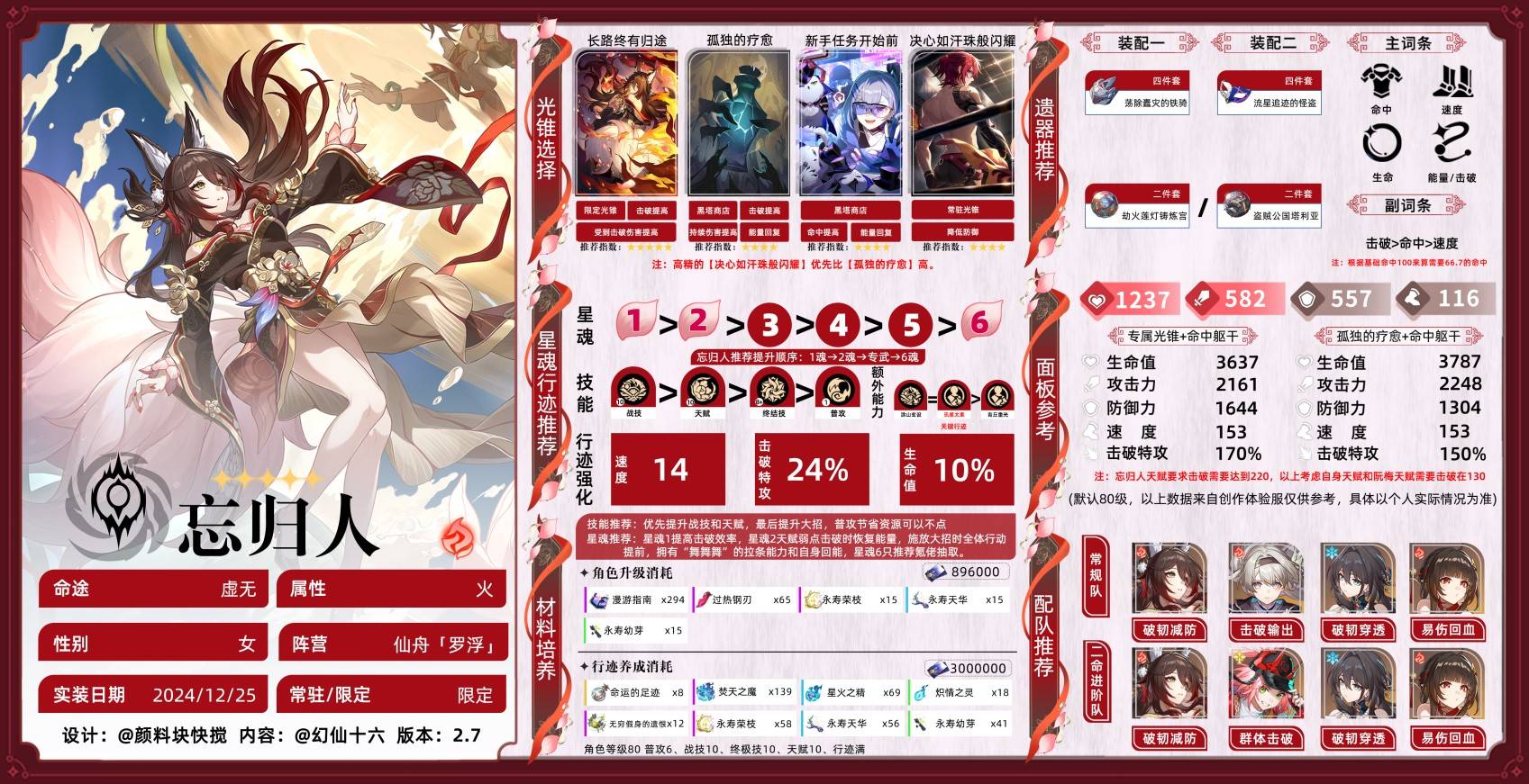 正文摘要:《崩壞星穹鐵道》忘歸人全面培養攻略 最強配隊搭配與光錐選擇指南 新手必看 ▶ 《崩壞星穹鐵道》忘歸人角色介紹 忘歸人是一名虛無命途火屬性角色,於2.7版本下半登場。作為擊破增傷輸出的虛無角色,她能夠大幅提升隊伍的整體實力。本攻略將為各位開拓者詳細介紹培養重點與搭配技巧。 👉 GM後台版 遊戲 推薦 ⬇️⬇️⬇️ 快速玩各種二次元動漫手遊app ▶ 角色定位與特點 核心優勢: - 對所有擊破角色提供極大增益,特別是流螢 - 提升流螢隊的環境抗性與削韌效率 - 具備未來版本保值性,可完美替換開拓者位置 - 對波提歐、亂破等角色都有顯著提升效果 核心配隊推薦: 1. 流螢核心隊: - 流螢 + 忘歸人 + 銀狼 + 布洛妮婭 功能:最強擊破隊,提供超高輸出與生存能力 2. 波提歐核心隊: - 波提歐 + 忘歸人 + 停雲 + 符玄 功能:擊破輸出穩定,適合持久戰 3. 亂破核心隊: - 亂破 + 忘歸人 + 停雲 + 符玄 功能:適合速切速攻玩法 ▶ 數據對比表 光錐效果對比: 光錐名稱主要效果適用場景推薦指數長路終有歸途擊破傷害+40%,能量+20全場景5星孤獨的療愈擊破+24%,能量恢復+12%群戰4.5星新手任務開始前命中+24%,能量+16新手期4星決心如汗珠般閃耀防禦降低20%,傷害+24%通用4星 ▶ 常見問題Q&A Q1:忘歸人值得抽取嗎? A1:非常值得。作為虛無命途的擊破增傷輔助,能大幅提升流螢等主流擊破輸出的傷害,且未來版本保值性高。 Q2:沒有專屬光錐怎麼辦? A2:可以選擇商店兌換「孤獨的療愈」,滿精效果接近專屬,且更具普適性。 Q3:遺器副詞條如何選擇? A3:優先提升爆擊相關屬性,其次考慮速度和攻擊力,確保輸出穩定性。 Q4:為什麼推薦和流螢搭配? A4:忘歸人的技能特別針對擊破傷害提供加成,與流螢的擊破特化玩法完美契合,且能提供額外的生存保障。 Q5:沒有推薦的隊友該如何替代? A5:可以根據自己的角色池靈活調整,核心是確保隊伍中有主輸出、輔助增傷和充能角色。 ▶ 總結建議 忘歸人是一個極具價值的角色,特別適合想要提升擊破隊傷害的玩家。建議優先培養專屬光錐和遺器,並根據自身資源情況選擇合適的配隊方案。在實戰中,要注意技能施放順序和能量管理,以發揮最大戰力。 |