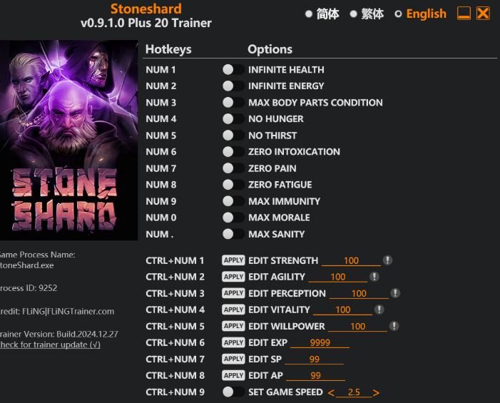正文摘要:replyreload += ',' + 2368687; 修改器介紹 Stoneshard修改器是專為這款硬核RPG遊戲打造的輔助工具,提供多項實用功能,幫助玩家更輕鬆體驗遊戲內容。支援最新版本遊戲,操作簡單直覺。 主要功能 ✦ 基礎屬性修改 - 無限生命值 (Num 1) - 無限能量值 (Num 2) - 身體狀態最佳 (Num 3) - 飢餓/口渴消除 (Num 4/5) - 疲勞值歸零 (Num 8) ✦ 進階數值調整 - 免疫力最大化 (Num 9) - 士氣值提升 (Num 0) - 理智值調整 (Num .) - 遊戲速度設定 (Ctrl+Num 9) ✦ 角色屬性強化 - 力量值修改 (Ctrl+Num 1) - 敏捷值修改 (Ctrl+Num 2) - 感知值修改 (Ctrl+Num 3) - 體力值修改 (Ctrl+Num 4) - 意志力修改 (Ctrl+Num 5) 特色說明 - 支援最新遊戲版本 - 快捷鍵操作設計 - 即時數值修改 - 穩定性優異 下載連結 遊戲官方連結: https://store.steampowered.com/app/625960/_/ 修改器下載: 所有站內附件皆會附上安全掃描報告請會員查看純淨度百分比後判斷使用(adsbygoogle = window.adsbygoogle || []).push({});相關檔案須知:取得檔案前,請先詳細閱讀文章內容避免不必要錯誤與誤會發生。也可多參考文章討論樓層內容了解附件檔案相關討論資訊。 【此文章部分內容隱藏中】 解除隱藏說明教學點擊下方 繼續閱讀文章 後請仔細觀看文章內容 並依照指示進行下一步最後完成解除隱藏後系統會回到此文章自動顯示隱藏內容~繼續閱讀 常見問題Q&A Q1:是否支援最新版本遊戲? A1:支援v0.9.1.0版本,建議確認遊戲版本相符。 Q2:使用修改器會影響存檔嗎? A2:建議先備份存檔再使用,以確保遊戲資料安全。 Q3:如何正確啟動修改器? A3:請在遊戲運行後再啟動修改器,並以管理員權限執行。 Q4:修改器是否安全? A4:本修改器經過安全性測試,但仍建議在單機模式下使用。 Q5:快捷鍵可以自訂嗎? A5:目前快捷鍵為固定設定,無法自訂更改。 👉 GM後台版 遊戲 推薦 ⬇️⬇️⬇️ 快速玩各種二次元動漫手遊appreplyreload += ',' + 2368687; |