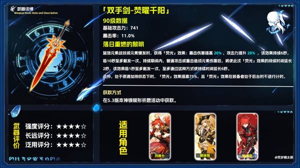 正文摘要:▶ 《原神》焚曜千陽武器基礎介紹 焚曜千陽是《原神》5.3版本推出的五星雙手劍。本武器擁有741點基礎攻擊力,為五星武器中最高等級,與「松籟響起之時」及「山王長牙」並列。同時具備11.0%暴擊率的副屬性,使其成為一把相當優質的雙手劍選擇。 👉 GM後台版 遊戲 推薦 ⬇️⬇️⬇️ 快速玩各種二次元動漫手遊app ▶ 《原神》焚曜千陽基礎數值與特效機制 ▶ 《原神》焚曜千陽角色適用度對照表 角色適用度主要優勢替代建議瑪薇卡S級完美契合夜魂機制浪影闊劍優菈S級雙暴屬性助力畢業松籟響起之時娜維亞A級特效覆蓋率高其他五星雙手劍迪盧克A級通用性強狼的末路基尼奇B級基礎屬性優秀山王長牙 以下廣告滑動後還有帖子內容var custom_call_MIR = function (params) {if ( params === null || params.hasAd === false ) {var divRowSide;for (let index = 0; index < ONEADs.length; index++) {if (ONEADs[index].pub.player_mode === "mobile-inread") {divRowSide = ONEADs[index].pub.slotobj;}}var ins = document.createElement('ins');ins.className = 'clickforceads';ins.setAttribute('style', 'display:inline-block;');ins.setAttribute('data-ad-zone', '18264');divRowSide.appendChild(ins);var js = document.createElement('script');js.async = true;js.type = 'text/javascript';js.setAttribute('src', '//cdn.holmesmind.com/js/init.js');js.onload = function(){console.log('[ONEAD MIR] ClickForce Loaded');};divRowSide.appendChild(js);}};var _ONEAD = {};_ONEAD.pub = {};_ONEAD.pub.slotobj = document.getElementById("oneadMIRDFPTag");_ONEAD.pub.slots = ["div-onead-ad"];_ONEAD.pub.uid = "1000509";_ONEAD.pub.external_url = "https://onead.onevision.com.tw/";_ONEAD.pub.scopes = ["spotbuy", "speed"];_ONEAD.pub.player_mode_div = "div-onead-ad";_ONEAD.pub.player_mode = "mobile-inread";_ONEAD.pub.queryAdCallback = custom_call_MIR;var ONEAD_pubs = ONEAD_pubs || [];ONEAD_pubs.push(_ONEAD);var truvidScript = document.createElement('script'); truvidScript.async = true; truvidScript.setAttribute('data-cfasync','false'); truvidScript.type = 'text/javascript'; truvidScript.src = '//stg.truvidplayer.com/index.php?sub_user_id=597&widget_id=3309&playlist_id=2381&m=a&cb=' + (Math.random() * 10000000000000000); var currentScript = document.currentScript || document.scripts[document.scripts.length - 1]; currentScript.parentNode.insertBefore(truvidScript, currentScript.nextSibling); ▶ 《原神》焚曜千陽常見問題Q&A Q1:焚曜千陽的特效觸發條件是什麼? A1:施放元素戰技或元素爆發時觸發,持續6秒,可通過元素傷害延長持續時間。 Q2:夜魂加持具體提供多少加成? A2:在夜魂狀態下,焚光效果提升75%,且角色處於後台時不會計時。 Q3:對於非納塔系角色來說值得抽取嗎? A3:值得。即使沒有夜魂加成,基礎特效和雙暴屬性仍然很實用。 Q4:與其他五星雙手劍相比有什麼優勢? A4:高基礎攻擊力配合暴擊率副屬性,降低了角色的配裝難度。 Q5:特效延長機制如何運作? A5:普攻或重擊造成元素傷害後每秒可延長2秒,最多延長6秒,需每秒觸發。 |