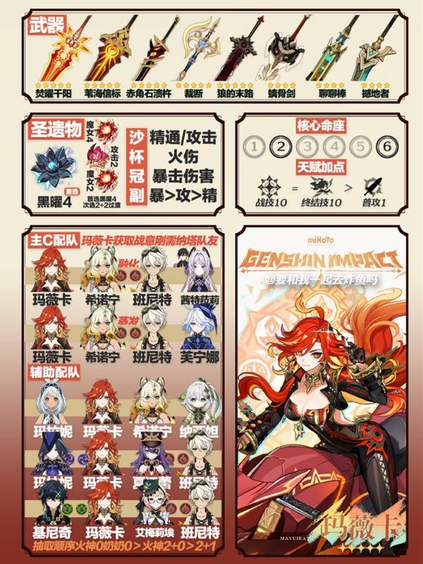 正文摘要:▶ 前言 《原神》5.3版本帶來了全新5星角色瑪薇卡,本攻略將為各位旅行者詳細解析瑪薇卡的配裝、配隊及使用技巧。 👉 GM後台版 遊戲 推薦 ⬇️⬇️⬇️ 快速玩各種二次元動漫手遊app ▶ 角色一圖流攻略 ▶ 攻略內容對照表 項目詳細說明角色定位5星冰系雙手劍武器推薦焚曜千陽、浪影闊劍、狼的末路天賦優先級普攻=爆發>戰技聖遺物配置冰風迷途2+2、蒼白之火2+2 ▶ 常見問題Q&A 以下廣告滑動後還有帖子內容var custom_call_MIR = function (params) {if ( params === null || params.hasAd === false ) {var divRowSide;for (let index = 0; index < ONEADs.length; index++) {if (ONEADs[index].pub.player_mode === "mobile-inread") {divRowSide = ONEADs[index].pub.slotobj;}}var ins = document.createElement('ins');ins.className = 'clickforceads';ins.setAttribute('style', 'display:inline-block;');ins.setAttribute('data-ad-zone', '18264');divRowSide.appendChild(ins);var js = document.createElement('script');js.async = true;js.type = 'text/javascript';js.setAttribute('src', '//cdn.holmesmind.com/js/init.js');js.onload = function(){console.log('[ONEAD MIR] ClickForce Loaded');};divRowSide.appendChild(js);}};var _ONEAD = {};_ONEAD.pub = {};_ONEAD.pub.slotobj = document.getElementById("oneadMIRDFPTag");_ONEAD.pub.slots = ["div-onead-ad"];_ONEAD.pub.uid = "1000509";_ONEAD.pub.external_url = "https://onead.onevision.com.tw/";_ONEAD.pub.scopes = ["spotbuy", "speed"];_ONEAD.pub.player_mode_div = "div-onead-ad";_ONEAD.pub.player_mode = "mobile-inread";_ONEAD.pub.queryAdCallback = custom_call_MIR;var ONEAD_pubs = ONEAD_pubs || [];ONEAD_pubs.push(_ONEAD);var truvidScript = document.createElement('script'); truvidScript.async = true; truvidScript.setAttribute('data-cfasync','false'); truvidScript.type = 'text/javascript'; truvidScript.src = '//stg.truvidplayer.com/index.php?sub_user_id=597&widget_id=3309&playlist_id=2381&m=a&cb=' + (Math.random() * 10000000000000000); var currentScript = document.currentScript || document.scripts[document.scripts.length - 1]; currentScript.parentNode.insertBefore(truvidScript, currentScript.nextSibling); Q1:瑪薇卡適合什麼配隊? A1:根據圖中顯示,瑪薇卡適合超導隊、冰系輸出隊。 Q2:瑪薇卡的主要輸出方式是什麼? A2:主要依靠夜魂機制和物理輸出進行傷害。 Q3:瑪薇卡的聖遺物主詞條應該選擇什麼? A3:建議攻擊力/物理傷害/暴擊(暴傷)。 Q4:瑪薇卡的天賦升級優先順序? A4:普通攻擊與元素爆發同等重要,優先提升這兩個天賦。 Q5:瑪薇卡的四星武器推薦? A5:根據圖片顯示,雪葬的星銀是不錯的四星武器選擇。 ▶ 結語 本攻略僅供參考,具體配裝可根據自身資源情況進行調整。祝各位旅行者都能靈活運用瑪薇卡的特長,在提瓦特大陸上展現她的實力! |