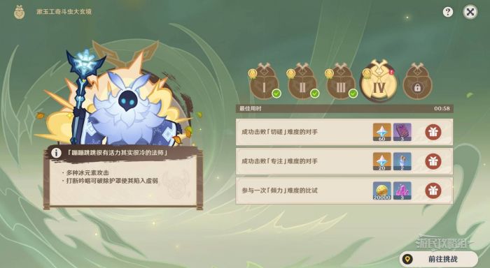 正文摘要:《原神》鬥蟲大玄境第四天挑戰介紹 - 玩法攻略 5.3版本「漱玉工奇鬥蟲大玄境」進入第四天,本次對戰冰深淵法師,需要靈活運用花羽葉月神機進行對抗。 👉 GM後台版 遊戲 推薦 ⬇️⬇️⬇️ 快速玩各種二次元動漫手遊app 《原神》第四天挑戰獎勵 - 遊戲指南 完成條件: - 只能使用刺挑破盾 - 需要先浮空後蓄力 - 蓄滿力刺挑距離為2格 - 根據與弱點距離調整蓄力時間 難度破盾方式注意事項普通普通攻擊即可瞄準弱點圖標專注普通攻擊/刺挑需注意閃避時機傾力僅限刺挑需精確控制距離 以下廣告滑動後還有帖子內容var custom_call_MIR = function (params) {if ( params === null || params.hasAd === false ) {var divRowSide;for (let index = 0; index < ONEADs.length; index++) {if (ONEADs[index].pub.player_mode === "mobile-inread") {divRowSide = ONEADs[index].pub.slotobj;}}var ins = document.createElement('ins');ins.className = 'clickforceads';ins.setAttribute('style', 'display:inline-block;');ins.setAttribute('data-ad-zone', '18264');divRowSide.appendChild(ins);var js = document.createElement('script');js.async = true;js.type = 'text/javascript';js.setAttribute('src', '//cdn.holmesmind.com/js/init.js');js.onload = function(){console.log('[ONEAD MIR] ClickForce Loaded');};divRowSide.appendChild(js);}};var _ONEAD = {};_ONEAD.pub = {};_ONEAD.pub.slotobj = document.getElementById("oneadMIRDFPTag");_ONEAD.pub.slots = ["div-onead-ad"];_ONEAD.pub.uid = "1000509";_ONEAD.pub.external_url = "https://onead.onevision.com.tw/";_ONEAD.pub.scopes = ["spotbuy", "speed"];_ONEAD.pub.player_mode_div = "div-onead-ad";_ONEAD.pub.player_mode = "mobile-inread";_ONEAD.pub.queryAdCallback = custom_call_MIR;var ONEAD_pubs = ONEAD_pubs || [];ONEAD_pubs.push(_ONEAD);var truvidScript = document.createElement('script'); truvidScript.async = true; truvidScript.setAttribute('data-cfasync','false'); truvidScript.type = 'text/javascript'; truvidScript.src = '//stg.truvidplayer.com/index.php?sub_user_id=597&widget_id=3309&playlist_id=2381&m=a&cb=' + (Math.random() * 10000000000000000); var currentScript = document.currentScript || document.scripts[document.scripts.length - 1]; currentScript.parentNode.insertBefore(truvidScript, currentScript.nextSibling); 《原神》鬥蟲大玄境常見問答 Q1: 第四天的對手有什麼特點? A1: 是冰深淵法師,攻擊方式與第三天火深淵法師類似。 Q2: 傾力難度如何破盾? A2: 只能使用蓄力刺挑,需要先浮空再蓄力攻擊弱點。 Q3: 如何躲避冰錐攻擊? A3: 前後移動躲避縱向冰錐,調整浮空高度躲避橫向冰錐。 Q4: 刺挑的最大距離是多少? A4: 蓄滿力的刺挑距離為2格。 Q5: 如何更容易命中弱點? A5: 根據當前浮空位置與弱點的距離來調整蓄力時間。 |
