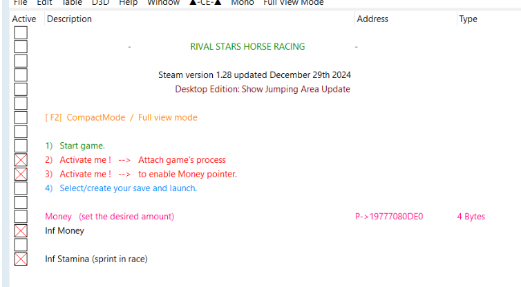 正文摘要:replyreload += ',' + 2370128;《家族傳奇馬匹養成競技 Rival Stars Horse Racing》桌面版 - CE修改器完整修改功能包 無限金錢/耐力修改 遊戲介紹 Rival Stars Horse Racing 桌面版是一款精緻的賽馬育成模擬遊戲,最新版本(v1.28)於2024年12月29日更新,加入了全新的障礙賽區域內容。 修改器功能說明 本修改器提供以下功能: - 無限金錢修改 - 比賽衝刺耐力無限 - 貨幣指標修改 使用教學 1. 下載並安裝CE修改器 2. 啟動遊戲並進入主選單 3. 載入修改表並連接遊戲進程 4. 選擇或建立存檔後開始遊戲 5. 按[F2]可切換緊湊模式/全視圖模式 修改參數表 金錢修改位址: P->19777080DE0 (4位元組) 下載連結 CE修改器 7.5 中文版: https://www.game735.com/thread-377613-1-1.html 修改表下載: 所有站內附件皆會附上安全掃描報告請會員查看純淨度百分比後判斷使用(adsbygoogle = window.adsbygoogle || []).push({});相關檔案須知:取得檔案前,請先詳細閱讀文章內容避免不必要錯誤與誤會發生。也可多參考文章討論樓層內容了解附件檔案相關討論資訊。 【此文章部分內容隱藏中】 解除隱藏說明教學點擊下方 繼續閱讀文章 後請仔細觀看文章內容 並依照指示進行下一步最後完成解除隱藏後系統會回到此文章自動顯示隱藏內容~繼續閱讀 遊戲官方連結: https://store.steampowered.com/a ... ng_Desktop_Edition/ 常見問題Q&A Q1: 修改器支援哪些遊戲版本? A1: 目前支援Steam v1.28版本。 Q2: 金錢修改後會立即生效嗎? A2: 是的,修改後數值會即時更新。 Q3: 使用修改器會影響遊戲存檔嗎? A3: 建議在使用修改器前先備份存檔。 Q4: 為什麼無法連接遊戲進程? A4: 請確認是否以管理員權限執行修改器。 Q5: 耐力值修改是永久的嗎? A5: 修改效果僅在當次遊戲進程中有效。 👉 GM後台版 遊戲 推薦 ⬇️⬇️⬇️ 快速玩各種二次元動漫手遊appreplyreload += ',' + 2370128; |