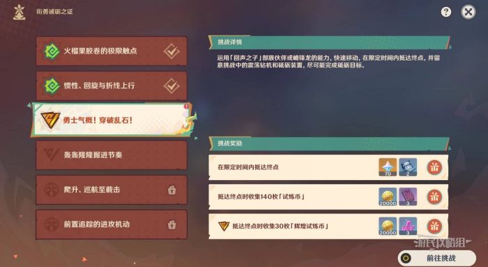 正文摘要:《原神》銜勇誠礪之證第三關攻略詳解 活動基本介紹 在《原神》5.3版本中,"銜勇誠礪之證"部族砥礪挑戰活動現已開放。本次將為大家詳細介紹第三關"回聲之子-勇士氣概!穿破亂石"的完整攻略。 👉 GM後台版 遊戲 推薦 ⬇️⬇️⬇️ 快速玩各種二次元動漫手遊app 挑戰目標與基本資訊 主要目標: - 在限定時間內抵達終點 - 抵達終點時需收集140枚「試煉幣」 - 【砥礪目標】:收集30枚「輝煌試煉幣」 挑戰方式優點缺點角色挑戰容錯率高需要角色交替脊鋒龍穩定性強操作要求較高 以下廣告滑動後還有帖子內容var custom_call_MIR = function (params) {if ( params === null || params.hasAd === false ) {var divRowSide;for (let index = 0; index < ONEADs.length; index++) {if (ONEADs[index].pub.player_mode === "mobile-inread") {divRowSide = ONEADs[index].pub.slotobj;}}var ins = document.createElement('ins');ins.className = 'clickforceads';ins.setAttribute('style', 'display:inline-block;');ins.setAttribute('data-ad-zone', '18264');divRowSide.appendChild(ins);var js = document.createElement('script');js.async = true;js.type = 'text/javascript';js.setAttribute('src', '//cdn.holmesmind.com/js/init.js');js.onload = function(){console.log('[ONEAD MIR] ClickForce Loaded');};divRowSide.appendChild(js);}};var _ONEAD = {};_ONEAD.pub = {};_ONEAD.pub.slotobj = document.getElementById("oneadMIRDFPTag");_ONEAD.pub.slots = ["div-onead-ad"];_ONEAD.pub.uid = "1000509";_ONEAD.pub.external_url = "https://onead.onevision.com.tw/";_ONEAD.pub.scopes = ["spotbuy", "speed"];_ONEAD.pub.player_mode_div = "div-onead-ad";_ONEAD.pub.player_mode = "mobile-inread";_ONEAD.pub.queryAdCallback = custom_call_MIR;var ONEAD_pubs = ONEAD_pubs || [];ONEAD_pubs.push(_ONEAD);var truvidScript = document.createElement('script'); truvidScript.async = true; truvidScript.setAttribute('data-cfasync','false'); truvidScript.type = 'text/javascript'; truvidScript.src = '//stg.truvidplayer.com/index.php?sub_user_id=597&widget_id=3309&playlist_id=2381&m=a&cb=' + (Math.random() * 10000000000000000); var currentScript = document.currentScript || document.scripts[document.scripts.length - 1]; currentScript.parentNode.insertBefore(truvidScript, currentScript.nextSibling); 常見問題Q&A Q1:如何快速找到挑戰位置? A1:從右上角菜單打開活動界面,點擊挑戰詳情選擇關卡即可快速定位。 Q2:為什麼推薦帶兩個爬山角色? A2:因為後續有較長的爬山路段,可以互相替換避免體力耗盡。 Q3:震蕩鑽機要如何處理? A3:直接攻擊即可,部分區域的鑽機具有連動效果。 Q4:砥礪目標如何完成? A4:需要在限定路線上收集30枚輝煌試煉幣,同時避開炸藥桶。 Q5:使用脊鋒龍和角色有什麼區別? A5:脊鋒龍更穩定但要求操作精準,角色組合則有更高的容錯率。 |