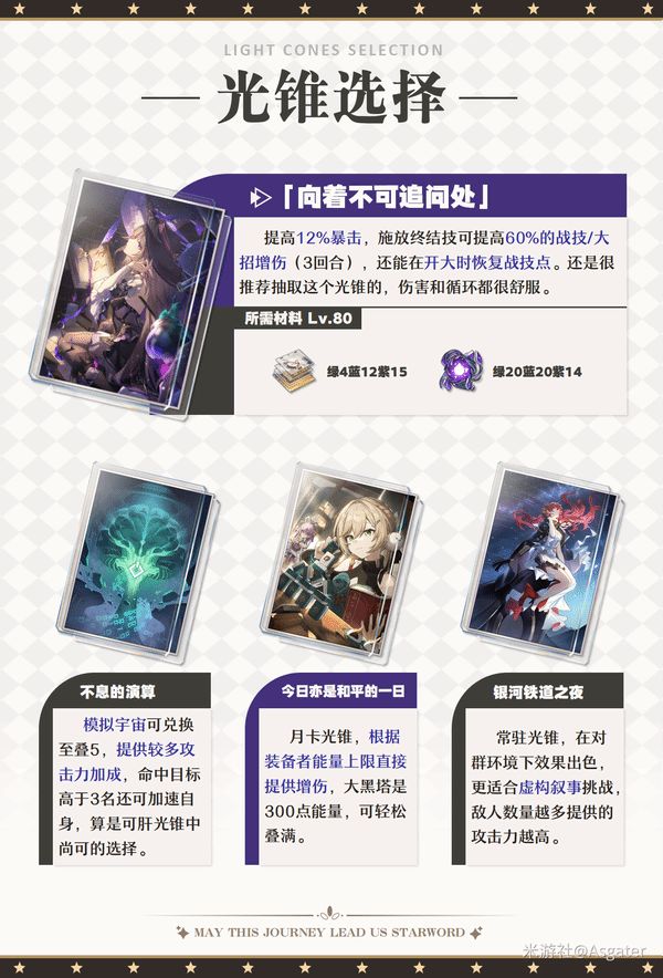 正文摘要:《崩壞星穹鐵道》大黑塔光錐全方位攻略指南 在《崩壞星穹鐵道》3.0版本中,大黑塔作為重點UP角色備受矚目。本篇攻略將為各位開拓者詳細介紹大黑塔的光錐搭配攻略,幫助玩家做出最佳選擇。 👉 GM後台版 遊戲 推薦 ⬇️⬇️⬇️ 快速玩各種二次元動漫手遊app 光錐基礎說明 首先需要特別注意的是,大黑塔只能裝備智識屬性的光錐,這是在搭配時的首要考量點。 光錐優先度推薦 依據效果與實用性,以下是光錐的推薦順序: 1. 專屬光錐(最優先) 2. 五星光錐:【銀河鐵道之夜】(姬子的光錐) 3. 四星光錐:【今日亦是和平的一日】 4. 通用選擇:【不息的演算】(可在黑塔商店購買) 光錐等級光錐名稱獲取方式五星專屬光錐限時抽取五星銀河鐵道之夜常駐抽取四星今日亦是和平的一日常駐抽取四星不息的演算黑塔商店 以下廣告滑動後還有帖子內容var custom_call_MIR = function (params) {if ( params === null || params.hasAd === false ) {var divRowSide;for (let index = 0; index < ONEADs.length; index++) {if (ONEADs[index].pub.player_mode === "mobile-inread") {divRowSide = ONEADs[index].pub.slotobj;}}var ins = document.createElement('ins');ins.className = 'clickforceads';ins.setAttribute('style', 'display:inline-block;');ins.setAttribute('data-ad-zone', '18264');divRowSide.appendChild(ins);var js = document.createElement('script');js.async = true;js.type = 'text/javascript';js.setAttribute('src', '//cdn.holmesmind.com/js/init.js');js.onload = function(){console.log('[ONEAD MIR] ClickForce Loaded');};divRowSide.appendChild(js);}};var _ONEAD = {};_ONEAD.pub = {};_ONEAD.pub.slotobj = document.getElementById("oneadMIRDFPTag");_ONEAD.pub.slots = ["div-onead-ad"];_ONEAD.pub.uid = "1000509";_ONEAD.pub.external_url = "https://onead.onevision.com.tw/";_ONEAD.pub.scopes = ["spotbuy", "speed"];_ONEAD.pub.player_mode_div = "div-onead-ad";_ONEAD.pub.player_mode = "mobile-inread";_ONEAD.pub.queryAdCallback = custom_call_MIR;var ONEAD_pubs = ONEAD_pubs || [];ONEAD_pubs.push(_ONEAD);var truvidScript = document.createElement('script'); truvidScript.async = true; truvidScript.setAttribute('data-cfasync','false'); truvidScript.type = 'text/javascript'; truvidScript.src = '//stg.truvidplayer.com/index.php?sub_user_id=597&widget_id=3309&playlist_id=2381&m=a&cb=' + (Math.random() * 10000000000000000); var currentScript = document.currentScript || document.scripts[document.scripts.length - 1]; currentScript.parentNode.insertBefore(truvidScript, currentScript.nextSibling); 常見問題Q&A Q1:大黑塔可以使用其他屬性的光錐嗎? A1:不可以,大黑塔只能使用智識屬性的光錐。 Q2:沒有專屬光錐應該選擇什麼? A2:可以選擇【銀河鐵道之夜】作為替代方案。 Q3:四星光錐中哪個性價比最高? A3:【今日亦是和平的一日】是性價比較高的選擇。 Q4:黑塔商店的【不息的演算】值得購買嗎? A4:作為基礎選擇是不錯的,特別適合新手玩家。 Q5:光錐的優先升級順序是什麼? A5:建議優先提升專屬光錐,若無專屬則依照本文推薦順序進行培養。 本攻略參考自遊戲最新版本,僅供參考。具體效果請以遊戲內實際數值為準。 |