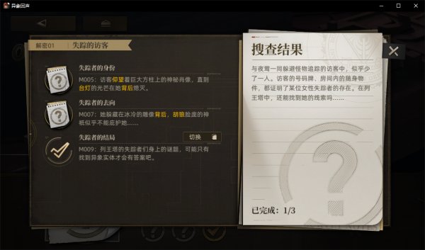 正文摘要:《異象回聲》序章解密完整攻略 更新日期:2025/01/16 一、序章解密概述 序章共包含三個主要謎題: - M005:失蹤者的身份 - M007:失蹤者的去向 - M009:失蹤者的結局 👉 GM後台版 遊戲 推薦 ⬇️⬇️⬇️ 快速玩各種二次元動漫手遊app 二、謎題一:失蹤者的身份(M005) 謎題編號解密要求難度M005特定位置結束行動簡單M007找到特定雕像位置中等M009擊敗BOSS依實力而定 以下廣告滑動後還有帖子內容var custom_call_MIR = function (params) {if ( params === null || params.hasAd === false ) {var divRowSide;for (let index = 0; index < ONEADs.length; index++) {if (ONEADs[index].pub.player_mode === "mobile-inread") {divRowSide = ONEADs[index].pub.slotobj;}}var ins = document.createElement('ins');ins.className = 'clickforceads';ins.setAttribute('style', 'display:inline-block;');ins.setAttribute('data-ad-zone', '18264');divRowSide.appendChild(ins);var js = document.createElement('script');js.async = true;js.type = 'text/javascript';js.setAttribute('src', '//cdn.holmesmind.com/js/init.js');js.onload = function(){console.log('[ONEAD MIR] ClickForce Loaded');};divRowSide.appendChild(js);}};var _ONEAD = {};_ONEAD.pub = {};_ONEAD.pub.slotobj = document.getElementById("oneadMIRDFPTag");_ONEAD.pub.slots = ["div-onead-ad"];_ONEAD.pub.uid = "1000509";_ONEAD.pub.external_url = "https://onead.onevision.com.tw/";_ONEAD.pub.scopes = ["spotbuy", "speed"];_ONEAD.pub.player_mode_div = "div-onead-ad";_ONEAD.pub.player_mode = "mobile-inread";_ONEAD.pub.queryAdCallback = custom_call_MIR;var ONEAD_pubs = ONEAD_pubs || [];ONEAD_pubs.push(_ONEAD);var truvidScript = document.createElement('script'); truvidScript.async = true; truvidScript.setAttribute('data-cfasync','false'); truvidScript.type = 'text/javascript'; truvidScript.src = '//stg.truvidplayer.com/index.php?sub_user_id=597&widget_id=3309&playlist_id=2381&m=a&cb=' + (Math.random() * 10000000000000000); var currentScript = document.currentScript || document.scripts[document.scripts.length - 1]; currentScript.parentNode.insertBefore(truvidScript, currentScript.nextSibling); 六、常見問題Q&A Q1:為什麼完成解密後沒有獲得獎勵? A1:需要在解密界面點擊完成按鈕,且必須勝利通關才能獲得獎勵。 Q2:M005中要如何確認正確位置? A2:尋找左側台燈附近,靠近肖像畫的地格位置。 Q3:M007中的胡狼雕像在哪裡? A3:在右側五座雕像的正中間位置。 Q4:解密需要按照順序完成嗎? A4:是的,需要按照M005、M007、M009的順序進行。 Q5:如果BOSS戰失敗會影響解密進度嗎? A5:會影響,必須勝利通關才能完成解密結算。 |