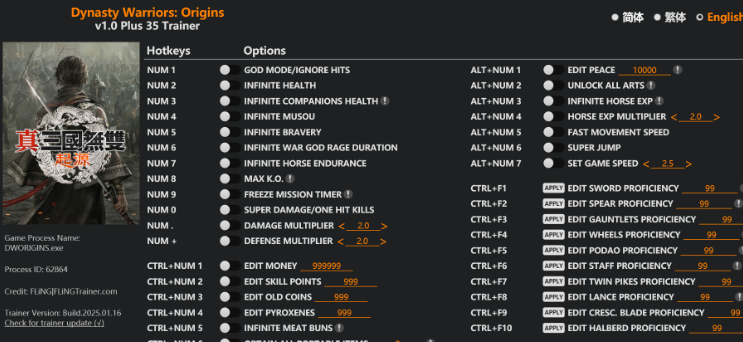 正文摘要:replyreload += ',' + 2370866; 《真·三國無雙 起源》修改器完整功能介紹 更新日期:2025/01/17 遊戲版本:v1.0+ 修改器版本:2025.01.16 基礎功能設定(數字鍵) - Num 1:無敵模式/無視傷害 - Num 2:無限生命值 - Num 3:夥伴無限生命值 - Num 4:無限無雙槽 - Num 5:無限勇氣值 - Num 6:無限戰神狂怒時間 - Num 7:無限馬匹耐力 - Num 8:最大擊殺數 - Num 9:凍結任務時間 - Num 0:超級傷害/一擊必殺 - Num .:傷害倍率調整 - Num +:防禦倍率調整 👉 GM後台版 遊戲 推薦 ⬇️⬇️⬇️ 快速玩各種二次元動漫手遊app 進階功能設定 資源相關: - Ctrl+Num 1:修改金錢 - Ctrl+Num 2:修改技能點數 - Ctrl+Num 3:修改古錢幣 - Ctrl+Num 4:修改晶石 - Ctrl+Num 5:無限肉包 - Ctrl+Num 6:獲得所有便攜道具 能力強化: - Alt+Num 1:修改和平值 - Alt+Num 2:解鎖所有武藝 - Alt+Num 3:馬匹無限經驗 - Alt+Num 4:馬匹經驗倍率 - Alt+Num 5:快速移動速度 - Alt+Num 6:超級跳躍 - Alt+Num 7:遊戲速度調整 武器熟練度修改 - Ctrl+F1:劍術熟練度 - Ctrl+F2:槍術熟練度 - Ctrl+F3:拳套熟練度 - Ctrl+F4:輪圈熟練度 - Ctrl+F5:朴刀熟練度 - Ctrl+F6:杖術熟練度 - Ctrl+F7:雙戟熟練度 - Ctrl+F8:長槍熟練度 - Ctrl+F9:月牙刀熟練度 - Ctrl+F10:戟術熟練度 下載連結 Free Download: Dynasty Warriors Origins v1.0 Plus 35 Trainer.exe 所有站內附件皆會附上安全掃描報告請會員查看純淨度百分比後判斷使用(adsbygoogle = window.adsbygoogle || []).push({});相關檔案須知:取得檔案前,請先詳細閱讀文章內容避免不必要錯誤與誤會發生。也可多參考文章討論樓層內容了解附件檔案相關討論資訊。 【此文章部分內容隱藏中】 解除隱藏說明教學點擊下方 繼續閱讀文章 後請仔細觀看文章內容 並依照指示進行下一步最後完成解除隱藏後系統會回到此文章自動顯示隱藏內容~繼續閱讀 常見問題Q&A Q1:修改器是否支援最新版本遊戲? A1:目前支援v1.0版本,建議關注更新以確保相容性。 Q2:如何正確使用修改器? A2:請先開啟遊戲,再執行修改器,使用對應按鍵即可修改數值。 Q3:修改後會影響遊戲存檔嗎? A3:建議在使用修改器前先備份存檔,以防止資料損壞。 Q4:為什麼某些功能無效? A4:請確認是否以管理員身分執行,且遊戲版本相符。 Q5:使用修改器會影響遊戲成就嗎? A5:是的,使用修改器可能會影響遊戲成就的解鎖,建議純收集成就時不要使用。replyreload += ',' + 2370866; |