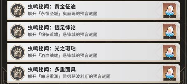 正文摘要:《崩壞星穹鐵道》預言謎題重要提示 在《崩壞星穹鐵道》3.0版本的翁法羅斯地圖中,共有四個特殊的預言謎題。完成這些謎題不僅能獲得珍貴寶箱,還可解鎖蟲鳴秘聞系列成就。 👉 GM後台版 遊戲 推薦 ⬇️⬇️⬇️ 快速玩各種二次元動漫手遊app 《崩壞星穹鐵道》謎題注意事項 主要須知: - 每個地圖區域都有一個蟲鳴秘聞解密任務 - 解密可直接參考攻略完成 - 若選擇錯誤或接受禱告,需等待次日重試 - 完成全部解密可獲得4個珍貴寶箱和4個成就 《崩壞星穹鐵道》區域謎題位置 以下廣告滑動後還有帖子內容var custom_call_MIR = function (params) {if ( params === null || params.hasAd === false ) {var divRowSide;for (let index = 0; index < ONEADs.length; index++) {if (ONEADs[index].pub.player_mode === "mobile-inread") {divRowSide = ONEADs[index].pub.slotobj;}}var ins = document.createElement('ins');ins.className = 'clickforceads';ins.setAttribute('style', 'display:inline-block;');ins.setAttribute('data-ad-zone', '18264');divRowSide.appendChild(ins);var js = document.createElement('script');js.async = true;js.type = 'text/javascript';js.setAttribute('src', '//cdn.holmesmind.com/js/init.js');js.onload = function(){console.log('[ONEAD MIR] ClickForce Loaded');};divRowSide.appendChild(js);}};var _ONEAD = {};_ONEAD.pub = {};_ONEAD.pub.slotobj = document.getElementById("oneadMIRDFPTag");_ONEAD.pub.slots = ["div-onead-ad"];_ONEAD.pub.uid = "1000509";_ONEAD.pub.external_url = "https://onead.onevision.com.tw/";_ONEAD.pub.scopes = ["spotbuy", "speed"];_ONEAD.pub.player_mode_div = "div-onead-ad";_ONEAD.pub.player_mode = "mobile-inread";_ONEAD.pub.queryAdCallback = custom_call_MIR;var ONEAD_pubs = ONEAD_pubs || [];ONEAD_pubs.push(_ONEAD);var truvidScript = document.createElement('script'); truvidScript.async = true; truvidScript.setAttribute('data-cfasync','false'); truvidScript.type = 'text/javascript'; truvidScript.src = '//stg.truvidplayer.com/index.php?sub_user_id=597&widget_id=3309&playlist_id=2381&m=a&cb=' + (Math.random() * 10000000000000000); var currentScript = document.currentScript || document.scripts[document.scripts.length - 1]; currentScript.parentNode.insertBefore(truvidScript, currentScript.nextSibling); 區域名稱解密獎勵永恆聖城珍貴寶箱+成就浴血戰端珍貴寶箱+成就紛爭荒墟珍貴寶箱+成就命運重淵珍貴寶箱+成就 《崩壞星穹鐵道》謎題相關問題Q&A Q1:完成所有謎題可以獲得什麼獎勵? A1:可獲得4個珍貴寶箱和4個蟲鳴秘聞系列成就。 Q2:如果選錯答案怎麼辦? A2:需要等到次日才能重新嘗試解密。 Q3:每個區域有幾個謎題? A3:每個區域各有一個蟲鳴秘聞解密任務。 Q4:解密過程中需要注意什麼? A4:建議參考攻略直接完成,避免重複嘗試。 Q5:蟲鳴秘聞解密任務分布在哪裡? A5:分布在翁法羅斯的四個主要區域中。 |