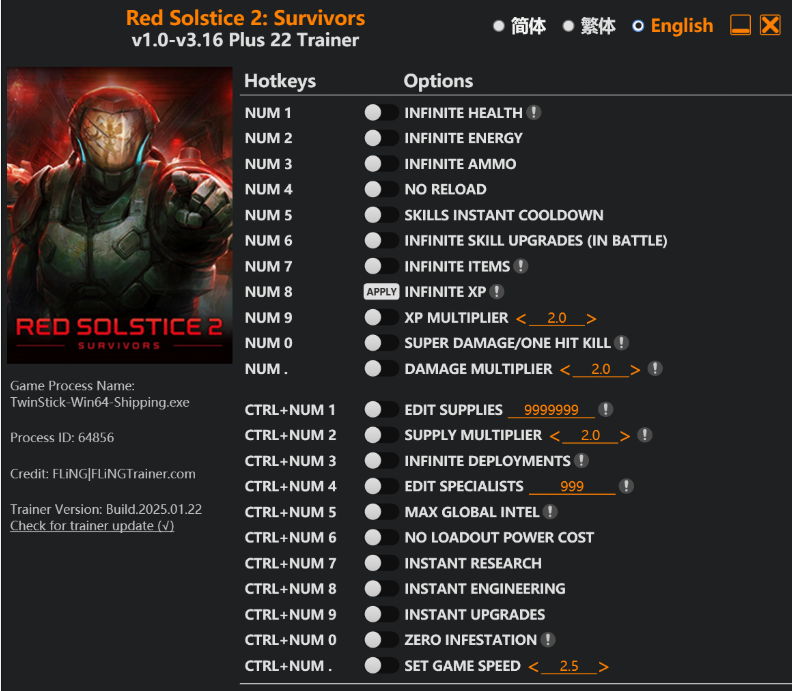 正文摘要:replyreload += ',' + 2371268; 遊戲資訊及更新日期 🔸遊戲版本:v1.0-v3.16+ 🔸更新日期:20250117 🔸支援平台:PC Steam版本 修改器功能說明 本次修改器包含22項強大功能,分為戰鬥功能和資源功能兩大類: ☑️ 戰鬥功能(數字鍵): - Num 1:無限生命值 - Num 2:無限能量 - Num 3:無限彈藥 - Num 4:無需裝彈 - Num 5:技能零冷卻 - Num 6:戰鬥中無限技能升級 - Num 7:道具無限使用 - Num 8:經驗值無限 - Num 9:經驗值倍率 - Num 0:超級傷害/一擊必殺 - Num .:傷害倍率調整 ☑️ 資源功能(Ctrl+數字鍵): - Ctrl+Num 1:修改補給品數量 - Ctrl+Num 2:補給品獲得倍率 - Ctrl+Num 3:無限部署次數 - Ctrl+Num 4:修改專家數量 - Ctrl+Num 5:全球情報值最大 - Ctrl+Num 6:裝備無能量消耗 - Ctrl+Num 7:即時完成研究 - Ctrl+Num 8:即時完成工程 - Ctrl+Num 9:即時完成升級 - Ctrl+Num 0:清除感染度 - Ctrl+Num .:遊戲速度調整 下載連結 🔸Free Download: Red Solstice 2 Survivors v1.0-v3.16 Plus 22 Trainer.exe 所有站內附件皆會附上安全掃描報告請會員查看純淨度百分比後判斷使用(adsbygoogle = window.adsbygoogle || []).push({});相關檔案須知:取得檔案前,請先詳細閱讀文章內容避免不必要錯誤與誤會發生。也可多參考文章討論樓層內容了解附件檔案相關討論資訊。 【此文章部分內容隱藏中】 解除隱藏說明教學點擊下方 繼續閱讀文章 後請仔細觀看文章內容 並依照指示進行下一步最後完成解除隱藏後系統會回到此文章自動顯示隱藏內容~繼續閱讀 使用說明 1. 下載修改器執行檔 2. 以管理員身份運行修改器 3. 開啟遊戲後再執行修改器 4. 使用對應按鍵開啟/關閉功能 常見問題Q&A Q1:修改器是否支援最新版本? A1:支援v1.0-v3.16+版本,請確認遊戲版本。 Q2:為什麼部分功能無法使用? A2:請確認是否以管理員身份運行,並確保遊戲完全載入。 Q3:使用修改器會影響存檔嗎? A3:建議備份存檔後再使用,以確保遊戲進度安全。 Q4:修改器可以在多人模式使用嗎? A4:強烈建議僅在單人模式下使用,避免影響遊戲平衡。 Q5:如何正確使用資源功能? A5:請確實按住Ctrl鍵再按下對應數字鍵,並在主選單中使用。 👉 GM後台版 遊戲 推薦 ⬇️⬇️⬇️ 快速玩各種二次元動漫手遊appreplyreload += ',' + 2371268; |