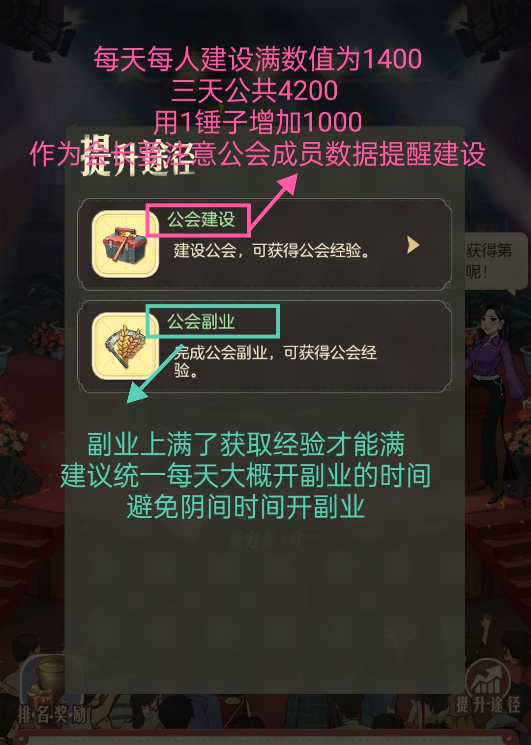 《時光雜貨屋》公會經驗榜基礎說明 公會經驗榜的分數由兩大部分構成: 1. 建設分數 2. 副業分數 需注意:文藝匯演不計入總分。 《時光雜貨屋》建設系統攻略 建設分數提升方式: 1. 全體成員配合: - 所有成員