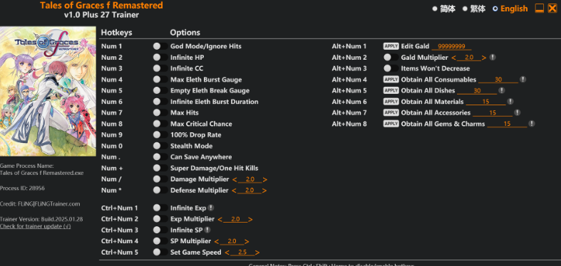 正文摘要:replyreload += ',' + 2371879; 更新日期:20250129 修改器基本資訊 - 遊戲版本:v1.0+ - 功能數量:27項 - 最後更新:2025.01.28 修改器功能清單 基礎功能(數字鍵) - Num 1:無敵模式/無視傷害 - Num 2:無限HP - Num 3:無限CC值 - Num 4:元素爆發槽最大化 - Num 5:元素破壞槽清空 - Num 6:無限元素爆發時間 - Num 7:連擊數最大化 - Num 8:爆擊率最大化 - Num 9:100%掉落率 - Num 0:隱身模式 - Num .:任意位置存檔 - Num +:超級傷害/一擊必殺 - Num /:傷害倍率調整 - Num *:防禦倍率調整 經驗值與SP相關(Ctrl+數字鍵) - Ctrl+Num 1:無限經驗值 - Ctrl+Num 2:經驗值倍率調整 - Ctrl+Num 3:無限SP點數 - Ctrl+Num 4:SP獲得倍率調整 - Ctrl+Num 5:遊戲速度調整 道具與金錢相關(Alt+數字鍵) - Alt+Num 1:修改金錢(Gald) - Alt+Num 2:金錢獲得倍率 - Alt+Num 3:道具數量不減少 - Alt+Num 4:獲得所有消耗品 - Alt+Num 5:獲得所有料理 - Alt+Num 6:獲得所有素材 - Alt+Num 7:獲得所有飾品 - Alt+Num 8:獲得所有寶石與護符 下載連結 Free Download: Tales of Graces f Remastered v1.0 Plus 27 Trainer.exe 所有站內附件皆會附上安全掃描報告請會員查看純淨度百分比後判斷使用(adsbygoogle = window.adsbygoogle || []).push({});相關檔案須知:取得檔案前,請先詳細閱讀文章內容避免不必要錯誤與誤會發生。也可多參考文章討論樓層內容了解附件檔案相關討論資訊。 【此文章部分內容隱藏中】 解除隱藏說明教學點擊下方 繼續閱讀文章 後請仔細觀看文章內容 並依照指示進行下一步最後完成解除隱藏後系統會回到此文章自動顯示隱藏內容~繼續閱讀 常見問題Q&A Q1:此修改器支援哪些遊戲版本? A1:目前支援v1.0+重製版本。 Q2:使用修改器會影響遊戲存檔嗎? A2:建議使用前先備份存檔,以確保遊戲資料安全。 Q3:為什麼某些功能無法正常使用? A3:請確認是否以管理員權限執行,並確保遊戲版本相符。 Q4:修改器能在戰鬥中開啟嗎? A4:可以,但建議在非戰鬥狀態下調整設定,以避免遊戲異常。 Q5:獲得道具功能會影響遊戲進度嗎? A5:過早獲得某些道具可能影響遊戲劇情體驗,建議謹慎使用。 👉 GM後台版 遊戲 推薦 ⬇️⬇️⬇️ 快速玩各種二次元動漫手遊appreplyreload += ',' + 2371879; |
