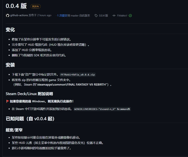 正文摘要:《最終幻想VII:重生》超寬螢幕補丁 v0.0.6 完整支援帶魚屏顯示 (更新日期:20250129) 🔰 補丁特色介紹 本補丁為《最終幻想VII:重生》專屬的ASI外掛,提供超寬螢幕支援與更多客製化選項。 💫 主要功能 • 完整支援任意螢幕比例,並自動校正FOV視野角度 • 遊戲介面維持16:9置中顯示 • 可自訂遊戲FOV視野範圍 • 可調整遊戲幀率上限 • 可關閉暈影特效 • 支援全域FOV倍率調整,影響所有鏡頭視角 📥 安裝教學 1. 從Github下載最新版本 FF7RebirthFix_v0.0.6.zip 2. 解壓縮檔案至遊戲主程式資料夾 (Steam版路徑範例:steamapps\common\FINAL FANTASY VII REBIRTH) 3. 設定調整可透過FF7RebirthFix.ini進行 🎮 Steam Deck/Linux額外設定 • 在Steam遊戲屬性中的啟動選項加入:WINEDLLOVERRIDES="dsound=n,b" %command% (Windows用戶無需此步驟) ⚠️ 已知問題 • QTE快速反應事件中,部分按鍵提示可能會超出畫面或隨鏡頭移動 • 巴雷特礦車小遊戲的射擊位置已修正偏移問題 Free Download: FF7RebirthFix v0.0.6 下載連結 以下廣告滑動後還有帖子內容var custom_call_MIR = function (params) {if ( params === null || params.hasAd === false ) {var divRowSide;for (let index = 0; index < ONEADs.length; index++) {if (ONEADs[index].pub.player_mode === "mobile-inread") {divRowSide = ONEADs[index].pub.slotobj;}}var ins = document.createElement('ins');ins.className = 'clickforceads';ins.setAttribute('style', 'display:inline-block;');ins.setAttribute('data-ad-zone', '18264');divRowSide.appendChild(ins);var js = document.createElement('script');js.async = true;js.type = 'text/javascript';js.setAttribute('src', '//cdn.holmesmind.com/js/init.js');js.onload = function(){console.log('[ONEAD MIR] ClickForce Loaded');};divRowSide.appendChild(js);}};var _ONEAD = {};_ONEAD.pub = {};_ONEAD.pub.slotobj = document.getElementById("oneadMIRDFPTag");_ONEAD.pub.slots = ["div-onead-ad"];_ONEAD.pub.uid = "1000509";_ONEAD.pub.external_url = "https://onead.onevision.com.tw/";_ONEAD.pub.scopes = ["spotbuy", "speed"];_ONEAD.pub.player_mode_div = "div-onead-ad";_ONEAD.pub.player_mode = "mobile-inread";_ONEAD.pub.queryAdCallback = custom_call_MIR;var ONEAD_pubs = ONEAD_pubs || [];ONEAD_pubs.push(_ONEAD);var truvidScript = document.createElement('script'); truvidScript.async = true; truvidScript.setAttribute('data-cfasync','false'); truvidScript.type = 'text/javascript'; truvidScript.src = '//stg.truvidplayer.com/index.php?sub_user_id=597&widget_id=3309&playlist_id=2381&m=a&cb=' + (Math.random() * 10000000000000000); var currentScript = document.currentScript || document.scripts[document.scripts.length - 1]; currentScript.parentNode.insertBefore(truvidScript, currentScript.nextSibling); 💡 常見問題Q&A Q1: 安裝後遊戲無法啟動怎麼辦? A1: 請確認檔案是否放置在正確路徑,並檢查是否有安裝所需的必要元件。 Q2: 如何調整FOV視野角度? A2: 可以透過編輯FF7RebirthFix.ini檔案來調整全域或gameplay專用的FOV數值。 Q3: 補丁是否支援所有解析度? A3: 是的,本補丁支援任意螢幕比例,並會自動調整FOV確保畫面正常顯示。 Q4: 暈影效果調整後沒有變化? A4: 請確認.ini檔案中的vignette設定值是否正確儲存,數值範圍為0-1。 Q5: 補丁會影響遊戲效能嗎? A5: 一般情況下不會明顯影響效能,但如果調整過高的FOV值可能會稍微影響畫面運算。 👉 GM後台版 遊戲 推薦 ⬇️⬇️⬇️ 快速玩各種二次元動漫手遊app |