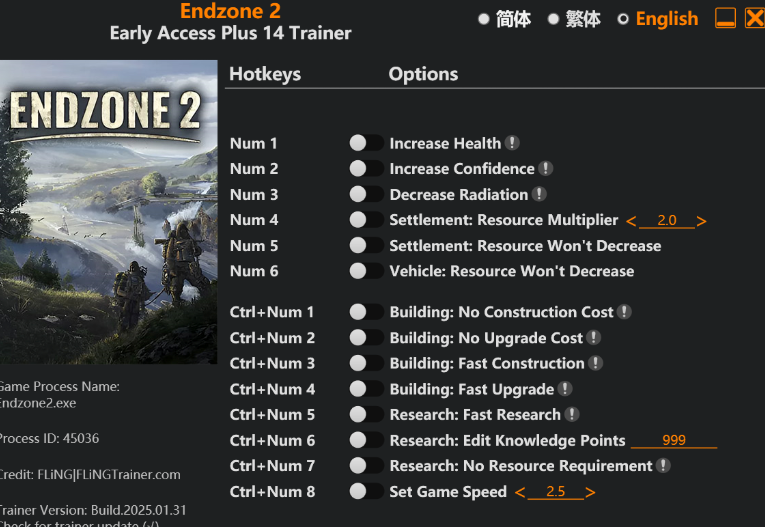 正文摘要:replyreload += ',' + 2372121; (2025.01.31更新) 🔰 修改器介紹 本次為《Endzone 2》帶來全新14項功能修改器,支援最新Early Access版本,讓您的末日生存之旅更加順暢! ✨ 基礎功能(數字鍵) 1. 提升健康值(Num 1):確保居民健康 2. 提升信心值(Num 2):提升居民士氣 3. 降低輻射值(Num 3):減少環境威脅 4. 資源倍率增加(Num 4):提升資源獲取效率 5. 定居點資源不減(Num 5):維持穩定供給 6. 車輛資源不減(Num 6):無限運輸能力 ✨ 進階功能(Ctrl+數字鍵) 1. 建築免費建造(Ctrl+1):節省建設成本 2. 建築免費升級(Ctrl+2):無需升級資源 3. 快速建造(Ctrl+3):即時完成建設 4. 快速升級(Ctrl+4):立即完成升級 5. 快速研究(Ctrl+5):加速科技發展 6. 知識點數修改(Ctrl+6):自由配置研究點數 7. 研究無需資源(Ctrl+7):突破研究限制 8. 遊戲速度調整(Ctrl+8):控制時間流逝 📥 下載連結 Free Download: 所有站內附件皆會附上安全掃描報告請會員查看純淨度百分比後判斷使用(adsbygoogle = window.adsbygoogle || []).push({});相關檔案須知:取得檔案前,請先詳細閱讀文章內容避免不必要錯誤與誤會發生。也可多參考文章討論樓層內容了解附件檔案相關討論資訊。 【此文章部分內容隱藏中】 解除隱藏說明教學點擊下方 繼續閱讀文章 後請仔細觀看文章內容 並依照指示進行下一步最後完成解除隱藏後系統會回到此文章自動顯示隱藏內容~繼續閱讀 ❓ 常見問題Q&A Q1:如何正確使用修改器? A1:開啟遊戲後,使用對應的按鍵組合即可啟用功能。 Q2:修改器是否支援最新版本? A2:支援最新Early Access版本,持續更新維護。 Q3:使用修改器會影響存檔嗎? A3:建議備份存檔後再使用,以確保遊戲資料安全。 Q4:為什麼某些功能無法使用? A4:請確認遊戲版本相符,並以管理員權限執行。 Q5:修改器是否支援Steam版本? A5:完全支援Steam版本,請確保遊戲為最新版本。 👉 GM後台版 遊戲 推薦 ⬇️⬇️⬇️ 快速玩各種二次元動漫手遊appreplyreload += ',' + 2372121; |