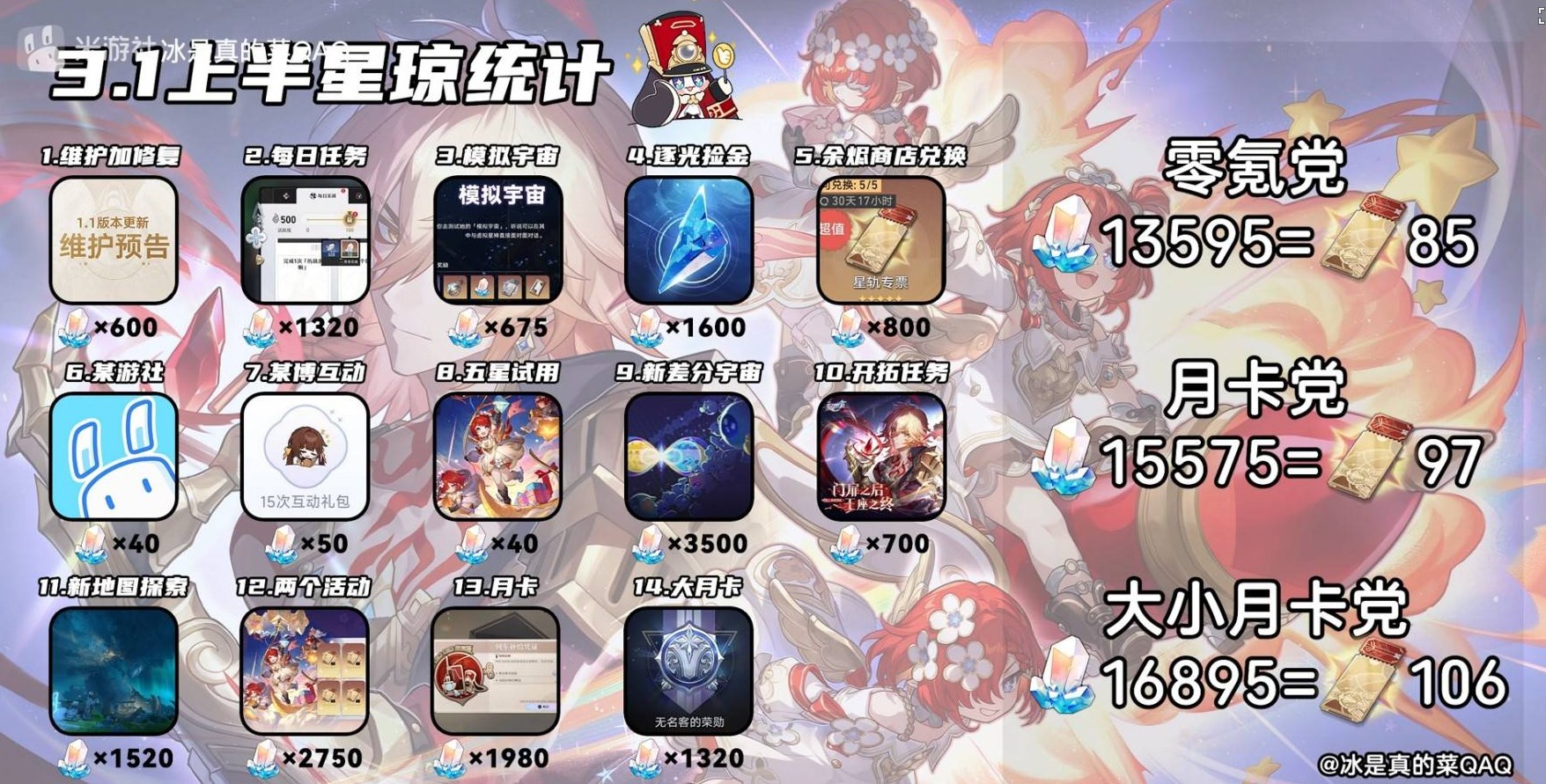 正文摘要:在《崩壞星穹鐵道》3.1版本中,許多玩家都很關心免費星琼的獲取途徑。本篇將為各位詳細解析3.1版本上半期的星琼獲取管道與計算方式,讓各位開拓者更好規劃抽卡資源。 👉 GM後台版 遊戲 推薦 ⬇️⬇️⬇️ 快速玩各種二次元動漫手遊app 一、基礎獎勵項目 1. 維護補償星:600星琼 2. 每日任務:1320星琼 3. 蝶環宇宙:675星琼 4. 星光投會:1600星琼 5. 餘煙商店兌換:800星琼 二、社群活動獎勵 1. 素遊社參與:40星琼 2. 社群互動:50星琼 3. 五星體驗:40星琼 三、遊戲內容獎勵 1. 新姿分宇宙:3500星琼 2. 開拓任務:700星琼 3. 新地圖探索:1520星琼 4. 四個活動獎勵:2750星琼 四、月卡相關 1. 月卡:1980星琼 2. 大月卡:1320星琼 玩家類型總星琼數可抽次數零課玩家1359585次月卡玩家1557597次雙月卡玩家16895106次 以下廣告滑動後還有帖子內容var custom_call_MIR = function (params) {if ( params === null || params.hasAd === false ) {var divRowSide;for (let index = 0; index < ONEADs.length; index++) {if (ONEADs[index].pub.player_mode === "mobile-inread") {divRowSide = ONEADs[index].pub.slotobj;}}var ins = document.createElement('ins');ins.className = 'clickforceads';ins.setAttribute('style', 'display:inline-block;');ins.setAttribute('data-ad-zone', '18264');divRowSide.appendChild(ins);var js = document.createElement('script');js.async = true;js.type = 'text/javascript';js.setAttribute('src', '//cdn.holmesmind.com/js/init.js');js.onload = function(){console.log('[ONEAD MIR] ClickForce Loaded');};divRowSide.appendChild(js);}};var _ONEAD = {};_ONEAD.pub = {};_ONEAD.pub.slotobj = document.getElementById("oneadMIRDFPTag");_ONEAD.pub.slots = ["div-onead-ad"];_ONEAD.pub.uid = "1000509";_ONEAD.pub.external_url = "https://onead.onevision.com.tw/";_ONEAD.pub.scopes = ["spotbuy", "speed"];_ONEAD.pub.player_mode_div = "div-onead-ad";_ONEAD.pub.player_mode = "mobile-inread";_ONEAD.pub.queryAdCallback = custom_call_MIR;var ONEAD_pubs = ONEAD_pubs || [];ONEAD_pubs.push(_ONEAD);var truvidScript = document.createElement('script'); truvidScript.async = true; truvidScript.setAttribute('data-cfasync','false'); truvidScript.type = 'text/javascript'; truvidScript.src = '//stg.truvidplayer.com/index.php?sub_user_id=597&widget_id=3309&playlist_id=2381&m=a&cb=' + (Math.random() * 10000000000000000); var currentScript = document.currentScript || document.scripts[document.scripts.length - 1]; currentScript.parentNode.insertBefore(truvidScript, currentScript.nextSibling); 常見問題Q&A Q1:零課玩家3.1上半期最多可以獲得多少抽數? A1:根據統計可獲得13595星琼,換算約85抽。 Q2:購買月卡後與零課相比多出幾抽? A2:月卡玩家可獲得15575星琼(97抽),比零課多出12抽。 Q3:大月卡值得購買嗎? A3:若同時購買兩種月卡可達到16895星琼(106抽),較單月卡多9抽。 Q4:日常任務獎勵占比如何? A4:每日任務可獲得1320星琼,是穩定重要的獲取來源之一。 Q5:活動獎勵占總收入比例如何? A5:四個活動共可獲得2750星琼,加上新姿分宇宙3500星琼,是本期主要獎勵來源。 Q6:新地圖探索獎勵豐厚嗎? A6:新地圖探索可獲得1520星琼,建議優先完成。 Q7:社群活動參與是否值得? A7:雖然單次獎勵較少(40-50星琼不等),但累積下來也是不錯的額外收入。 |