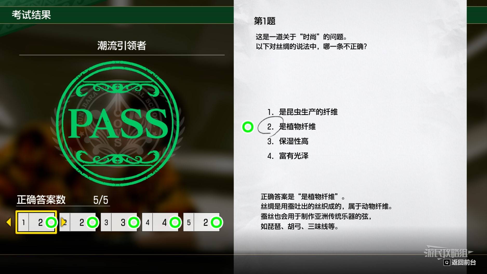 正文摘要:【新手考試攻略心得】關於時尚潮流達人測驗,以下為您帶來完整的考題解析與答案說明。 時尚潮流達人測驗題目與答案總覽 在《人中之龍8外傳 Pirates in Hawaii》中,時尚潮流達人測驗共有10道題目,每題都圍繞著服裝、布料、民族服飾等時尚相關知識進行提問。 👉 GM後台版 遊戲 推薦 ⬇️⬇️⬇️ 快速玩各種二次元動漫手遊app 考試題目詳解 1. 民族服裝考題:正確答案為【短褶裙】 蘇格蘭傳統服飾最具代表性的就是短褶裙。 2. 纖維質地考題:正確答案為【羊絨】 在所有纖維中,羊絨的手感與腈綸最為接近。 3. 纖維分類考題:正確答案為【尼龍】 尼龍屬於化學纖維,既非動物纖維也非植物纖維。 4. 服裝花紋考題:正確答案為【阿蓋爾花紋】 阿蓋爾花紋以菱形為主要設計特色。 5. 絲綢知識考題:正確答案為【是植物纖維】 這個說法不正確,因為絲綢屬於動物纖維。 6. 時尚專業術語考題:正確答案為【Couture】 法語中高級定制服裝店鋪稱為"Haute Couture"。 7. 帽子知識考題:正確答案為【鴨舌帽】 鴨舌帽的名稱源自於狩獵活動。 8. 民族服裝考題:正確答案為【奧黛】 奧黛是越南的傳統民族服裝。 9. 古代服飾考題:正確答案為【托加】 托加是古希臘男性穿著的單片布製成的上衣。 10. 服裝詞源考題:正確答案為【馬球運動】 POLO衫的名稱來源於馬球運動。 以下廣告滑動後還有帖子內容var custom_call_MIR = function (params) {if ( params === null || params.hasAd === false ) {var divRowSide;for (let index = 0; index < ONEADs.length; index++) {if (ONEADs[index].pub.player_mode === "mobile-inread") {divRowSide = ONEADs[index].pub.slotobj;}}var ins = document.createElement('ins');ins.className = 'clickforceads';ins.setAttribute('style', 'display:inline-block;');ins.setAttribute('data-ad-zone', '18264');divRowSide.appendChild(ins);var js = document.createElement('script');js.async = true;js.type = 'text/javascript';js.setAttribute('src', '//cdn.holmesmind.com/js/init.js');js.onload = function(){console.log('[ONEAD MIR] ClickForce Loaded');};divRowSide.appendChild(js);}};var _ONEAD = {};_ONEAD.pub = {};_ONEAD.pub.slotobj = document.getElementById("oneadMIRDFPTag");_ONEAD.pub.slots = ["div-onead-ad"];_ONEAD.pub.uid = "1000509";_ONEAD.pub.external_url = "https://onead.onevision.com.tw/";_ONEAD.pub.scopes = ["spotbuy", "speed"];_ONEAD.pub.player_mode_div = "div-onead-ad";_ONEAD.pub.player_mode = "mobile-inread";_ONEAD.pub.queryAdCallback = custom_call_MIR;var ONEAD_pubs = ONEAD_pubs || [];ONEAD_pubs.push(_ONEAD);var truvidScript = document.createElement('script'); truvidScript.async = true; truvidScript.setAttribute('data-cfasync','false'); truvidScript.type = 'text/javascript'; truvidScript.src = '//stg.truvidplayer.com/index.php?sub_user_id=597&widget_id=3309&playlist_id=2381&m=a&cb=' + (Math.random() * 10000000000000000); var currentScript = document.currentScript || document.scripts[document.scripts.length - 1]; currentScript.parentNode.insertBefore(truvidScript, currentScript.nextSibling); 常見問題Q&A Q1: 這個測驗總共有幾題? A1: 時尚潮流達人測驗總共有10題問答題。 Q2: 考試內容主要涉及哪些領域? A2: 考試主要涉及民族服裝、纖維材質、服裝花紋、時尚術語和服裝歷史等領域。 Q3: 關於絲綢的題目中,為什麼「是植物纖維」是錯誤答案? A3: 因為絲綢是由蠶絲製成,屬於動物纖維,而非植物纖維。 Q4: 什麼是Haute Couture? A4: Haute Couture是法語詞彙,指的是高級定制服裝店鋪。 Q5: 阿蓋爾花紋有什麼特徵? A5: 阿蓋爾花紋最明顯的特徵是以菱形為主要設計元素的花紋圖案。 答案對照表 題號問題類型正確答案1民族服裝短褶裙2纖維質地羊絨3纖維分類尼龍4服裝花紋阿蓋爾花紋5絲綢知識是植物纖維(錯誤說法)6時尚術語Couture7帽子知識鴨舌帽8民族服裝奧黛9古代服飾托加10服裝詞源馬球運動 |