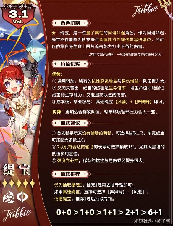 正文摘要:《崩壞星穹鐵道》3.1版本緹寶角色分析與抽取建議 👉 GM後台版 遊戲 推薦 ⬇️⬇️⬇️ 快速玩各種二次元動漫手遊app 緹寶角色機制解析與定位 根據原文圖片顯示,緹寶是一位五星風屬性角色,她的核心定位是同諧命途的治療角色。作為同諧命途治療師,緹寶雖然不能提高隊友的核心屬性,但她可以在提供治療的同時,具備不錯的傷害輸出能力。從圖片左側可以看出,緹寶擁有紅髮,身穿淺色服裝,整體設計風格符合遊戲的美術風格。 緹寶的遊戲邀請語是「歡迎和我們同行,一同到達鮮花芬芳的風風冬天」,這句話也體現了她的風屬性特性。 緹寶角色優勢特點 緹寶具有以下三個主要優勢: 1. 通用型治療能力,擁有稀有的抗性打斷增益與具有傷增特性的治療效果,可為隊伍提供大量的生存保障。 2. 雙向功能輸出,緹寶的傷害是以倍率為基礎計算,傷害值可以提供不俗的輸出能力。這意味著她在提供治療的同時,還能為隊伍帶來額外的傷害輸出,提高整體隊伍的效率。 3. 能量消耗低,操作簡單易上手。高速緹寶配裝推薦使用【風冬套】+【舞舞舞】聖遺物組合,這套配裝可以最大化她的角色特性。 緹寶角色劣勢分析 緹寶的主要劣勢是更適合用於群攻隊伍,對單體環境的作戰能力相對較弱一些。這意味著在針對單一強力敵人的戰鬥中,她的效果可能不如在面對多個敵人時顯著。 以下廣告滑動後還有帖子內容var custom_call_MIR = function (params) {if ( params === null || params.hasAd === false ) {var divRowSide;for (let index = 0; index < ONEADs.length; index++) {if (ONEADs[index].pub.player_mode === "mobile-inread") {divRowSide = ONEADs[index].pub.slotobj;}}var ins = document.createElement('ins');ins.className = 'clickforceads';ins.setAttribute('style', 'display:inline-block;');ins.setAttribute('data-ad-zone', '18264');divRowSide.appendChild(ins);var js = document.createElement('script');js.async = true;js.type = 'text/javascript';js.setAttribute('src', '//cdn.holmesmind.com/js/init.js');js.onload = function(){console.log('[ONEAD MIR] ClickForce Loaded');};divRowSide.appendChild(js);}};var _ONEAD = {};_ONEAD.pub = {};_ONEAD.pub.slotobj = document.getElementById("oneadMIRDFPTag");_ONEAD.pub.slots = ["div-onead-ad"];_ONEAD.pub.uid = "1000509";_ONEAD.pub.external_url = "https://onead.onevision.com.tw/";_ONEAD.pub.scopes = ["spotbuy", "speed"];_ONEAD.pub.player_mode_div = "div-onead-ad";_ONEAD.pub.player_mode = "mobile-inread";_ONEAD.pub.queryAdCallback = custom_call_MIR;var ONEAD_pubs = ONEAD_pubs || [];ONEAD_pubs.push(_ONEAD);var truvidScript = document.createElement('script'); truvidScript.async = true; truvidScript.setAttribute('data-cfasync','false'); truvidScript.type = 'text/javascript'; truvidScript.src = '//stg.truvidplayer.com/index.php?sub_user_id=597&widget_id=3309&playlist_id=2381&m=a&cb=' + (Math.random() * 10000000000000000); var currentScript = document.currentScript || document.scripts[document.scripts.length - 1]; currentScript.parentNode.insertBefore(truvidScript, currentScript.nextSibling); 緹寶抽取建議 針對不同玩家群體,緹寶的抽取建議如下: 1. 首次新手玩家沒有明確的抽取目標時,可以選擇抽取緹寶。她與多位公主角色有良好的配合效果,能夠強化新手隊伍的整體實力。 2. 對於隊伍已經擁有合適輔助型角色的玩家,也可以考慮抽取緹寶,她在大多數的隊伍實用基準中表現優秀。 3. 緹寶是強烈推薦抽取的角色,她稀有的特性與易於提升的能力讓她在遊戲中具有很高的價值。 緹寶抽取策略推薦 在抽取緹寶時,可以參考以下策略: - 優先抽取角色本體,抽完1命後再考慮抽取專武。這表明緹寶的1命就已經具備不錯的實用性。 - 如果使用高速特性的配裝,可以直接選擇【舞舞舞】+【風冬套】聖遺物組合。 - 對於低速配裝策略,建議先抽取1命角色後再考慮專武。 圖片底部顯示了命座推薦順序:0+0 > 1+0 > 1+1 > 2+1 > 6+1,這表明緹寶從0命開始就有不錯的實用性,而1命和專武、2命和專武、滿命和專武是幾個比較顯著的提升節點。 緹寶優缺點對比 優點缺點具備稀有抗性打斷增益與治療效果單體環境作戰能力相對較弱既能治療又能提供可觀傷害輸出在單體Boss戰中效率可能不如專精單一功能的角色能量消耗低,操作簡單易上手需要特定聖遺物組合才能發揮最佳效果與多數公主角色有良好配合可使用【風冬套】+【舞舞舞】強力組合 常見問題Q&A Q1: 緹寶適合新手玩家抽取嗎? A1: 是的,緹寶非常適合新手玩家抽取。她具備治療與傷害輸出的雙重能力,能夠與多位公主角色配合良好,且操作簡單易上手,能量消耗低,可以幫助新手玩家更輕鬆地通過遊戲內容。 Q2: 緹寶需要抽取到多少命座才有較好的實用性? A2: 根據命座推薦順序,緹寶從0命開始就具有不錯的實用性,抽取到1命後會有明顯提升。推薦的命座獲取順序是優先抽取角色到1命,然後再考慮專武。 Q3: 緹寶適合什麼類型的隊伍配置? A3: 緹寶更適合用於群攻隊伍,在面對多個敵人的環境中發揮效果更好。她能夠同時提供治療與傷害輸出,適合需要生存能力與持續輸出的隊伍。 Q4: 緹寶的聖遺物應該如何配置? A4: 高速緹寶推薦使用【風冬套】+【舞舞舞】組合。這套配裝可以最大化她的治療與傷害輸出能力,使其在戰鬥中表現更加出色。 Q5: 緹寶與其他角色相比有什麼獨特優勢? A5: 緹寶的獨特優勢在於她能同時提供治療與傷害輸出,且擁有稀有的抗性打斷增益。她的能量消耗低,操作簡單,即使是新手玩家也能輕鬆掌握,同時她還能與多位公主角色配合得當,在多種