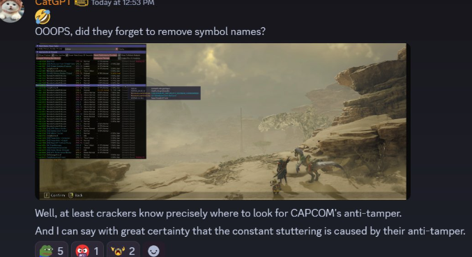 正文摘要:《怪物獵人:荒野》PC版效能問題根源可能找到了 最近許多獵人們反映《怪物獵人:荒野》PC版本出現嚴重卡頓現象,讓玩家們在狩獵過程中遇到不少困擾。根據推特用戶@Pirat_Nation的分享,這款備受期待的動作RPG遊戲在PC平台上實際上採用了三重保護機制,導致效能大幅下降。 據指出,《怪物獵人:荒野》不僅使用了兩個D加密系統,還加入了Capcom自家開發的反篡改系統。這個訊息來源於Reddit上一張被廣泛討論的截圖,其中提到PC版頻繁卡頓的主要原因並非D加密技術本身,而是Capcom額外加入的反篡改技術。 獵人們的遊戲體驗受到影響 對於《怪物獵人:荒野》的忠實玩家來說,這個效能問題無疑影響了遊戲體驗。在狩獵大型魔物時,流暢的操作和即時反應至關重要,然而PC版的卡頓問題讓許多精心設計的戰鬥機制難以發揮作用。 特別是在遊戲中那些需要精準迴避或反擊的關鍵時刻,卡頓可能導致獵人們錯失良機,甚至面臨被魔物擊敗的風險。儘管《怪物獵人:荒野》的遊戲內容相當豐富,但如果基礎的遊戲體驗無法保證,也會大大減低玩家的滿意度。 期待官方回應與解決方案 目前Capcom尚未對此效能問題發表正式聲明。大多數獵人們希望開發團隊能盡快推出優化更新,解決PC版的卡頓問題,讓所有平台的玩家都能享受到流暢的狩獵體驗。 若Capcom確實決定保留這些保護機制,那麼他們需要找到一種平衡方式,既能保護遊戲內容不被非法使用,又能確保正版玩家獲得良好的遊戲體驗。 以下廣告滑動後還有帖子內容var custom_call_MIR = function (params) {if ( params === null || params.hasAd === false ) {var divRowSide;for (let index = 0; index < ONEADs.length; index++) {if (ONEADs[index].pub.player_mode === "mobile-inread") {divRowSide = ONEADs[index].pub.slotobj;}}var ins = document.createElement('ins');ins.className = 'clickforceads';ins.setAttribute('style', 'display:inline-block;');ins.setAttribute('data-ad-zone', '18264');divRowSide.appendChild(ins);var js = document.createElement('script');js.async = true;js.type = 'text/javascript';js.setAttribute('src', '//cdn.holmesmind.com/js/init.js');js.onload = function(){console.log('[ONEAD MIR] ClickForce Loaded');};divRowSide.appendChild(js);}};var _ONEAD = {};_ONEAD.pub = {};_ONEAD.pub.slotobj = document.getElementById("oneadMIRDFPTag");_ONEAD.pub.slots = ["div-onead-ad"];_ONEAD.pub.uid = "1000509";_ONEAD.pub.external_url = "https://onead.onevision.com.tw/";_ONEAD.pub.scopes = ["spotbuy", "speed"];_ONEAD.pub.player_mode_div = "div-onead-ad";_ONEAD.pub.player_mode = "mobile-inread";_ONEAD.pub.queryAdCallback = custom_call_MIR;var ONEAD_pubs = ONEAD_pubs || [];ONEAD_pubs.push(_ONEAD);var truvidScript = document.createElement('script'); truvidScript.async = true; truvidScript.setAttribute('data-cfasync','false'); truvidScript.type = 'text/javascript'; truvidScript.src = '//stg.truvidplayer.com/index.php?sub_user_id=597&widget_id=3309&playlist_id=2381&m=a&cb=' + (Math.random() * 10000000000000000); var currentScript = document.currentScript || document.scripts[document.scripts.length - 1]; currentScript.parentNode.insertBefore(truvidScript, currentScript.nextSibling); 獵人常見問答 (FAQ) **Q1: 什麼是DRM技術?為何會影響遊戲效能?** A1: DRM (數位版權管理) 是一種用於保護數位內容不被盜版的技術。它需要在遊戲運行時進行額外的驗證和檢查,因此可能會消耗系統資源,導致遊戲效能下降,特別是當多種DRM同時運作時。 **Q2: 《怪物獵人:荒野》PC版使用了哪些保護機制?** A2: 根據爆料,遊戲使用了兩個D加密系統,再加上Capcom自家開發的反篡改系統,總共三層保護機制。據信主要造成卡頓的是Capcom的反篡改系統。 **Q3: 有沒有臨時解決方法可以改善PC版的卡頓問題?** A3: 目前玩家可以嘗試降低遊戲畫質設定、關閉不必要的背景程式、更新顯卡驅動程式等基本優化步驟。然而,由於卡頓問題主要源於遊戲本身的保護機制,完全解決可能需要等待官方更新。 **Q4: Capcom為何要在已有D加密的情況下再加入反篡改系統?** A4: 可能的原因包括防止玩家製作和使用MOD、保護遊戲內的付費內容(如捏臉券)不被盜用,或是確保遊戲平衡性不被第三方工具破壞。 **Q5: 主機版本的《怪物獵人:荒野》是否也存在類似問題?** A5: 根據目前的回報,主機版本(如PlayStation 5和Xbox Series X|S)的《怪物獵人:荒野》效能問題較少,這可能是因為主機平台本身就有較強的封閉生態系統,不需要如此嚴格的多重保護機制。 👉 GM後台版 遊戲 推薦 ⬇️⬇️⬇️ 快速玩各種二次元動漫手遊app |