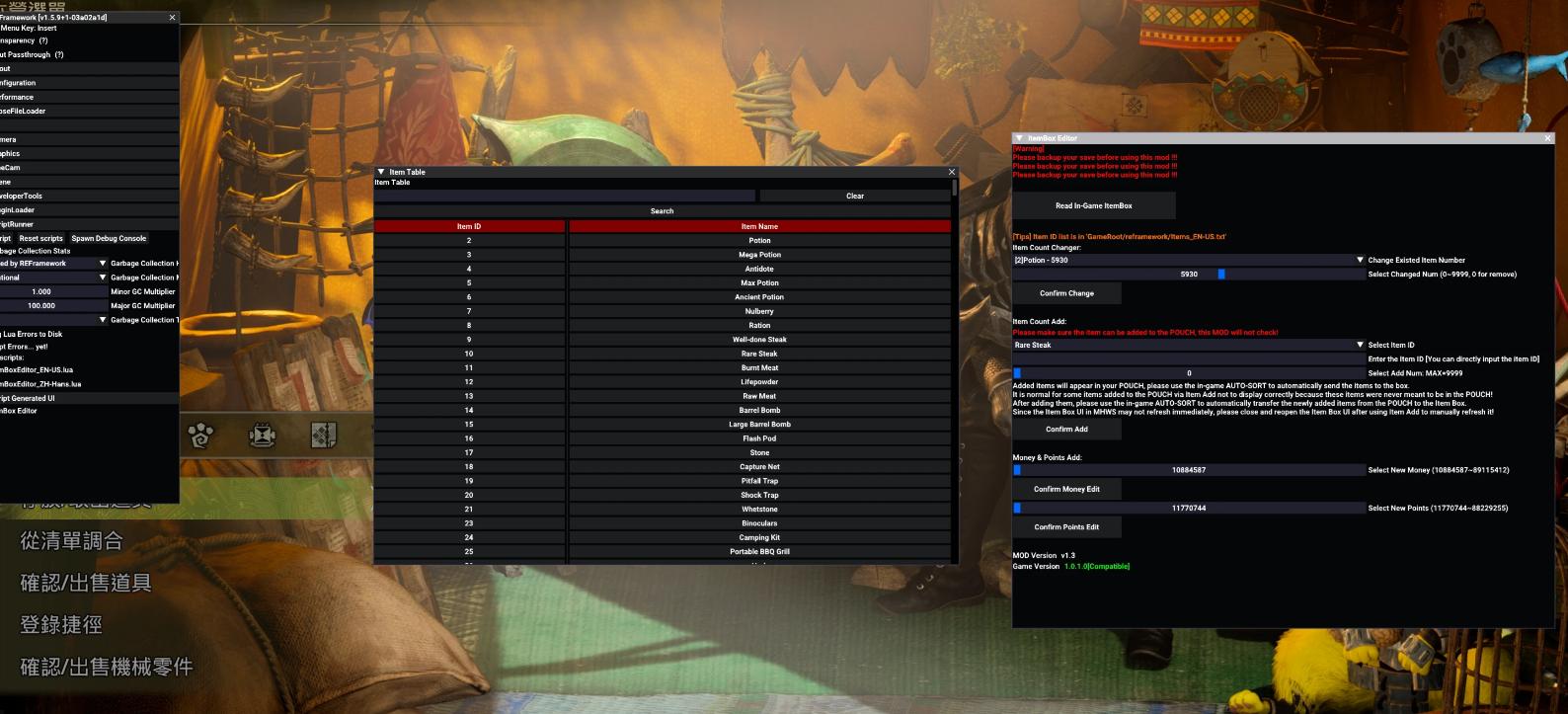 正文摘要:replyreload += ',' + 2376803;《魔物獵人:荒野》道具箱修改器 2025.03.08 最新版本 繁體中文版 【軟 體 名 稱】:Monster Hunter Wilds 道具箱修改器 【軟 體 語 言】:繁體中文/英文 【檔 案 大 小】:依版本而定 【壓 縮 密 碼】:無 【作 業 系 統】:Windows 7/10/11 【軟 體 說 明】:魔物獵人:荒野遊戲道具箱數量修改工具 必備條件 ☑️ REFramework前置模組 ☑️ 原版Monster Hunter Wilds遊戲本體 下載連結 1. 道具箱修改器主程式: 所有站內附件皆會附上安全掃描報告請會員查看純淨度百分比後判斷使用(adsbygoogle = window.adsbygoogle || []).push({});相關檔案須知:取得檔案前,請先詳細閱讀文章內容避免不必要錯誤與誤會發生。也可多參考文章討論樓層內容了解附件檔案相關討論資訊。 【此文章部分內容隱藏中】 解除隱藏說明教學點擊下方 繼續閱讀文章 後請仔細觀看文章內容 並依照指示進行下一步最後完成解除隱藏後系統會回到此文章自動顯示隱藏內容~繼續閱讀 2. REFramework前置模組: REFramework-nightly 3.8下載 安裝步驟 1. 安裝REFramework前置模組 2. 下載道具箱修改器 3. 解壓縮檔案至魔物獵人:荒野遊戲根目錄 4. 確認檔案路徑:./reframework/autorun/ItemBoxEditor_ZH-Hant.lua 使用方法 1. 開啟REFramework選單,展開Script Generated UI 2. 找到「ItemBox Editor」視窗 3. 點擊「Load ItemBox」按鈕讀取道具箱內容 4. 選擇要修改的物品,使用滑桿調整數量 5. 關閉並重新開啟道具箱選單以重新整理修改內容 重要提醒 - 修改後請務必重新開啟道具箱以更新數值 - 物品ID參考檔案位置:./reframework/Items_ZH-Hant.txt - 建議在修改前先備份存檔 常見問題Q&A Q1:為什麼修改後數量沒變化? A1:需要關閉道具箱介面後重新開啟才會更新。 Q2:找不到ItemBox Editor視窗怎麼辦? A2:請確認REFramework是否正確安裝並啟動。 Q3:修改物品會影響遊戲平衡嗎? A3:建議合理使用,過度修改可能影響遊戲體驗。 Q4:可以新增未擁有的物品嗎? A4:可以,但建議參考物品ID列表選擇合法物品。 Q5:存檔會不會出問題? A5:建議在修改前先備份存檔,以防意外發生。 👉 GM後台版 遊戲 推薦 ⬇️⬇️⬇️ 快速玩各種二次元動漫手遊app replyreload += ',' + 2376803; |