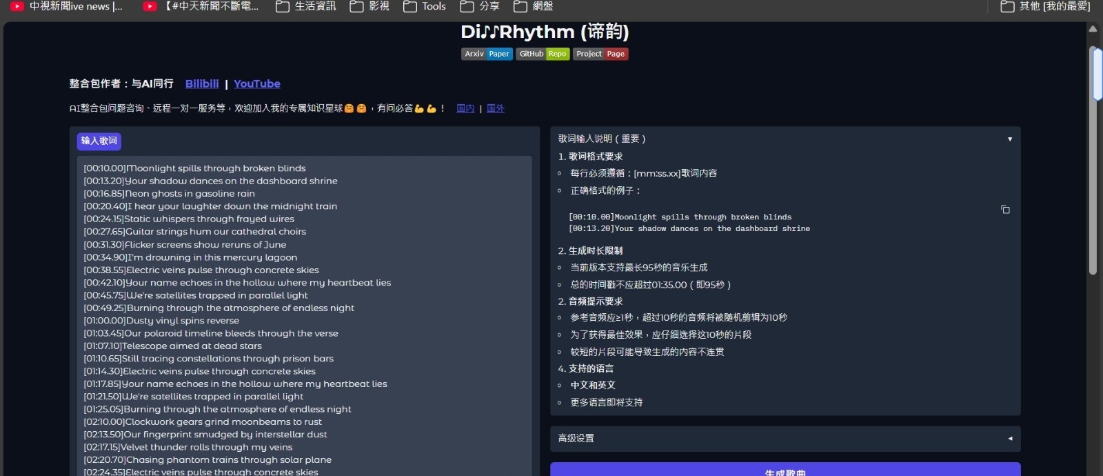 正文摘要:軟體基本資訊 【軟體名稱】DiffRhythm AI Music Generator 【軟體語言】多國語言 【檔案大小】8.8GB 【系統需求】NVIDIA 6GB以上顯卡 【版本類型】免部署版 主要功能特色 ☑️ AI音樂生成功能 - 90秒快速生成 - 中英雙語支援 - 歌詞時間軸控制 - 高品質音訊輸出 使用限制說明 - 最長支援95秒音樂 - 參考音訊需1-10秒 - 顯存需求6GB以上 - 支援中文和英文 歌詞格式要求 標準格式範例: [00:10.00]Moonlight spills through broken blinds [00:13.20]Your shadow dances on the dashboard shrine 必須遵循: - [mm:ss.xx]歌詞內容 - 時間戳不超過01:35.00 - 每行需包含時間標記 以下廣告滑動後還有帖子內容var custom_call_MIR = function (params) {if ( params === null || params.hasAd === false ) {var divRowSide;for (let index = 0; index < ONEADs.length; index++) {if (ONEADs[index].pub.player_mode === "mobile-inread") {divRowSide = ONEADs[index].pub.slotobj;}}var ins = document.createElement('ins');ins.className = 'clickforceads';ins.setAttribute('style', 'display:inline-block;');ins.setAttribute('data-ad-zone', '18264');divRowSide.appendChild(ins);var js = document.createElement('script');js.async = true;js.type = 'text/javascript';js.setAttribute('src', '//cdn.holmesmind.com/js/init.js');js.onload = function(){console.log('[ONEAD MIR] ClickForce Loaded');};divRowSide.appendChild(js);}};var _ONEAD = {};_ONEAD.pub = {};_ONEAD.pub.slotobj = document.getElementById("oneadMIRDFPTag");_ONEAD.pub.slots = ["div-onead-ad"];_ONEAD.pub.uid = "1000509";_ONEAD.pub.external_url = "https://onead.onevision.com.tw/";_ONEAD.pub.scopes = ["spotbuy", "speed"];_ONEAD.pub.player_mode_div = "div-onead-ad";_ONEAD.pub.player_mode = "mobile-inread";_ONEAD.pub.queryAdCallback = custom_call_MIR;var ONEAD_pubs = ONEAD_pubs || [];ONEAD_pubs.push(_ONEAD);var truvidScript = document.createElement('script'); truvidScript.async = true; truvidScript.setAttribute('data-cfasync','false'); truvidScript.type = 'text/javascript'; truvidScript.src = '//stg.truvidplayer.com/index.php?sub_user_id=597&widget_id=3309&playlist_id=2381&m=a&cb=' + (Math.random() * 10000000000000000); var currentScript = document.currentScript || document.scripts[document.scripts.length - 1]; currentScript.parentNode.insertBefore(truvidScript, currentScript.nextSibling); 常見問題Q&A Q1: 需要什麼顯卡規格? A1: 建議6GB以上顯存 Q2: 生成速度多快? A2: 90秒歌曲約1分鐘內完成 Q3: 支援哪些語言? A3: 支援中文和英文 Q4: 需要網路連線嗎? A4: 不需要,可離線使用 Q5: 有長度限制嗎? A5: 最長支援95秒音樂 下載連結: https://katfile.com/f/o4imxduwx0cp1w22r2yo4200d1n221e3 👉 GM後台版 遊戲 推薦 ⬇️⬇️⬇️ 快速玩各種二次元動漫手遊app |