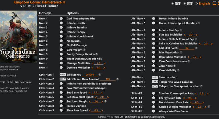正文摘要:replyreload += ',' + 2377820; ## 【軟 體 名 稱】:Kingdom Come: Deliverance II Trainer / 天國降臨:救贖2修改器 ## 【軟 體 語 言】:英文 ## 【檔 案 大 小】:約 8MB ## 【壓 縮 密 碼】:無 ## 【作 業 系 統】:Windows 10/11 ## 【軟 體 說 明】:風靈月影修改器,支援遊戲版本 v1.1-v1.2+,最後更新日期:2025.03.16 ☑️ 天國降臨:救贖2修改器功能介紹 想要在《天國降臨:救贖2》這款硬核中世紀RPG中獲得更多樂趣嗎?風靈月影製作的這款強大修改器提供了41項實用功能,從無敵模式到技能經驗值倍增,讓您在中世紀波希米亞的冒險之旅更加順暢愉快! ☑️ 修改器主要功能列表 角色基本屬性: - Num 1 – 無敵模式/忽略傷害 - Num 2 – 無限生命值 - Num 3 – 無限耐力 - Num 4 – 無限精力 - Num 5 – 無限飽食度 - Num 6 – 無受傷狀態 - Num 7 – 無墜落傷害 - Num 8 – 零重量負擔 - Num 9 – 清空敵人耐力 - Num 0 – 超級傷害/一擊必殺 - Num . – 傷害倍數調整 - Num + – 防禦倍數調整 物品與金錢相關: - Ctrl+Num 1 – 編輯金錢數量 - Ctrl+Num 2 – 編輯點選物品數量 - Ctrl+Num 3 – 物品無限耐久度與新鮮度 - Ctrl+Num 4 – 無需救世者茴香酒即可存檔 - Ctrl+Num 5 – 設定遊戲速度 - Ctrl+Num 6 – 設定移動速度 - Ctrl+Num 7 – 設定跳躍高度 - Ctrl+Num 8 – 凍結日間時間 - Ctrl+Num 9 – 時間流逝速度 坐騎相關: - Alt+Num / – 馬匹:無限耐力 - Alt+Num * – 馬匹:無限衝刺時間 技能與經驗值相關: - Alt+Num 1 – 無限屬性經驗值 - Alt+Num 2 – 屬性經驗值倍數 - Alt+Num 3 – 無限技能與戰鬥經驗值 - Alt+Num 4 – 技能與戰鬥經驗值倍數 - Alt+Num 5 – 編輯技能點數 - Alt+Num 6 – 最大聲望 - Alt+Num 7 – 聲望倍數調整 - Alt+Num 8 – 零可疑度 - Alt+Num 9 – 零噪音值 - Alt+Num 0 – 零可見度 傳送與位置相關: - Alt+Num . – 儲存位置 - Alt+Num + – 傳送到已儲存位置 - Alt+Num - – 傳送到檢查點位置 其他實用功能: - Shift+F2 – 耐力消耗速率調整 - Shift+F3 – 精力消耗速率調整 - Shift+F4 – 飽食度消耗速率調整 - Shift+F5 – 負重倍數調整 - Shift+F6 – 骰子遊戲必勝 ☑️ 修改器下載與安裝教學 1. 點擊下方連結下載「Kingdom Come Deliverance II v1.1-v1.2 Plus 41 Trainer.exe」修改器檔案 2. 下載完成後,將修改器檔案放在方便存取的位置 3. 先啟動《天國降臨:救贖2》遊戲 4. 再開啟修改器程式 5. 使用上述快捷鍵組合來啟用各種功能 免費下載連結: 所有站內附件皆會附上安全掃描報告請會員查看純淨度百分比後判斷使用(adsbygoogle = window.adsbygoogle || []).push({});相關檔案須知:取得檔案前,請先詳細閱讀文章內容避免不必要錯誤與誤會發生。也可多參考文章討論樓層內容了解附件檔案相關討論資訊。 【此文章部分內容隱藏中】 解除隱藏說明教學點擊下方 繼續閱讀文章 後請仔細觀看文章內容 並依照指示進行下一步最後完成解除隱藏後系統會回到此文章自動顯示隱藏內容~繼續閱讀 ☑️ 使用技巧與注意事項 1. 本修改器適用於《天國降臨:救贖2》v1.1-v1.2+版本,若遊戲更新可能需要等待修改器更新 2. 建議在使用修改器前先備份您的遊戲存檔 3. 「無需救世者茴香酒即可存檔」功能特別實用,可以隨時儲存遊戲進度 4. 「零重量負擔」功能讓您可以攜帶無限物品,非常適合收集愛好者 5. 「馬匹:無限耐力」和「馬匹:無限衝刺時間」功能能讓您快速穿越廣闊的中世紀世界 ☑️ 遊戲介紹 《天國降臨:救贖2》是Warhorse StudIOS開發的開放世界角色扮演遊戲,是《天國降臨:救贖》的續作。遊戲設定在15世紀的波希米亞,以高度寫實的方式重現中世紀生活、戰鬥和社會系統。玩家將扮演一位普通人物,在動盪的歷史背景下展開冒險,體驗真實的中世紀生活與戰鬥。 遊戲以其高度寫實的戰鬥系統、複雜的社交互動和開放的遊戲世界而聞名,為玩家提供了一個沉浸式的中世紀RPG體驗。 ☑️ 常見問題解答 Q1: 使用修改器會影響遊戲成就解鎖嗎? A1: 大多數情況下,使用修改器不會影響成就解鎖。但某些遊戲可能有反作弊機制,建議如果您在意成就,可以在完成特定成就後再使用修改器。 Q2: 修改器能在多人遊戲模式中使用嗎? A2: 《天國降臨:救贖2》主要是單人遊戲體驗,修改器設計用於單人模式。在多人或線上模式中使用修改器可能會導致遊戲不穩定或違反服務條款。 Q3: 為什麼我啟用某些功能後遊戲變得不穩定? A3: 同時啟用太多修改功能可能會導致遊戲不穩定。建議根據需要選擇性地啟用功能,而非一次啟用所有功能。 Q4: 如何解決修改器與遊戲不相容的問題? A4: 確保您的遊戲版本與修改器支援的版本相符(v1.1-v1.2+)。如果遊戲有更新,可能需要等待修改器也更新到相應版本。 Q5: 「編輯技能點數」功能如何正確使用? A5: 啟用此功能(Alt+Num 5)後,遊戲會彈出一個輸入框,您可以輸入想要的技能點數值。建議輸入合理範圍內的數值,過高的數值可能導致遊戲不穩定。 👉 GM後台版 遊戲 推薦 ⬇️⬇️⬇️ 快速玩各種二次元動漫手遊appreplyreload += ',' + 2377820; |