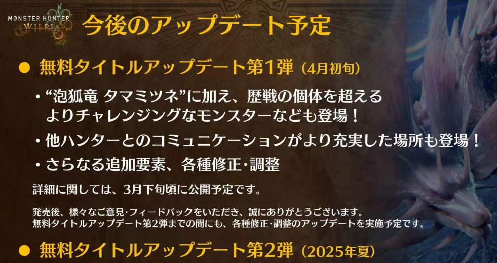 正文摘要:《魔物獵人:荒野》首波重大更新預告 各位獵人們注意了!Capcom 近日公開了《魔物獵人:荒野》(Monster Hunter Wilds)的最新更新計畫,首個免費大型更新預計將於 2025 年 4 月初推出,而第二波更新則安排在 2025 年夏季。這波更新不僅帶來全新的挑戰魔物,還有多項遊戲機制的優化調整,將為獵人們帶來更豐富的狩獵體驗! 第一波更新內容:泡狐龍強勢登場 根據官方公布的資訊,2025 年 4 月即將推出的第一波免費更新將包含以下重點內容: 全新魔物:泡狐龍回歸 泡狐龍(タマミツネ,又稱「天狗獸」)將正式登陸《魔物獵人:荒野》的生態系統!這隻優雅且充滿東方韻味的魔物,以其獨特的泡沫攻擊和靈活的動作聞名,相信將為獵人們帶來全新的狩獵挑戰。 除了泡狐龍外,官方還透露將推出比歷史戰鬥個體更具挑戰性的魔物。這意味著獵人們將面臨比傳統的「歷戰個體」更為強大的對手,可能會引入全新的魔物強化機制,為高階獵人提供更激烈的狩獵體驗。 社交系統全面升級 《魔物獵人:荒野》的開發團隊正致力於改進遊戲中的社交互動體驗,預計將帶來以下優化: - 組隊配對系統的完善,讓獵人更容易找到志同道合的夥伴 - 新增獵人之間的交流功能,強化團隊合作 - 可能引入類似《魔物獵人:世界》中的集會所系統,讓玩家能在特定區域輕鬆交流、組隊 這些改進將大幅提升多人遊玩時的體驗,讓獵人們能更便捷地分享狩獵心得和策略。 遊戲機制調整與優化 除了新魔物和社交功能外,本次更新還將帶來多項遊戲機制的調整,包括: - 武器平衡性調整,確保各類武器在狩獵中發揮最佳效能 - 可能新增特殊任務類型,為高階獵人提供更具挑戰性的內容 - 優化遊戲界面與操作流程,提升整體遊戲體驗 官方表示,關於第一波更新的更多詳細資訊將於 3 月下旬公布,獵人們敬請關注後續消息! 夏季第二波更新展望 雖然官方目前尚未透露 2025 年夏季推出的第二波更新具體內容,但根據《魔物獵人》系列的更新慣例,我們可以推測可能會包含: - 全新魔物登場,可能會是系列中的人氣魔物回歸或全新創作的強力魔物 - 新增生態區域或現有區域的擴展,帶來更多探索空間 - 引入類似「極限歷戰」或「特別調查」的高難度任務 - 新增特別裝備系統或武器強化機制 - 進一步優化遊戲體驗,完善當前遊戲系統 以下廣告滑動後還有帖子內容var custom_call_MIR = function (params) {if ( params === null || params.hasAd === false ) {var divRowSide;for (let index = 0; index < ONEADs.length; index++) {if (ONEADs[index].pub.player_mode === "mobile-inread") {divRowSide = ONEADs[index].pub.slotobj;}}var ins = document.createElement('ins');ins.className = 'clickforceads';ins.setAttribute('style', 'display:inline-block;');ins.setAttribute('data-ad-zone', '18264');divRowSide.appendChild(ins);var js = document.createElement('script');js.async = true;js.type = 'text/javascript';js.setAttribute('src', '//cdn.holmesmind.com/js/init.js');js.onload = function(){console.log('[ONEAD MIR] ClickForce Loaded');};divRowSide.appendChild(js);}};var _ONEAD = {};_ONEAD.pub = {};_ONEAD.pub.slotobj = document.getElementById("oneadMIRDFPTag");_ONEAD.pub.slots = ["div-onead-ad"];_ONEAD.pub.uid = "1000509";_ONEAD.pub.external_url = "https://onead.onevision.com.tw/";_ONEAD.pub.scopes = ["spotbuy", "speed"];_ONEAD.pub.player_mode_div = "div-onead-ad";_ONEAD.pub.player_mode = "mobile-inread";_ONEAD.pub.queryAdCallback = custom_call_MIR;var ONEAD_pubs = ONEAD_pubs || [];ONEAD_pubs.push(_ONEAD);var truvidScript = document.createElement('script'); truvidScript.async = true; truvidScript.setAttribute('data-cfasync','false'); truvidScript.type = 'text/javascript'; truvidScript.src = '//stg.truvidplayer.com/index.php?sub_user_id=597&widget_id=3309&playlist_id=2381&m=a&cb=' + (Math.random() * 10000000000000000); var currentScript = document.currentScript || document.scripts[document.scripts.length - 1]; currentScript.parentNode.insertBefore(truvidScript, currentScript.nextSibling); 獵人必讀:常見問題解答 Q1: 泡狐龍是什麼樣的魔物?適合用什麼武器對付? A1: 泡狐龍是一種靈活且優雅的兩足飛龍,擅長利用泡沫進行攻擊並能在泡沫上滑行。對付泡狐龍時,建議使用具有較高機動性的武器如雙劍、太刀或操蟲棍,以應對其快速的移動和攻擊模式。 Q2: 新更新是否需要額外付費? A2: 根據官方公告,這兩波更新都是免費的標題更新(Title Update),所有《魔物獵人:荒野》玩家都可以免費獲取這些內容。 Q3: 更新後能否繼續使用之前的存檔? A3: 是的,標題更新通常不會影響現有存檔。玩家可以繼續使用更新前的存檔,並體驗新增的內容。 Q4: 歷戰個體和新挑戰有什麼區別? A4: 雖然官方尚未詳細說明,但根據描述,新的挑戰魔物將比傳統的歷戰個體更具挑戰性。可能會有更高的血量、更強的攻擊力或全新的攻擊模式,為高階獵人提供更極致的狩獵體驗。 Q5: 如何準備迎接新更新的挑戰? A5: 獵人們可以通過以下方式做好準備:完善自己的裝備配置、熟練掌握武器操作技巧、收集稀有素材製作高級裝備、與其他獵人組隊練習協作狩獵策略。在更新前提升自己的獵人等級和裝備強度,將有助於更好地應對新挑戰。 👉 GM後台版 遊戲 推薦 ⬇️⬇️⬇️ 快速玩各種二次元動漫手遊app |