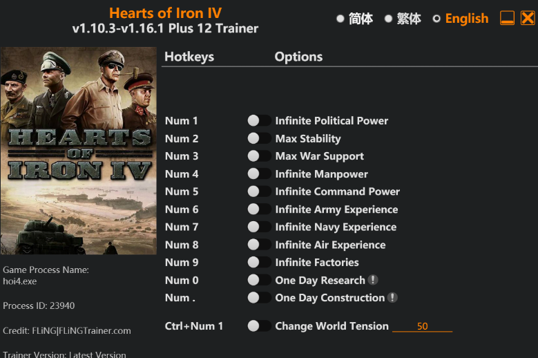 正文摘要:replyreload += ',' + 2378212; ☑️ 鋼鐵雄心IV 修改器資訊 **版本: v1.10.3-v1.16.1+ | 更新日期: 2025.03.19** 風靈月影免費修改器詳細功能說明 這款專為《鋼鐵雄心IV》(Hearts of Iron IV)設計的修改器提供了12種強大功能,能讓您在遊戲中輕鬆掌控全局!無論您是戰略新手還是資深玩家,這款修改器都能幫助您突破遊戲限制,體驗不同的遊戲樂趣。 修改器功能列表 本修改器支援以下12項強大功能: - **Num 1** – 無限政治點數 (Infinite Political Power) - **Num 2** – 最大穩定度 (Max Stability) - **Num 3** – 最大戰爭支持度 (Max War Support) - **Num 4** – 無限人力資源 (Infinite Manpower) - **Num 5** – 無限指揮點數 (Infinite Command Power) - **Num 6** – 無限陸軍經驗 (Infinite Army Experience) - **Num 7** – 無限海軍經驗 (Infinite Navy Experience) - **Num 8** – 無限空軍經驗 (Infinite Air Experience) - **Num 9** – 無限工廠 (Infinite Factories) - **Num 0** – 一日研發完成 (One Day Research) - **Num .** – 一日建設完成 (One Day Construction) - **Ctrl+Num 1** – 修改世界緊張度 (Change World Tension) 使用方法與安裝步驟 1. 從下方提供的載點下載修改器檔案 2. 解壓縮下載的檔案(若有密碼請使用提供的密碼) 3. 啟動《鋼鐵雄心IV》遊戲 4. 運行修改器程式「Hearts of Iron IV v1.10.3-v1.16.1 Plus 12 Trainer.exe」 5. 在遊戲中按下對應的數字鍵即可啟用相應功能 相容性與支援版本 本修改器完全支援《鋼鐵雄心IV》v1.10.3至v1.16.1+版本,包含最新DLC。無論您使用Steam版本還是其他合法版本,都能完美運作。 修改器優勢與特色 - **全面功能**:涵蓋政治、軍事、經濟等多方面修改 - **簡單操作**:只需按下對應按鍵即可啟用功能 - **穩定可靠**:經過充分測試,確保與遊戲相容性 - **免費使用**:完全免費,無需付費即可體驗全部功能 - **定期更新**:隨遊戲版本更新而更新,保持相容性 下載連結 **Free Download: Hearts of Iron IV v1.10.3-v1.16.1 Plus 12 Trainer.exe** 所有站內附件皆會附上安全掃描報告請會員查看純淨度百分比後判斷使用(adsbygoogle = window.adsbygoogle || []).push({});相關檔案須知:取得檔案前,請先詳細閱讀文章內容避免不必要錯誤與誤會發生。也可多參考文章討論樓層內容了解附件檔案相關討論資訊。 【此文章部分內容隱藏中】 解除隱藏說明教學點擊下方 繼續閱讀文章 後請仔細觀看文章內容 並依照指示進行下一步最後完成解除隱藏後系統會回到此文章自動顯示隱藏內容~繼續閱讀 常見問題Q&A **Q1: 這個修改器會影響遊戲成就嗎?** A1: 是的,使用修改器會導致遊戲成就無法解鎖。如果您重視成就系統,建議在不需要解鎖成就的存檔中使用。 **Q2: 修改器可以在多人遊戲中使用嗎?** A2: 不建議在多人遊戲中使用,可能會導致遊戲不同步或被伺服器檢測並踢出。修改器主要設計用於單人遊戲體驗。 **Q3: 使用修改器後遊戲崩潰怎麼辦?** A3: 請確認您的遊戲版本與修改器支援版本相符。如果問題持續,可以嘗試關閉其他背景程式或重新安裝修改器。 **Q4: 修改器是否有病毒風險?** A4: 本文提供的下載連結經過安全檢查,但建議在下載後使用防毒軟體掃描,並從可信來源下載。 **Q5: 如何關閉已啟用的修改器功能?** A5: 再次按下相應的按鍵組合可以關閉已啟用的功能,或者直接關閉修改器程式也能恢復遊戲正常狀態。 👉 GM後台版 遊戲 推薦 ⬇️⬇️⬇️ 快速玩各種二次元動漫手遊appreplyreload += ',' + 2378212; |