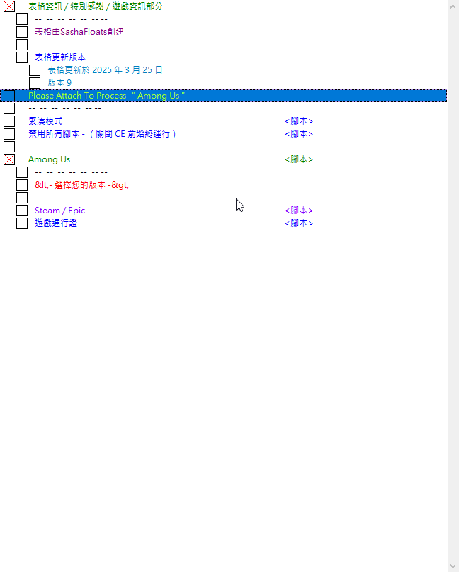 正文摘要:replyreload += ',' + 2379207; 【軟 體 名 稱】:Among Us Cheat Table (Among Us 修改表) 【軟 體 語 言】:英文/中文 【檔 案 大 小】:512 KB 【壓 縮 密 碼】:無 【作 業 系 統】:Windows 7/8/10/11 【軟 體 說 明】:Among Us 外掛修改表,可顯示所有玩家角色,讓你輕鬆找出內鬼 Among Us 外掛修改表介紹 這款 Among Us Cheat Table 外掛修改表能夠讓你查看遊戲中所有玩家的角色,讓找出內鬼變得輕而易舉!本修改表已在 Steam、Gamepass 和 Epic 平台上測試並確認可用。 支援遊戲版本 - Steam 版本:V2023.3.28S - Epic 版本:V2023.3.28E - Gamepass 版本:V2023.3.28M 最新版本功能 目前最新版本為 Version 9,於 2025 年 3 月 25 日更新。此版本新增了玩家投票快速更改選項(需要是房主才能使用)。 下載指南 1. 首先需要下載 Cheat Engine(CE修改器)7.5 漢化版: 下載連結:Cheat Engine 7.5 漢化版 2. 接著下載 Among Us Cheat Table V9 中文版: 所有站內附件皆會附上安全掃描報告請會員查看純淨度百分比後判斷使用(adsbygoogle = window.adsbygoogle || []).push({});相關檔案須知:取得檔案前,請先詳細閱讀文章內容避免不必要錯誤與誤會發生。也可多參考文章討論樓層內容了解附件檔案相關討論資訊。 【此文章部分內容隱藏中】 解除隱藏說明教學點擊下方 繼續閱讀文章 後請仔細觀看文章內容 並依照指示進行下一步最後完成解除隱藏後系統會回到此文章自動顯示隱藏內容~繼續閱讀 使用方法 1. 安裝並運行 Cheat Engine 7.5 2. 開啟 Among Us 遊戲 3. 在 Cheat Engine 中點擊左上角的電腦圖標,選擇 Among Us 進程 4. 點擊「檔案」->「打開」,選擇下載好的 AmongUsV9_ZH.ct 檔案 5. 勾選你想啟用的功能 6. 進入遊戲後,你就能看到所有玩家的角色身份 常見問題 Q&A Q1: 這個修改表會被遊戲偵測到嗎? A1: Among Us 目前沒有強大的反作弊系統,但仍建議在私人房間與朋友使用,避免在公開遊戲中使用,以免影響他人遊戲體驗。 Q2: 為什麼我無法看到其他玩家的角色? A2: 請確認你已正確勾選「顯示所有玩家角色」選項,並且已在 Cheat Engine 中選擇了正確的 Among Us 進程。 Q3: 修改表支援哪些平台的 Among Us? A3: 此修改表支援 Steam、Epic Games 和 Xbox Game Pass 版本的 Among Us。 Q4: 快速更改投票功能如何使用? A4: 首先你必須是房主,然後在投票界面啟用此功能,就可以更改玩家的投票對象。請注意,濫用此功能可能會被其他玩家察覺。 Q5: 如果遊戲更新後修改表不能用了怎麼辦? A5: 遊戲更新後通常需要等待修改表作者更新對應版本。建議定期查看原下載頁面或相關論壇以獲取最新版本。 👉 GM後台版 遊戲 推薦 ⬇️⬇️⬇️ 快速玩各種二次元動漫手遊appreplyreload += ',' + 2379207; |