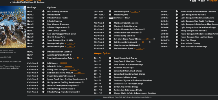 正文摘要:replyreload += ',' + 2380188; 【軟 體 名 稱】:Monster Hunter Wilds Trainer (魔物獵人:荒野修改器) 【軟 體 語 言】:英文/多國語言 【檔 案 大 小】:約 15MB 【壓 縮 密 碼】:無 【作 業 系 統】:Windows 10/11 【軟 體 說 明】:Monster Hunter Wilds 專用修改器,支援 v1.0-v20250310+ 版本,最後更新日期:2025.04.02 《魔物獵人:荒野》修改器介紹 這款為《魔物獵人:荒野》精心打造的修改器提供了多達61種功能選項,讓獵人們能夠依照自己的喜好調整遊戲難度和體驗。無論你是想輕鬆享受遊戲劇情,還是想挑戰極限,這款修改器都能滿足你的需求。 修改器功能列表 基本功能: • Num 1 – 無敵模式/無視傷害 • Num 2 – 無限生命值 • Num 3 – 無限隨從貓咪生命值 • Num 4 – 無限耐力 • Num 5 – 武器鋒利度最大化 • Num 6 – 無限彈射器彈藥 • Num 7 – 100%暴擊率 • Num 8 – 輕鬆擊暈/擊退/擊倒 • Num 9 – 一擊破壞部位 • Num 0 – 超級傷害/一擊必殺 • Num . – 傷害倍率調整 • Num + – 防禦倍率調整 進階功能: • Num / – 無限食物效果持續時間 • Num * – 自動回復生命值 • Num – – 耐力消耗率調整 資源相關功能: • Ctrl+Num 1 – 修改金錢 • Ctrl+Num 2 – 修改公會點數 • Ctrl+Num 3 – 拾取物品倍率 • Ctrl+Num 4 – 修改物品箱物品數量 • Ctrl+Num 5 – 隨身物品不會減少 • Ctrl+Num 6 – 忽略物品合成需求 • Ctrl+Num 7 – 無裝備製作需求 • Ctrl+Num 8 – 解鎖所有裝備藍圖 • Ctrl+Num 9 – 無限從屍體採集 • Ctrl+Num 0 – 無限從環境採集 遊戲環境功能: • Ctrl+Num . – 設定遊戲速度 • Ctrl+Num / – 凍結時間 • Ctrl+Num * – 時間+1小時 特殊道具功能: • Alt+Num 1 – 披風:立即冷卻 • Alt+Num 2 – 披風:無限持續時間 • Alt+Num 3 – 無限角色編輯券 • Alt+Num 4 – 無限隨從貓咪編輯券 • Alt+Num 5 – 無限幸運券 • Alt+Num 6 – 獲得更多任務獎勵物品 • Alt+Num 7 – 修改裝飾品數量 • Alt+Num 8 – 裝飾品技能等級最大化 • Alt+Num 9 – 設定移動速度 武器專屬功能 近戰武器功能: • Ctrl+F1 – 大劍:快速蓄力 • Ctrl+F2 – 太刀:靈氣槽最大化 • Ctrl+F3 – 雙刀:鬼人槽最大化 • Ctrl+F4 – 大鎚:快速蓄力 • Ctrl+F5 – 長槍:快速衝刺攻擊蓄力 • Ctrl+F6 – 長槍:快速反擊蓄力 • Ctrl+F7 – 銃槍:無限彈藥 • Ctrl+F8 – 銃槍:龍擊炮立即冷卻 • Ctrl+F9 – 銃槍:快速全爆發蓄力 • Ctrl+F10 – 斬擊斧:無限能量 • Ctrl+F11 – 斬擊斧:進入增幅狀態 • Ctrl+F12 – 充能斧:無限強化持續時間 遠程武器功能: • Shift+F1 – 操蟲棍:無限精華持續時間 • Shift+F2 – 輕弩:無需裝填 • Shift+F3 – 輕弩:無限特殊彈藥 • Shift+F4 – 輕弩:連射槽最大化 • Shift+F5 – 輕弩:無限集中爆破彈藥 • Shift+F6 – 輕弩:快速集中爆破蓄力 • Shift+F7 – 重弩:無需裝填 • Shift+F8 – 重弩:無限集中爆破彈藥 • Shift+F9 – 重弩:點火槽最大化 • Shift+F10 – 弓:快速蓄力 • Shift+F11 – 弓:無限塗層 • Shift+F12 – 弓:特殊箭槽最大化 安裝與使用說明 此修改器使用 praydog 開發的 REFramework 來繞過遊戲的反作弊保護。請按照以下步驟安裝 REFramework: 1. 將 "dinput8.dll" 複製到遊戲根目錄(即可以找到 MonsterHunterWilds.exe 的位置) 2. 啟動遊戲 如果遊戲更新,您可能需要更新 REFramework,可以在 Github 上找到最新版本: https://github.com/praydog/REFramework-nightly/releases 下載連結 《魔物獵人:荒野》REFramework-nightly 3.27前置MOD更新 必備框架載點: https://www.game735.com/thread-412969-1-1.html Monster.Hunter.Wilds.v1.0-v20250310.Plus.61.Trainer-FLiNG.zip: 所有站內附件皆會附上安全掃描報告請會員查看純淨度百分比後判斷使用(adsbygoogle = window.adsbygoogle || []).push({});相關檔案須知:取得檔案前,請先詳細閱讀文章內容避免不必要錯誤與誤會發生。也可多參考文章討論樓層內容了解附件檔案相關討論資訊。 【此文章部分內容隱藏中】 解除隱藏說明教學點擊下方 繼續閱讀文章 後請仔細觀看文章內容 並依照指示進行下一步最後完成解除隱藏後系統會回到此文章自動顯示隱藏內容~繼續閱讀 常見問題解答 Q1: 使用修改器會被官方封號嗎? A1: 修改器僅影響單人遊戲體驗,但仍建議不要在多人連線模式下使用,以避免可能的風險。 Q2: 為什麼我安裝了修改器但功能無法使用? A2: 請確認您已正確安裝 REFramework 前置框架,並確認修改器版本與遊戲版本相符。 Q3: 使用修改器後遊戲出現崩潰怎麼辦? A3: 請嘗試關閉部分功能,某些功能組合可能導致遊戲不穩定。也可以嘗試更新至最新版本的 REFramework。 Q4: 修改器能在所有平台上使用嗎? A4: 此修改器僅支援 PC 版本的《魔物獵人:荒野》,主機版本無法使用。 Q5: 如何更新修改器以適配遊戲新版本? A5: 請定期關注發布頁面,開發者通常會在遊戲更新後發布相應的修改器更新版本。 👉 GM後台版 遊戲 推薦 ⬇️⬇️⬇️ 快速玩各種二次元動漫手遊appreplyreload += ',' + 2380188; |