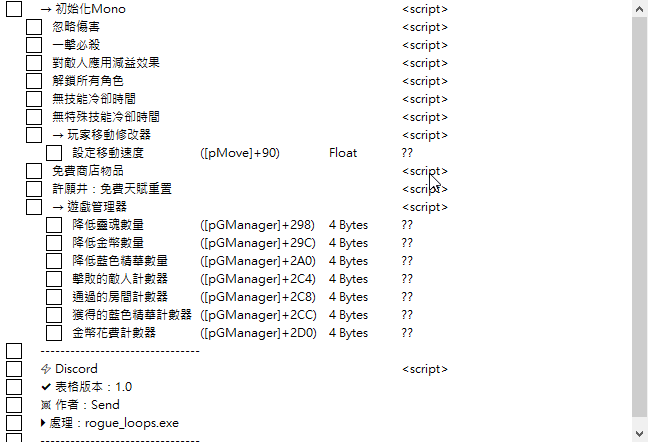 正文摘要:replyreload += ',' + 2380578; 【軟 體 名 稱】:Rogue Loops 輔助工具 【軟 體 語 言】:英文/中文 【檔 案 大 小】:小於 1MB 【壓 縮 密 碼】:無 【作 業 系 統】:Windows 【軟 體 說 明】:Rogue Loops 遊戲輔助工具,提供多種遊戲功能調整選項 《Rogue Loops》遊戲介紹 《Rogue Loops》是一款在Steam平台上發行的Roguelike遊戲,玩家需要在不斷重複的循環中提升自己的能力,挑戰各種敵人。遊戲特色包含多種可解鎖角色、技能冷卻系統、以及資源收集等元素。 遊戲官方連結:Steam商店頁面 輔助工具功能說明 本次分享的《Rogue Loops》輔助工具提供了多種功能選項,讓您能夠依照自己的喜好調整遊戲難度和體驗。以下是主要功能: • 無視傷害 - 啟用後角色不會受到任何傷害 • 一擊必殺 - 讓您能夠一擊擊敗所有敵人 • 對敵人施加減益效果 - 可對敵人施加各種負面狀態 • 解鎖所有角色 - 立即獲得遊戲中的所有可玩角色 • 無技能冷卻 - 技能可以連續使用,不需等待冷卻時間 • 無特殊技能冷卻 - 特殊技能可以連續使用 • 設定移動速度 - 自訂角色移動速度 • 商店物品免費 - 在商店中購買物品不需花費資源 遊戲管理器功能 除了基本功能外,輔助工具還提供了以下遊戲數據調整選項: • 靈魂掉落數量調整 - 自訂敵人掉落的靈魂數量 • 金幣掉落數量調整 - 自訂敵人掉落的金幣數量 • 藍色精華掉落數量調整 - 自訂敵人掉落的藍色精華數量 • 擊殺敵人計數器 - 顯示已擊殺敵人數量 • 已清理房間計數器 - 顯示已清理房間數量 • 獲得藍色精華計數器 - 顯示已獲得的藍色精華數量 • 花費金幣計數器 - 顯示已花費的金幣數量 使用方法 1. 下載並安裝《Cheat Engine》工具 2. 下載本文提供的 Rogue Loops CT 檔案 3. 運行 Rogue Loops 遊戲 4. 開啟 Cheat Engine 並載入對應的 CT 檔案 5. 在 Cheat Engine 中選擇 Rogue Loops 遊戲進程 6. 勾選您想要啟用的功能選項 7. 返回遊戲即可享受修改後的遊戲體驗 下載連結 Cheat Engine 中文化版: 《Cheat Engine》V7.6 中文化版超強記憶體解鎖工具:遊戲外掛製作神器! Rogue Loops 英文版 CT 檔案: Download Link Rogue Loops 中文版 CT 檔案: 所有站內附件皆會附上安全掃描報告請會員查看純淨度百分比後判斷使用(adsbygoogle = window.adsbygoogle || []).push({});相關檔案須知:取得檔案前,請先詳細閱讀文章內容避免不必要錯誤與誤會發生。也可多參考文章討論樓層內容了解附件檔案相關討論資訊。 【此文章部分內容隱藏中】 解除隱藏說明教學點擊下方 繼續閱讀文章 後請仔細觀看文章內容 並依照指示進行下一步最後完成解除隱藏後系統會回到此文章自動顯示隱藏內容~繼續閱讀 注意事項 1. 本工具僅供學習和研究用途,請勿用於商業或不當用途 2. 使用輔助工具可能會影響遊戲平衡性和樂趣,建議適度使用 3. 某些功能可能會因遊戲版本更新而失效,請留意更新情況 4. 使用前建議先備份遊戲存檔,避免發生不可預期的問題 常見問題 Q&A Q1: 為什麼我無法使用「解鎖所有角色」功能? A1: 請確認您已正確載入CT檔案,並且已選擇正確的遊戲進程。某些遊戲版本可能需要特定的CT檔案版本才能正常運作。 Q2: 使用這些輔助功能會被遊戲官方封號嗎? A2: 《Rogue Loops》是單機遊戲,一般不會有封號問題,但我們仍建議謹慎使用,避免影響遊戲體驗。 Q3: 中文版和英文版CT檔案有什麼區別? A3: 中文版CT檔案的介面和選項說明是中文的,更適合中文用戶使用,功能上兩者基本相同。 Q4: 我可以同時開啟多個輔助功能嗎? A4: 是的,您可以根據自己的需求同時啟用多個功能,但某些功能之間可能會相互影響,建議測試後再決定組合。 Q5: 更新遊戲後輔助工具失效怎麼辦? A5: 遊戲更新後,原有的CT檔案可能會失效。此時需要等待新版CT檔案發布,或嘗試自行調整參數以適應新版本。 👉 GM後台版 遊戲 推薦 ⬇️⬇️⬇️ 快速玩各種二次元動漫手遊appreplyreload += ',' + 2380578; |