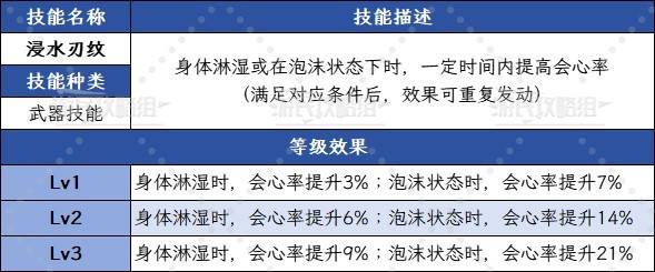 新增技能對比表格整理 技能名稱主要效果觸發條件持續時間備註浸水刃紋最高+30%會心率淋濕+泡沫雙重狀態約25秒環境或泡狐龍套裝輔助白熾奔流固定追加50傷害特定招式命中,有冷卻約3秒冷卻搭配灼熱化傷害更高泡