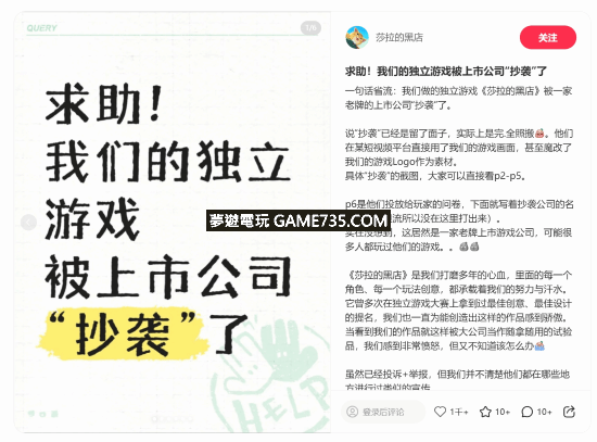 正文摘要:獨立遊戲《莎拉的黑店》控訴遭大廠抄襲,事件延燒! 還記得之前我們報導過的獨立遊戲《莎拉的黑店》開發團隊,在社群媒體上發出求助訊息,控訴自家遊戲遭到某上市公司「抄襲」的事件嗎? 據悉,這家公司不僅直接盜用了《莎拉的黑店》的遊戲畫面,甚至還將遊戲Logo進行魔改,作為自己的宣傳素材,行徑相當囂張! 看來這起抄襲事件,背後似乎還隱藏著更多不為人知的內幕。究竟是誰在冒用《江湖客棧》的名義進行抄襲?《莎拉的黑店》又該如何捍衛自己的權益?後續發展,我們將持續關注! 以下廣告滑動後還有帖子內容var custom_call_MIR = function (params) {if ( params === null || params.hasAd === false ) {var divRowSide;for (let index = 0; index < ONEADs.length; index++) {if (ONEADs[index].pub.player_mode === "mobile-inread") {divRowSide = ONEADs[index].pub.slotobj;}}var ins = document.createElement('ins');ins.className = 'clickforceads';ins.setAttribute('style', 'display:inline-block;');ins.setAttribute('data-ad-zone', '18264');divRowSide.appendChild(ins);var js = document.createElement('script');js.async = true;js.type = 'text/javascript';js.setAttribute('src', '//cdn.holmesmind.com/js/init.js');js.onload = function(){console.log('[ONEAD MIR] ClickForce Loaded');};divRowSide.appendChild(js);}};var _ONEAD = {};_ONEAD.pub = {};_ONEAD.pub.slotobj = document.getElementById("oneadMIRDFPTag");_ONEAD.pub.slots = ["div-onead-ad"];_ONEAD.pub.uid = "1000509";_ONEAD.pub.external_url = "https://onead.onevision.com.tw/";_ONEAD.pub.scopes = ["spotbuy", "speed"];_ONEAD.pub.player_mode_div = "div-onead-ad";_ONEAD.pub.player_mode = "mobile-inread";_ONEAD.pub.queryAdCallback = custom_call_MIR;var ONEAD_pubs = ONEAD_pubs || [];ONEAD_pubs.push(_ONEAD);var truvidScript = document.createElement('script'); truvidScript.async = true; truvidScript.setAttribute('data-cfasync','false'); truvidScript.type = 'text/javascript'; truvidScript.src = '//stg.truvidplayer.com/index.php?sub_user_id=597&widget_id=3309&playlist_id=2381&m=a&cb=' + (Math.random() * 10000000000000000); var currentScript = document.currentScript || document.scripts[document.scripts.length - 1]; currentScript.parentNode.insertBefore(truvidScript, currentScript.nextSibling); 常見問題Q&A Q: 《莎拉的黑店》是一款什麼樣的遊戲? A: 《莎拉的黑店》是一款獨立遊戲,具體遊戲類型和玩法需要參考更多資訊。 Q: 為什麼《莎拉的黑店》會指控其他公司抄襲? A: 因為該公司直接使用了《莎拉的黑店》的遊戲畫面,還對遊戲Logo進行了修改,作為自己的宣傳素材。 Q: 《江湖客棧》的版號資訊顯示的營運公司是哪一家? A: 上海盛展網路科技有限公司。 Q: 北京暢遊時代數碼技術有限公司和《江湖客棧》有什麼關係? A: 目前資訊顯示,北京暢遊時代數碼技術有限公司也使用「江湖客棧」這個名稱,但可能並未獲得正版授權。 Q: 如果《江湖客棧》真的被抄襲,《江湖客棧》製作團隊將會怎麼做? A: 他們表示將會採取法律途徑,進行維權和起訴。 👉 GM後台版 遊戲 推薦 ⬇️⬇️⬇️ 快速玩各種二次元動漫手遊app |