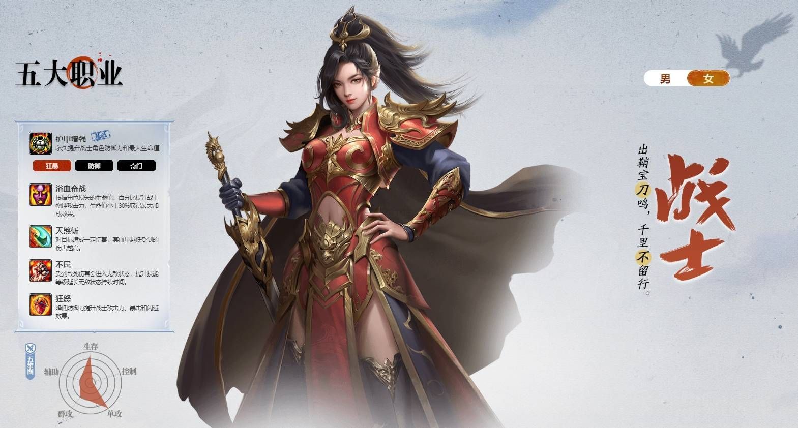 狂暴戰士核心特性概述 戰士職業在《王者征途》中扮演著近戰物理輸出的角色,主打一個攻守兼備的遊戲風格。作為戰士的一個分支,狂暴系擁有獨特的特點,包括極強的單體爆發能力,以及獨有的免疫死亡機制。最為突出