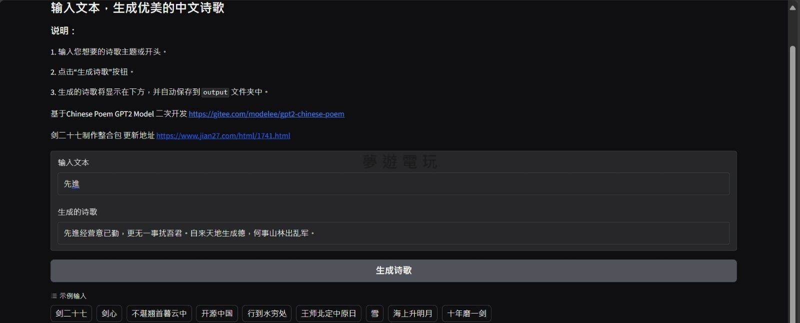 正文摘要:Chinese-poem 一鍵啟動版本v1.0介紹 版本:v1.0 更新日期:2024-06-18 語言:中文(簡體、繁體) 檔案大小:約1.2GB 探索AI與古典詩歌的完美融合!這款Chinese-poem工具能夠根據你隨意輸入的詞語,自動幫你接續後面的句子,讓創作變得輕鬆又有趣。 使用心得與注意事項 - 本工具支援簡體與繁體中文,適合多種文字輸入需求。 - 檔案較大,建議使用穩定網路環境下載。 - 若遇到下載問題,可嘗試更換瀏覽器或等待備份連結釋出。 歡迎大家分享使用心得,一起感受AI與古典詩歌的魅力! 👉 GM後台版 遊戲 推薦 ⬇️⬇️⬇️ 快速玩各種二次元動漫手遊app |