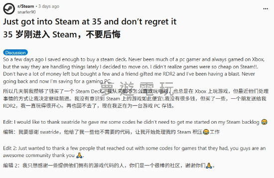 正文摘要:Xbox掰掰!35歲玩家的Steam真香體驗 Reddit論壇最近出現了一位有趣的玩家分享,ID為snarfer90的他,是一位35歲的大叔,原本是Xbox的死忠粉絲,遊戲都在主機上玩得不亦樂乎。但最近他實在受不了Xbox的一些操作,決定跳槽到PC遊戲的懷抱。 從此死忠Steam!怒攢錢組裝電競主機 這位玩家在文章中霸氣宣告,他「再也不回頭了!」而且現在正努力存錢,準備組裝一台高檔的電競主機,徹底投入PC遊戲的世界。看來,Xbox這次真的失去了一位忠實顧客,而Steam則多了一位熱情的新粉絲! 以下廣告滑動後還有帖子內容var custom_call_MIR = function (params) {if ( params === null || params.hasAd === false ) {var divRowSide;for (let index = 0; index < ONEADs.length; index++) {if (ONEADs[index].pub.player_mode === "mobile-inread") {divRowSide = ONEADs[index].pub.slotobj;}}var ins = document.createElement('ins');ins.className = 'clickforceads';ins.setAttribute('style', 'display:inline-block;');ins.setAttribute('data-ad-zone', '18264');divRowSide.appendChild(ins);var js = document.createElement('script');js.async = true;js.type = 'text/javascript';js.setAttribute('src', '//cdn.holmesmind.com/js/init.js');js.onload = function(){console.log('[ONEAD MIR] ClickForce Loaded');};divRowSide.appendChild(js);}};var _ONEAD = {};_ONEAD.pub = {};_ONEAD.pub.slotobj = document.getElementById("oneadMIRDFPTag");_ONEAD.pub.slots = ["div-onead-ad"];_ONEAD.pub.uid = "1000509";_ONEAD.pub.external_url = "https://onead.onevision.com.tw/";_ONEAD.pub.scopes = ["spotbuy", "speed"];_ONEAD.pub.player_mode_div = "div-onead-ad";_ONEAD.pub.player_mode = "mobile-inread";_ONEAD.pub.queryAdCallback = custom_call_MIR;var ONEAD_pubs = ONEAD_pubs || [];ONEAD_pubs.push(_ONEAD);var truvidScript = document.createElement('script'); truvidScript.async = true; truvidScript.setAttribute('data-cfasync','false'); truvidScript.type = 'text/javascript'; truvidScript.src = '//stg.truvidplayer.com/index.php?sub_user_id=597&widget_id=3309&playlist_id=2381&m=a&cb=' + (Math.random() * 10000000000000000); var currentScript = document.currentScript || document.scripts[document.scripts.length - 1]; currentScript.parentNode.insertBefore(truvidScript, currentScript.nextSibling); 常見問題Q&A Q: 這位玩家為什麼會想從Xbox轉到Steam? A: 他表示因為「最近Xbox處理事情的方式」讓他不滿意,所以決定轉換平台。 Q: 他轉換平台的第一步是什麼? A: 他存錢買了一台SteamDeck。 Q: 他對Steam的第一印象是什麼? A: 他驚訝於Steam上的遊戲價格非常便宜。 Q: 他現在的目標是什麼? A: 他正在存錢組裝一台遊戲PC。 Q: 這位玩家還會回到Xbox平台嗎? A: 他在文章中明確表示「再也不回去了」。 👉 GM後台版 遊戲 推薦 ⬇️⬇️⬇️ 快速玩各種二次元動漫手遊app |