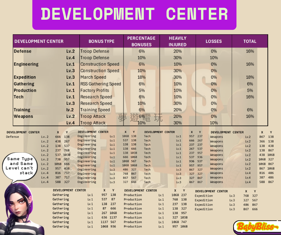 正文摘要:佔領發展中心即可獲得聯盟成員獎勵。 同類型、同等級的發展中心獎勵不可疊加。 你的監視站/聯盟領地必須接觸發展中心。 開發中心效果與座標 這張圖表詳細列出了《可獄不可囚》中不同類型與等級的「開發中心」所提供的加成效果、相關影響以及它們在地圖上的座標。 👉 GM後台版 遊戲 推薦 ⬇️⬇️⬇️ 快速玩各種二次元動漫手遊app 開發中心效果總覽表: 開發中心等級加成類型加成%重傷率損失率總計影響防禦 (Defense)Lv.2部隊防禦6%20%0%16%防禦 (Defense)Lv.4部隊防禦10%30%10% 工程 (Engineering)Lv.1建造速度6%10%0%16%工程 (Engineering)Lv.3建造速度10%30%0% 遠征 (Expedition)Lv.3行軍速度18%30%0%18%採集 (Gathering)Lv.1資源採集速度6%10%0%6%生產 (Production)Lv.1工廠利潤5%10%0%5%科技 (Tech)Lv.1研究速度6%10%0%16%科技 (Tech)Lv.3研究速度10%30%0% 訓練 (Training)Lv.2訓練速度6%20%0%6%武器 (Weapons)Lv.2部隊攻擊6%20%0%16%武器 (Weapons)Lv.4部隊攻擊10%30%10% 註:總計影響欄位在原圖部分等級未標示數值。重傷率與損失率可能與佔領或防守失敗時的部隊狀況有關。 重要規則: 同類型且同等級的開發中心效果無法疊加。 (Same Type and Same Level can't stack) - 這表示如果你佔領了兩個 Lv.2 的防禦中心,你只會獲得一次 Lv.2 的加成效果。 開發中心座標列表 (X, Y): 防禦 (Defense) Lv.2: (666, 138), (438, 267), (138, 537), (237, 768), (537, 1038), (738, 957), (1068, 666), (957, 438) Lv.4: (816, 717), (387, 717), (588, 327) 工程 (Engineering) Lv.1: (1068, 138), (537, 138), (138, 138), (138, 666), (138, 1038), (666, 1068), (1068, 567), (1068, 1068) Lv.3: (486, 327), (768, 867), (867, 567), (327, 666) 科技 (Tech) Lv.1: (957, 237), (666, 267), (237, 237), (267, 537), (237, 957), (537, 936), (936, 537), (957, 957) Lv.3: (867, 327), (327, 327), (327, 867), (867, 867) 武器 (Weapons) Lv.2: (867, 138), (366, 138), (138, 438), (138, 867), (438, 1068), (1068, 327), (1068, 867), (867, 1068) Lv.4: (816, 486), (387, 486), (588, 867) 採集 (Gathering) Lv.1: (957, 138), (537, 87), (138, 237), (87, 666), (267, 1068), (636, 1137), (1137, 567), (1068, 936) 生產 (Production) Lv.1: (1068, 237), (768, 138), (237, 138), (138, 327), (138, 957), (327, 1038), (1068, 747), (957, 1068) 遠征 (Expedition) Lv.3: (768, 327), (327, 567), (486, 867), (867, 666) 希望這份整理好的表格和資訊對您有幫助! |