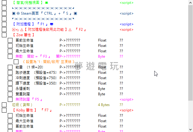 正文摘要:《鋼鐵之種》Cheat Engine腳本使用教學 - 完整遊戲解鎖指南與功能詳解 《鋼鐵之種》遊戲介紹 《鋼鐵之種》(Steel Seed)是一款備受期待的動作冒險遊戲,本教學將為大家帶來RUNE版本(1.0.4)的Cheat Engine腳本使用方法,幫助玩家在遊戲中獲得更多樂趣。無論您是新手還是老玩家,這篇教學都能幫助您輕鬆掌握遊戲中的各種功能。 必備工具下載 1. 《Cheat Engine》V7.6 中文化版記憶體解鎖工具: 下載連結 2. 《鋼鐵之種》遊戲本體: STEAM商店頁面 3. 《鋼鐵之種》CE腳本檔案: 下載連結 (SteelSeedv1_ZH.CT) 腳本使用步驟詳解 1. 首先下載並安裝Cheat Engine 7.6中文版 2. 下載SteelSeedv1_ZH.CT腳本檔案 3. 啟動《鋼鐵之種》遊戲 4. 開啟Cheat Engine,並載入下載好的CT腳本檔案 5. 按下『F1』鍵附加遊戲進程 6. 按下『F2』鍵啟用基礎功能 腳本功能詳細說明 本腳本提供多種實用功能,以下是主要功能列表: 基礎功能: - 【附加進程】- 按『F1』鍵啟動 - 【啟用基礎功能】- 附加進程後按『F2』鍵啟用 角色能力增強: - 永遠衝刺 - 設置為"1"並凍結即可啟用 - 無敵模式 - 按『F3』開啟,按『CTRL+F3』關閉 - 無限跳躍 - 按『F5』啟用 - 雙重跳躍 - 可自行啟用 數值修改: - 當前生命值/最大生命值 - 可自訂數值 - 當前子彈數/最大子彈數 - 可自訂數值 - 能量值修改 (1條=20單位) - 垃圾(遊戲貨幣)數量修改 移動速度調整: - 跑步速度 (預設值=475) - 衝刺速度 (預設值=750) - 蹲下速度 (預設值=350) - 飛行速度 (預設值=600) 角色狀態: - 【Koby屬性】- 按『F7』查看/修改 - 【Zoe屬性】- 可查看/修改 以下廣告滑動後還有帖子內容var custom_call_MIR = function (params) {if ( params === null || params.hasAd === false ) {var divRowSide;for (let index = 0; index < ONEADs.length; index++) {if (ONEADs[index].pub.player_mode === "mobile-inread") {divRowSide = ONEADs[index].pub.slotobj;}}var ins = document.createElement('ins');ins.className = 'clickforceads';ins.setAttribute('style', 'display:inline-block;');ins.setAttribute('data-ad-zone', '18264');divRowSide.appendChild(ins);var js = document.createElement('script');js.async = true;js.type = 'text/javascript';js.setAttribute('src', '//cdn.holmesmind.com/js/init.js');js.onload = function(){console.log('[ONEAD MIR] ClickForce Loaded');};divRowSide.appendChild(js);}};var _ONEAD = {};_ONEAD.pub = {};_ONEAD.pub.slotobj = document.getElementById("oneadMIRDFPTag");_ONEAD.pub.slots = ["div-onead-ad"];_ONEAD.pub.uid = "1000509";_ONEAD.pub.external_url = "https://onead.onevision.com.tw/";_ONEAD.pub.scopes = ["spotbuy", "speed"];_ONEAD.pub.player_mode_div = "div-onead-ad";_ONEAD.pub.player_mode = "mobile-inread";_ONEAD.pub.queryAdCallback = custom_call_MIR;var ONEAD_pubs = ONEAD_pubs || [];ONEAD_pubs.push(_ONEAD);var truvidScript = document.createElement('script'); truvidScript.async = true; truvidScript.setAttribute('data-cfasync','false'); truvidScript.type = 'text/javascript'; truvidScript.src = '//stg.truvidplayer.com/index.php?sub_user_id=597&widget_id=3309&playlist_id=2381&m=a&cb=' + (Math.random() * 10000000000000000); var currentScript = document.currentScript || document.scripts[document.scripts.length - 1]; currentScript.parentNode.insertBefore(truvidScript, currentScript.nextSibling); 常見問題解答 Q1: 為什麼我按F1後沒有反應? A1: 請確保遊戲已經啟動,並且使用的是RUNE版本(1.0.4)。如果問題仍然存在,請嘗試以管理員身份運行Cheat Engine。 Q2: 使用無敵功能後遊戲崩潰怎麼辦? A2: 部分功能可能與遊戲版本不完全相容,建議先儲存遊戲進度再使用功能,或避免同時開啟多個修改選項。 Q3: 如何正確設置數值並凍結? A3: 在需要修改的數值欄位中輸入想要的數值,然後勾選左側的方框進行凍結。數值凍結後將不會因遊戲中的變化而改變。 Q4: 腳本可以用於多人遊戲模式嗎? A4: 不建議在多人遊戲或線上模式中使用此腳本,可能會導致帳號被封禁或其他不良後果。 Q5: 如何恢復遊戲原始設置? A5: 取消所有已勾選的功能,重新啟動遊戲即可恢復原始設置。對於某些功能,可能需要使用特定的快捷鍵關閉,如無敵模式需按『CTRL+F3』關閉。 使用小技巧 1. 建議先熟悉遊戲原始玩法,再使用腳本增強體驗 2. 不同功能組合可能產生意想不到的效果,可以自行嘗試 3. 使用『CTRL+S』可快速打開Steam頁面 4. 使用簡潔/完整視圖切換功能可以更方便地管理腳本界面 本教學適用於RUNE版本(1.0.4),其他版本可能需要更新腳本才能正常使用。希望這份教學能幫助各位玩家更好地體驗《鋼鐵之種》的遊戲樂趣! 👉 GM後台版 遊戲 推薦 ⬇️⬇️⬇️ 快速玩各種二次元動漫手遊app |