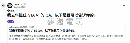 正文摘要:前R星測試員爆料《GTA6》:罪惡都市、發售窗口與超真實NPC互動! 各位《GTA》系列的死忠粉絲們,準備好迎接《GTA6》了嗎?最近Reddit論壇上出現了一位自稱是前R星品質測試員的玩家,ID是@OddRun9389,他聲稱自己參與過《GTA6》的開發工作,並透露了許多關於這款備受期待大作的內幕消息!雖然他已於2024年中離職,但待的時間夠久,足以了解不少情報。 以下廣告滑動後還有帖子內容var custom_call_MIR = function (params) {if ( params === null || params.hasAd === false ) {var divRowSide;for (let index = 0; index < ONEADs.length; index++) {if (ONEADs[index].pub.player_mode === "mobile-inread") {divRowSide = ONEADs[index].pub.slotobj;}}var ins = document.createElement('ins');ins.className = 'clickforceads';ins.setAttribute('style', 'display:inline-block;');ins.setAttribute('data-ad-zone', '18264');divRowSide.appendChild(ins);var js = document.createElement('script');js.async = true;js.type = 'text/javascript';js.setAttribute('src', '//cdn.holmesmind.com/js/init.js');js.onload = function(){console.log('[ONEAD MIR] ClickForce Loaded');};divRowSide.appendChild(js);}};var _ONEAD = {};_ONEAD.pub = {};_ONEAD.pub.slotobj = document.getElementById("oneadMIRDFPTag");_ONEAD.pub.slots = ["div-onead-ad"];_ONEAD.pub.uid = "1000509";_ONEAD.pub.external_url = "https://onead.onevision.com.tw/";_ONEAD.pub.scopes = ["spotbuy", "speed"];_ONEAD.pub.player_mode_div = "div-onead-ad";_ONEAD.pub.player_mode = "mobile-inread";_ONEAD.pub.queryAdCallback = custom_call_MIR;var ONEAD_pubs = ONEAD_pubs || [];ONEAD_pubs.push(_ONEAD);var truvidScript = document.createElement('script'); truvidScript.async = true; truvidScript.setAttribute('data-cfasync','false'); truvidScript.type = 'text/javascript'; truvidScript.src = '//stg.truvidplayer.com/index.php?sub_user_id=597&widget_id=3309&playlist_id=2381&m=a&cb=' + (Math.random() * 10000000000000000); var currentScript = document.currentScript || document.scripts[document.scripts.length - 1]; currentScript.parentNode.insertBefore(truvidScript, currentScript.nextSibling); 常見問題Q&A - 《GTA6》的主舞台在哪裡? 罪惡都市(Vice City)。 - 《GTA6》的鄉村區域有什麼特色? 充滿佛羅里達鄉下+詭異沼澤邪教的氛圍。 - 《GTA6》的NPC記憶系統有什麼特別之處? NPC會記住玩家的行為,並做出相應的反應。 - 《GTA6》的發售窗口大約在什麼時候? 9月到11月之間。 - 《GTA6》的故事模式和線上模式會同時發布嗎? 故事模式會先發布,線上模式可能會延後6到10週上線。 👉 GM後台版 遊戲 推薦 ⬇️⬇️⬇️ 快速玩各種二次元動漫手遊app |