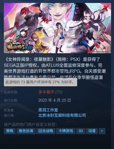 正文摘要:《女神異聞錄:夜幕魅影》(P5X)終於登上 Steam 平台啦!各位怪盜團的粉絲們是不是摩拳擦掌,準備再次潛入異世界,奪取惡人的心呢?然而,這次的 Steam 之旅似乎不太順利,玩家們的評價可說是褒貶不一,甚至出現了「多半差評」的窘境。究竟發生了什麼事?讓我們一起來看看吧! 官方尚未回應,未來走向如何? 目前,官方尚未對 Steam 版《P5X》的相關問題做出正式回應。究竟官方會如何處理這些問題,以及未來是否會推出改善方案,還有待觀察。如果你是《女神異聞錄》系列的粉絲,並且正在考慮是否要入手 Steam 版的《P5X》,建議可以先觀望一下,看看官方是否會針對這些問題進行修正。 以下廣告滑動後還有帖子內容var custom_call_MIR = function (params) {if ( params === null || params.hasAd === false ) {var divRowSide;for (let index = 0; index < ONEADs.length; index++) {if (ONEADs[index].pub.player_mode === "mobile-inread") {divRowSide = ONEADs[index].pub.slotobj;}}var ins = document.createElement('ins');ins.className = 'clickforceads';ins.setAttribute('style', 'display:inline-block;');ins.setAttribute('data-ad-zone', '18264');divRowSide.appendChild(ins);var js = document.createElement('script');js.async = true;js.type = 'text/javascript';js.setAttribute('src', '//cdn.holmesmind.com/js/init.js');js.onload = function(){console.log('[ONEAD MIR] ClickForce Loaded');};divRowSide.appendChild(js);}};var _ONEAD = {};_ONEAD.pub = {};_ONEAD.pub.slotobj = document.getElementById("oneadMIRDFPTag");_ONEAD.pub.slots = ["div-onead-ad"];_ONEAD.pub.uid = "1000509";_ONEAD.pub.external_url = "https://onead.onevision.com.tw/";_ONEAD.pub.scopes = ["spotbuy", "speed"];_ONEAD.pub.player_mode_div = "div-onead-ad";_ONEAD.pub.player_mode = "mobile-inread";_ONEAD.pub.queryAdCallback = custom_call_MIR;var ONEAD_pubs = ONEAD_pubs || [];ONEAD_pubs.push(_ONEAD);var truvidScript = document.createElement('script'); truvidScript.async = true; truvidScript.setAttribute('data-cfasync','false'); truvidScript.type = 'text/javascript'; truvidScript.src = '//stg.truvidplayer.com/index.php?sub_user_id=597&widget_id=3309&playlist_id=2381&m=a&cb=' + (Math.random() * 10000000000000000); var currentScript = document.currentScript || document.scripts[document.scripts.length - 1]; currentScript.parentNode.insertBefore(truvidScript, currentScript.nextSibling); 常見問題 Q&A Q1:Steam 版《P5X》的伺服器資料與官服互通嗎? 不互通。這意味著你在官服上的進度無法轉移到 Steam 版上。 Q2:Steam 版《P5X》支援手把嗎? 目前手把支援存在問題,部分玩家可能會遇到無法正常操作或按鍵配置錯誤的情況。 Q3:Steam 版《P5X》的評價如何? 目前評價不佳,好評率僅有 27%,多數玩家給予差評。 Q4:官方有針對 Steam 版的問題做出回應嗎? 目前尚未有正式回應。 Q5:現在適合入手 Steam 版《P5X》嗎? 建議先觀望,等待官方釋出修正方案後再做決定。 👉 GM後台版 遊戲 推薦 ⬇️⬇️⬇️ 快速玩各種二次元動漫手遊app |