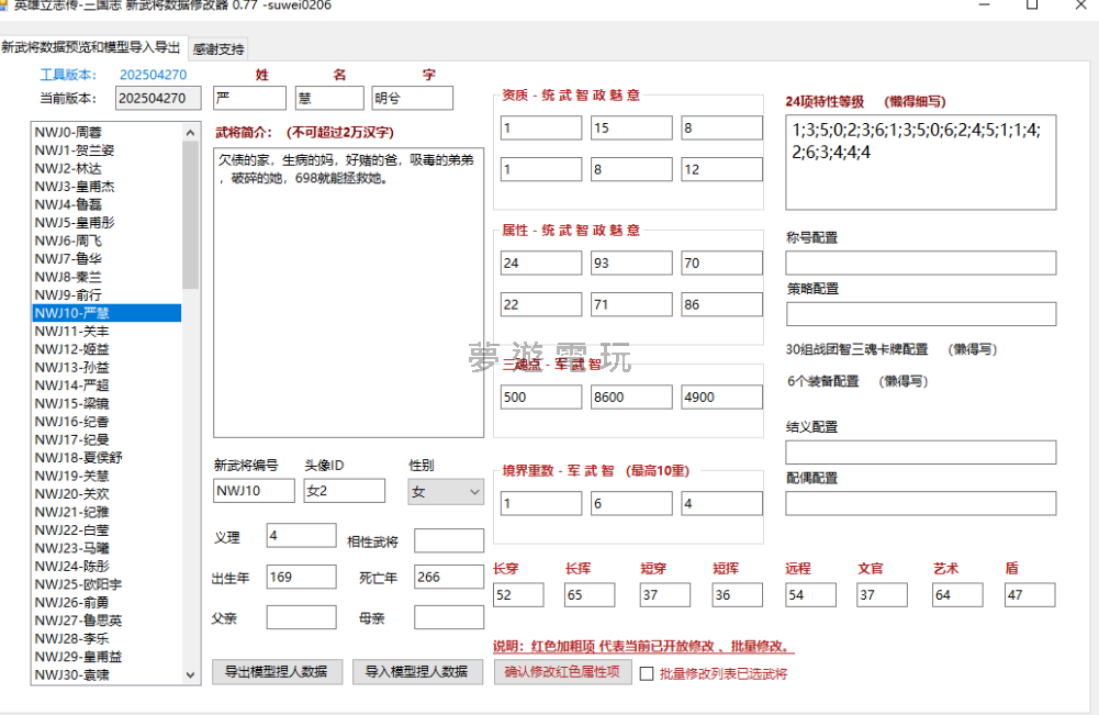 正文摘要:replyreload += ',' + 2384205; 功能特色 - 新武將數據批量修改功能 - 捏人數據導入導出(包含模型的臉部、身體等全部細節) - 武將屬性修改(已開放紅色數據批量修改) - 與遊戲版本0.78完全相容 - 操作簡單直觀,放置於遊戲目錄下運行即可 更新日誌 - 更新2:增加武將屬性修改,增加批量修改功能 - 修復1:兼容性修復,避免彈出報錯數據流外部 重要提醒 如果出現提示「讀取失敗:無法在流的結尾之外進行讀取」或其它失敗原因,請先進行以下操作: 1. 進入遊戲的新武將創建界面 2. 任意新建一個武將,並保存 3. 退出遊戲 4. 再打開修改器 這樣做的目的是將您的存檔結構更新到當前最新版本,確保修改器能夠正常讀取。 使用說明 1. 下載修改器壓縮檔 2. 解壓縮至遊戲目錄下 3. 關閉遊戲(重要!請在關閉遊戲的情況下替換數據,否則不生效) 4. 運行修改器程式 5. 選擇需要修改的武將數據 6. 進行捏人數據導入導出或屬性修改 7. 保存修改結果 8. 啟動遊戲,查看修改效果 下載連結 新武將編輯器-v0.78: 所有站內附件皆會附上安全掃描報告請會員查看純淨度百分比後判斷使用(adsbygoogle = window.adsbygoogle || []).push({});相關檔案須知:取得檔案前,請先詳細閱讀文章內容避免不必要錯誤與誤會發生。也可多參考文章討論樓層內容了解附件檔案相關討論資訊。 【此文章部分內容隱藏中】 解除隱藏說明教學點擊下方 繼續閱讀文章 後請仔細觀看文章內容 並依照指示進行下一步最後完成解除隱藏後系統會回到此文章自動顯示隱藏內容~繼續閱讀 常見問題解答 問:為什麼我的杀毒軟體提示有風險? 答:因為修改器涉及二進制修改操作,某些杀毒軟體可能會誤報為風險。這是正常現象,您可以放心點擊信任並使用。修改器不含任何惡意代碼,純粹為遊戲數據修改工具。 問:修改器支援哪些數據的修改? 答:目前修改器支援捏人數據(模型的臉部、身體等全部細節)的導入導出,以及武將屬性修改(已開放紅色數據批量修改)。不包含六維屬性以及技能等設置,這些功能將在後續版本中逐步開放。 問:修改後的數據會影響遊戲平衡性嗎? 答:是的,修改武將屬性可能會影響遊戲平衡。修改器提供了自由調整數據的能力,玩家可以根據個人喜好增強或降低武將能力。如果您注重遊戲原有的平衡性,建議適度使用修改功能。 問:為什麼修改後的數據沒有生效? 答:最常見的原因是在遊戲運行時進行了修改。請確保在關閉遊戲的情況下使用修改器,因為新武將數據是在啟動遊戲之後就會讀入內存。修改完成後再啟動遊戲,數據變更才會生效。 問:修改器會隨著遊戲版本更新嗎? 答:是的,作者承諾修改器將隨遊戲版本更新而更新,保持與最新版本的同步相容。當遊戲發布新版本時,可能需要等待修改器也更新到相應版本才能正常使用。建議關注作者發布的更新消息。 👉 GM後台版 遊戲 推薦 ⬇️⬇️⬇️ 快速玩各種二次元動漫手遊appreplyreload += ',' + 2384205; |