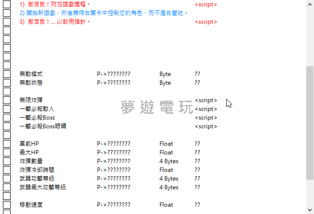 正文摘要:replyreload += ',' + 2384280; 所需工具 在使用本修改腳本前,您需要先下載安裝Cheat Engine工具: 《Cheat Engine》V7.6 中文化版超強記憶體解鎖工具:遊戲外掛製作神器! 下載連結 修改腳本下載 ButtKnight_ZH.ct 中文化修改腳本: 所有站內附件皆會附上安全掃描報告請會員查看純淨度百分比後判斷使用(adsbygoogle = window.adsbygoogle || []).push({});相關檔案須知:取得檔案前,請先詳細閱讀文章內容避免不必要錯誤與誤會發生。也可多參考文章討論樓層內容了解附件檔案相關討論資訊。 【此文章部分內容隱藏中】 解除隱藏說明教學點擊下方 繼續閱讀文章 後請仔細觀看文章內容 並依照指示進行下一步最後完成解除隱藏後系統會回到此文章自動顯示隱藏內容~繼續閱讀 使用方法 - 下載並安裝Cheat Engine 7.6中文版 - 下載ButtKnight_ZH.ct修改腳本 - 運行遊戲《ButtKnight》 - 開啟Cheat Engine,點擊左上角的電腦圖標,選擇ButtKnight遊戲進程 - 點擊「檔案」→「打開」,選擇下載好的ButtKnight_ZH.ct腳本 - 在腳本列表中勾選您需要的功能選項 - 回到遊戲即可享受修改帶來的樂趣 常見問題解答 問題1:為什麼我無法正常使用修改腳本? 答:請確保您使用的是Steam版本的《ButtKnight》,並且已經正確安裝Cheat Engine 7.6。同時,請以管理員身份運行Cheat Engine,以確保其擁有足夠的系統權限。 問題2:使用修改腳本會被遊戲官方封號嗎? 答:本修改腳本主要用於單機遊戲體驗,不涉及線上對戰,因此風險較低。但我們仍建議您在使用時謹慎,最好在離線模式下使用。 問題3:修改腳本支援哪些功能? 答:該腳本支援遊戲中的多種功能修改,具體內容請下載後查看腳本內的選項列表,包括但不限於角色屬性、資源等方面的調整。 問題4:我的遊戲版本更新了,腳本還能用嗎? 答:遊戲版本更新後,可能會導致腳本失效。建議您關注最新的腳本更新,或等待作者發布適配新版本的腳本。 問題5:Cheat Engine使用時出現防毒軟體警告怎麼辦? 答:Cheat Engine因其功能原理會被部分防毒軟體誤報為風險程式。建議您在使用前將Cheat Engine添加到防毒軟體的白名單中,或暫時關閉防毒軟體。 👉 GM後台版 遊戲 推薦 ⬇️⬇️⬇️ 快速玩各種二次元動漫手遊app replyreload += ',' + 2384280; |
