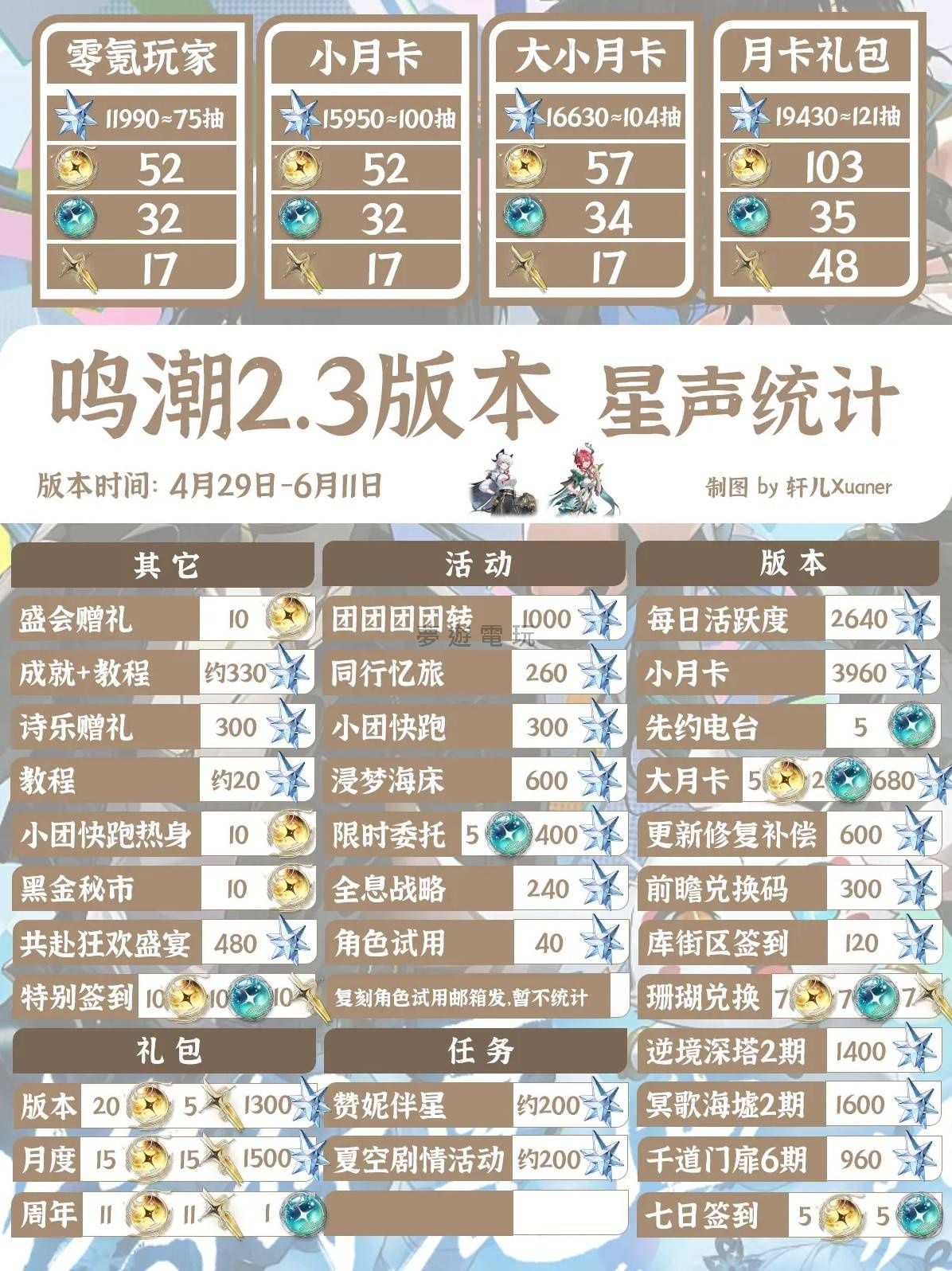 正文摘要:《鳴潮》2.3版本可獲取星聲統計 《鳴潮》2.3版本已經開放,許多玩家都想知道在這個版本中總共可以獲得多少星聲(抽)。以下整理了不同類型玩家在2.3版本中預計可以獲得的星聲及抽數統計。 👉 GM後台版 遊戲 推薦 ⬇️⬇️⬇️ 快速玩各種二次元動漫手遊app 不同玩家類型星聲獲取對比 玩家類型星聲數量約可抽數金球數量藍球數量鑄濤波紋數量零課玩家1199075523217小月卡玩家15950100523217大小月卡玩家16630104573417大小月卡+禮包玩家194301211033548以下廣告滑動後還有帖子內容var custom_call_MIR = function (params) {if ( params === null || params.hasAd === false ) {var divRowSide;for (let index = 0; index < ONEADs.length; index++) {if (ONEADs[index].pub.player_mode === "mobile-inread") {divRowSide = ONEADs[index].pub.slotobj;}}var ins = document.createElement('ins');ins.className = 'clickforceads';ins.setAttribute('style', 'display:inline-block;');ins.setAttribute('data-ad-zone', '18264');divRowSide.appendChild(ins);var js = document.createElement('script');js.async = true;js.type = 'text/javascript';js.setAttribute('src', '//cdn.holmesmind.com/js/init.js');js.onload = function(){console.log('[ONEAD MIR] ClickForce Loaded');};divRowSide.appendChild(js);}};var _ONEAD = {};_ONEAD.pub = {};_ONEAD.pub.slotobj = document.getElementById("oneadMIRDFPTag");_ONEAD.pub.slots = ["div-onead-ad"];_ONEAD.pub.uid = "1000509";_ONEAD.pub.external_url = "https://onead.onevision.com.tw/";_ONEAD.pub.scopes = ["spotbuy", "speed"];_ONEAD.pub.player_mode_div = "div-onead-ad";_ONEAD.pub.player_mode = "mobile-inread";_ONEAD.pub.queryAdCallback = custom_call_MIR;var ONEAD_pubs = ONEAD_pubs || [];ONEAD_pubs.push(_ONEAD);var truvidScript = document.createElement('script'); truvidScript.async = true; truvidScript.setAttribute('data-cfasync','false'); truvidScript.type = 'text/javascript'; truvidScript.src = '//stg.truvidplayer.com/index.php?sub_user_id=597&widget_id=3309&playlist_id=2381&m=a&cb=' + (Math.random() * 10000000000000000); var currentScript = document.currentScript || document.scripts[document.scripts.length - 1]; currentScript.parentNode.insertBefore(truvidScript, currentScript.nextSibling); 《鳴潮》2.3版本星聲獲取 常見問題Q&A Q1: 零課玩家在2.3版本大概能抽幾次? A1: 零課玩家在《鳴潮》2.3版本中,預計可以獲得約11990星聲,換算下來大約是75抽。 Q2: 如果有購買大小月卡,可以獲得多少抽? A2: 購買大小月卡的玩家,在2.3版本中預計可以獲得約16630星聲,換算下來大約是104抽。 Q3: 除了星聲,還能獲得哪些抽卡資源? A3: 除了星聲,根據不同的玩家類型,還會獲得金球、藍球以及鑄濤波紋等抽卡資源。金球主要用於限定角色或武器池,藍球用於常駐池,鑄濤波紋則用於特定池子。 Q4: 購買禮包對抽數影響大嗎? A4: 購買禮包會顯著增加可獲得的星聲和金球數量。例如,大小月卡加上禮包的玩家,總抽數可以達到約121抽,金球數量也會大幅增加。 Q5: 這些統計數據是確定的嗎? A5: 這些數據是根據遊戲內活動、任務、簽到等可預期來源進行的統計,實際獲得數量可能會因個人遊戲進度、參與活動情況等因素略有差異,但作為參考是相當有價值的。 |